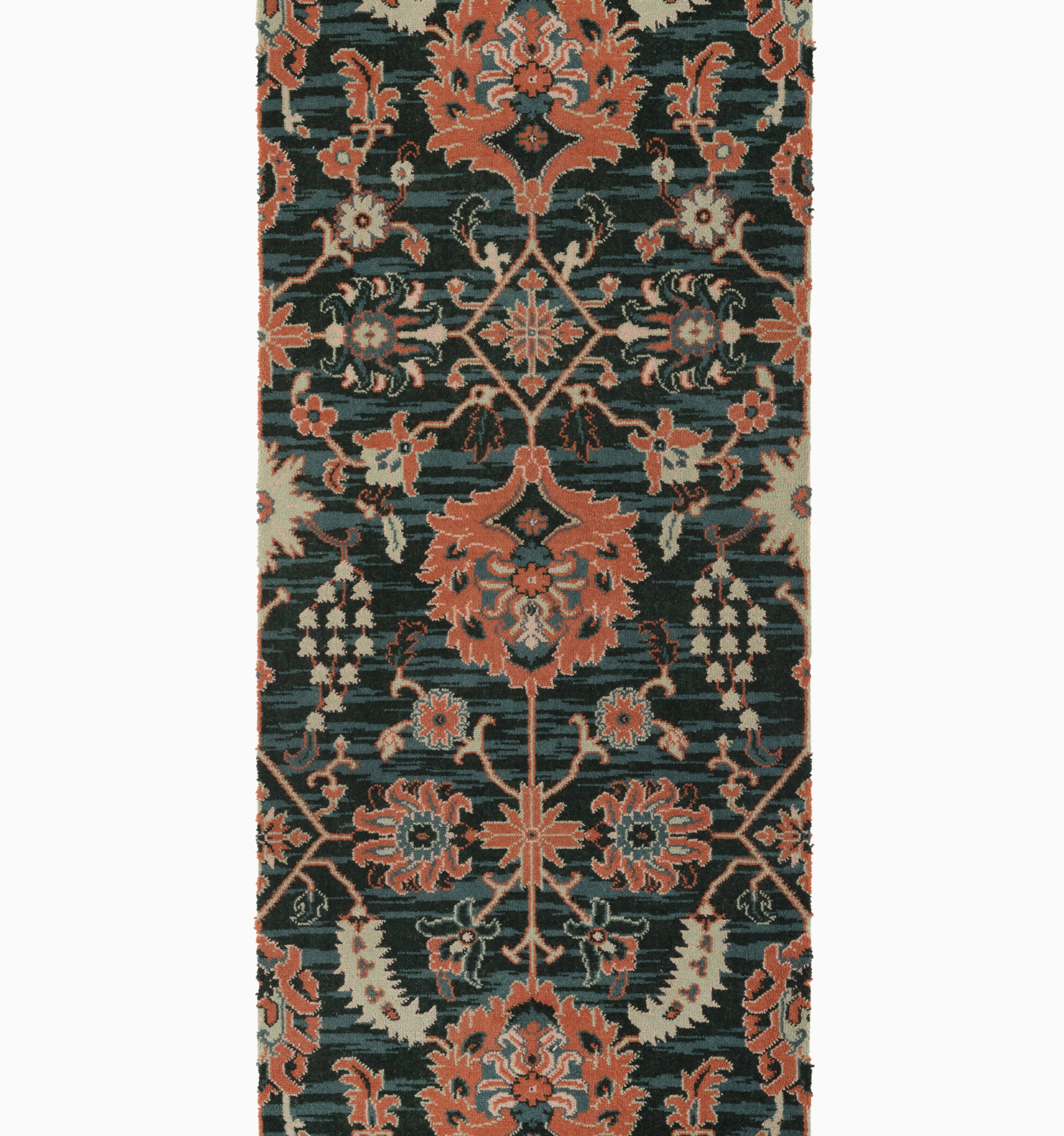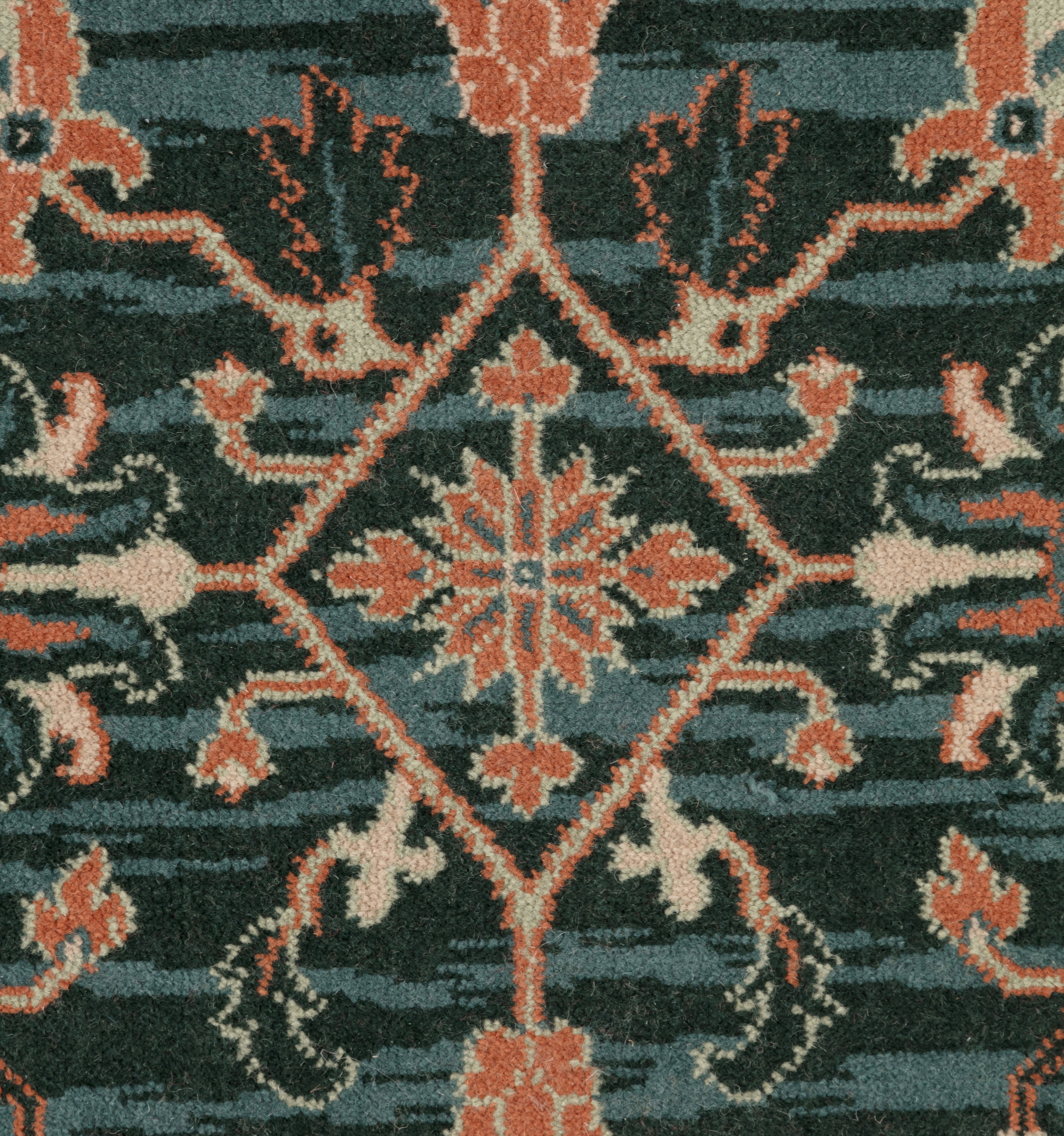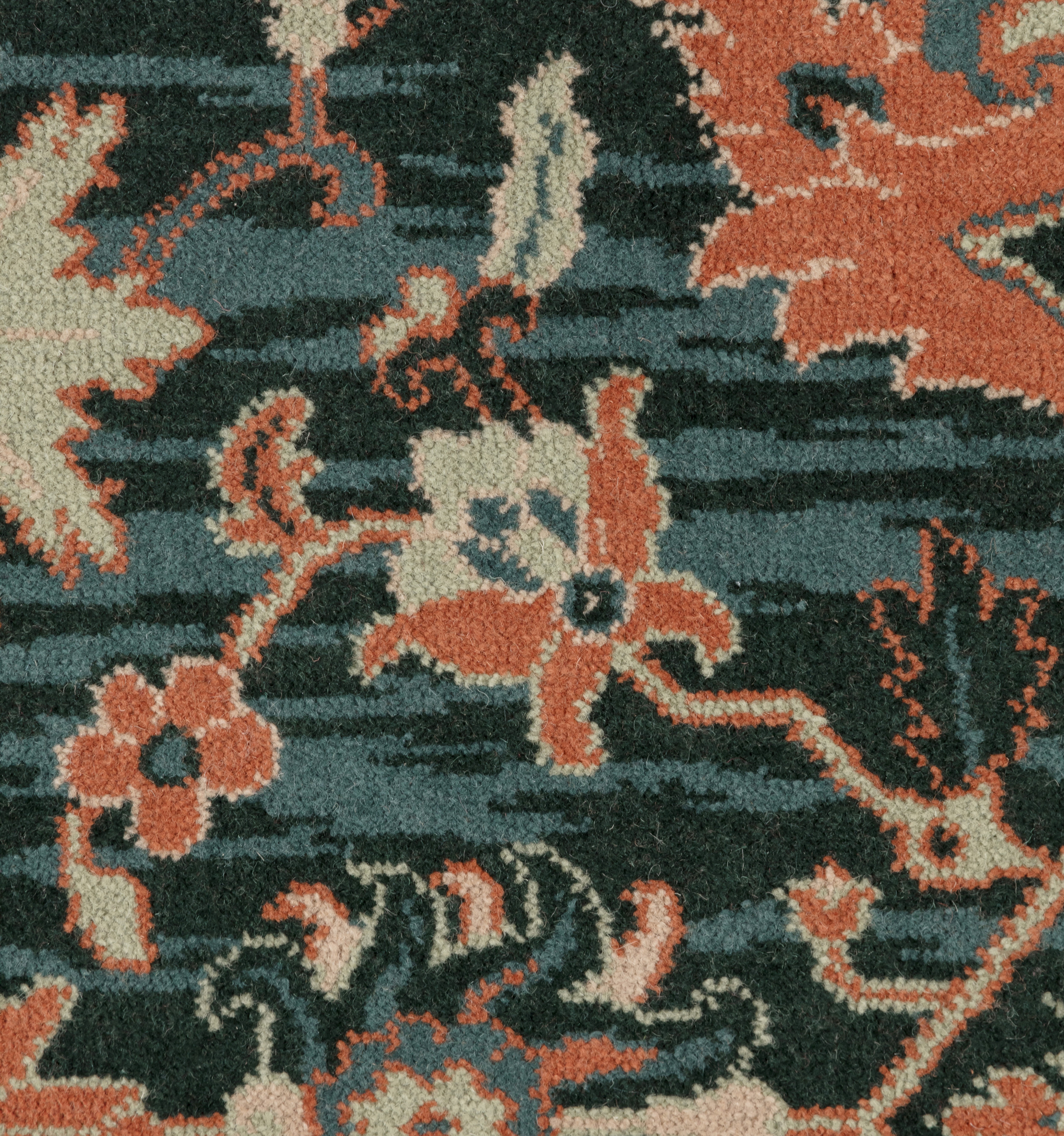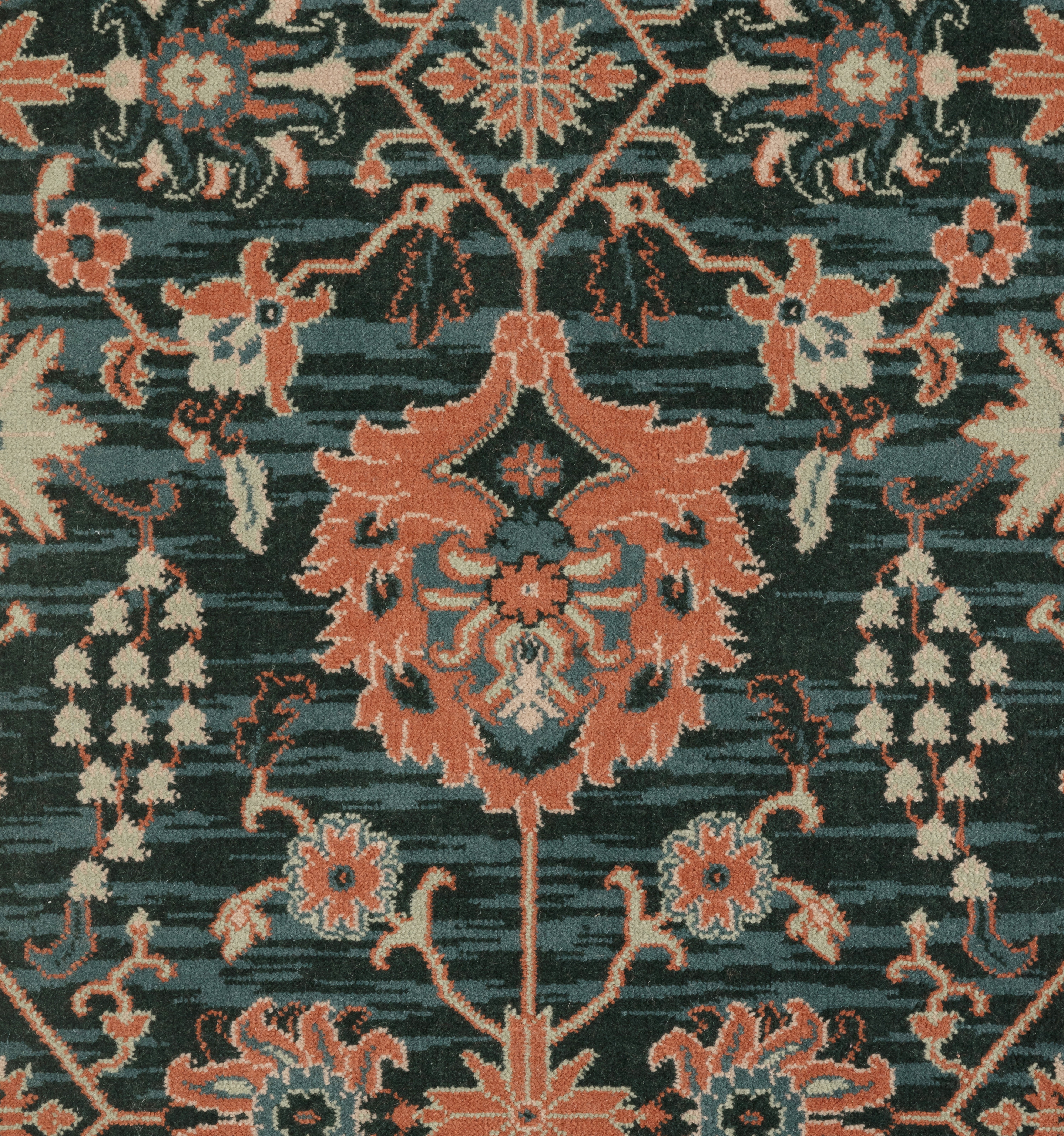 An adaptation of a Kashan rug with an Abrash background using colour variations to achieve a distinctive design of intricate details embedded in a large scale pattern.