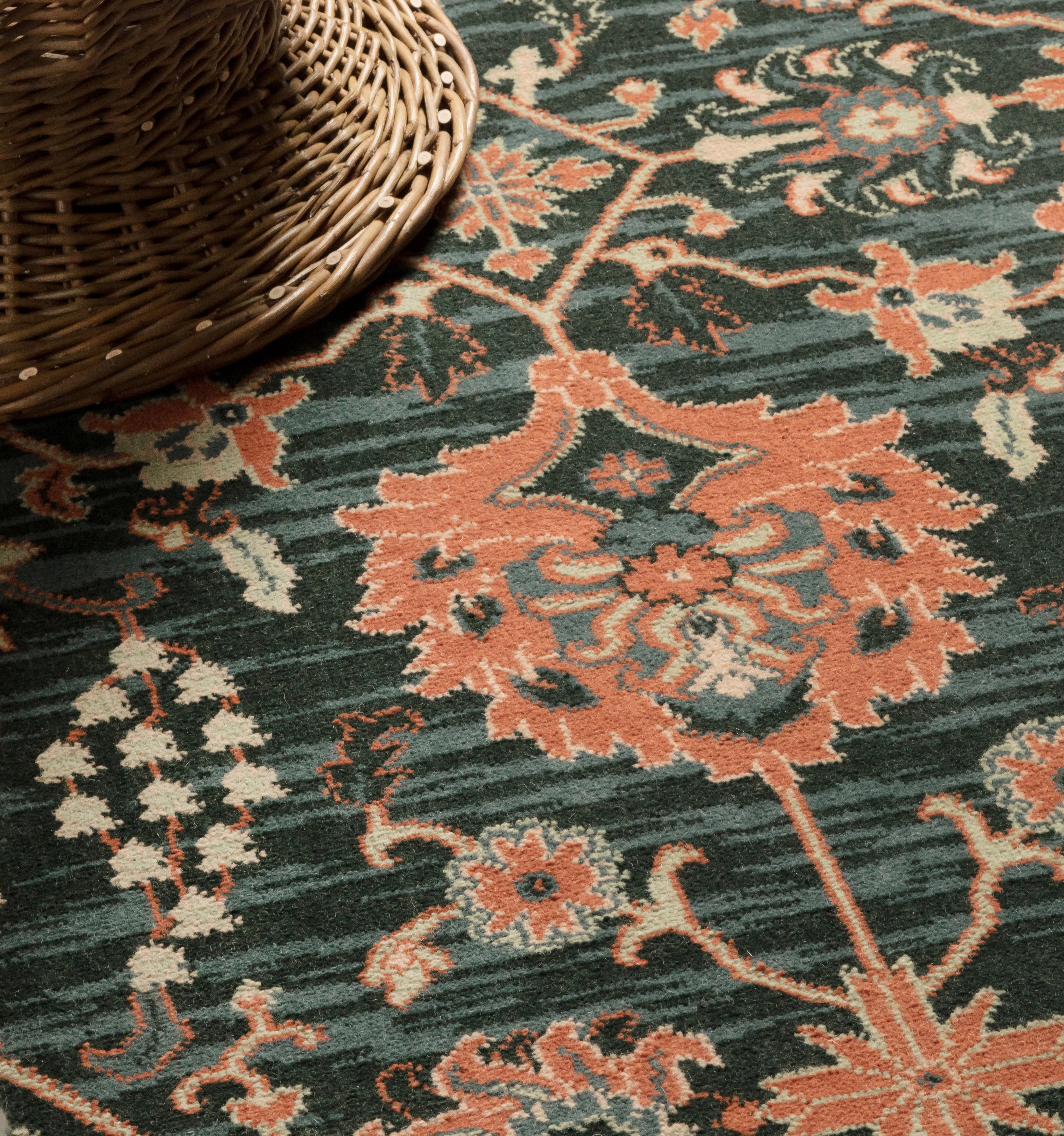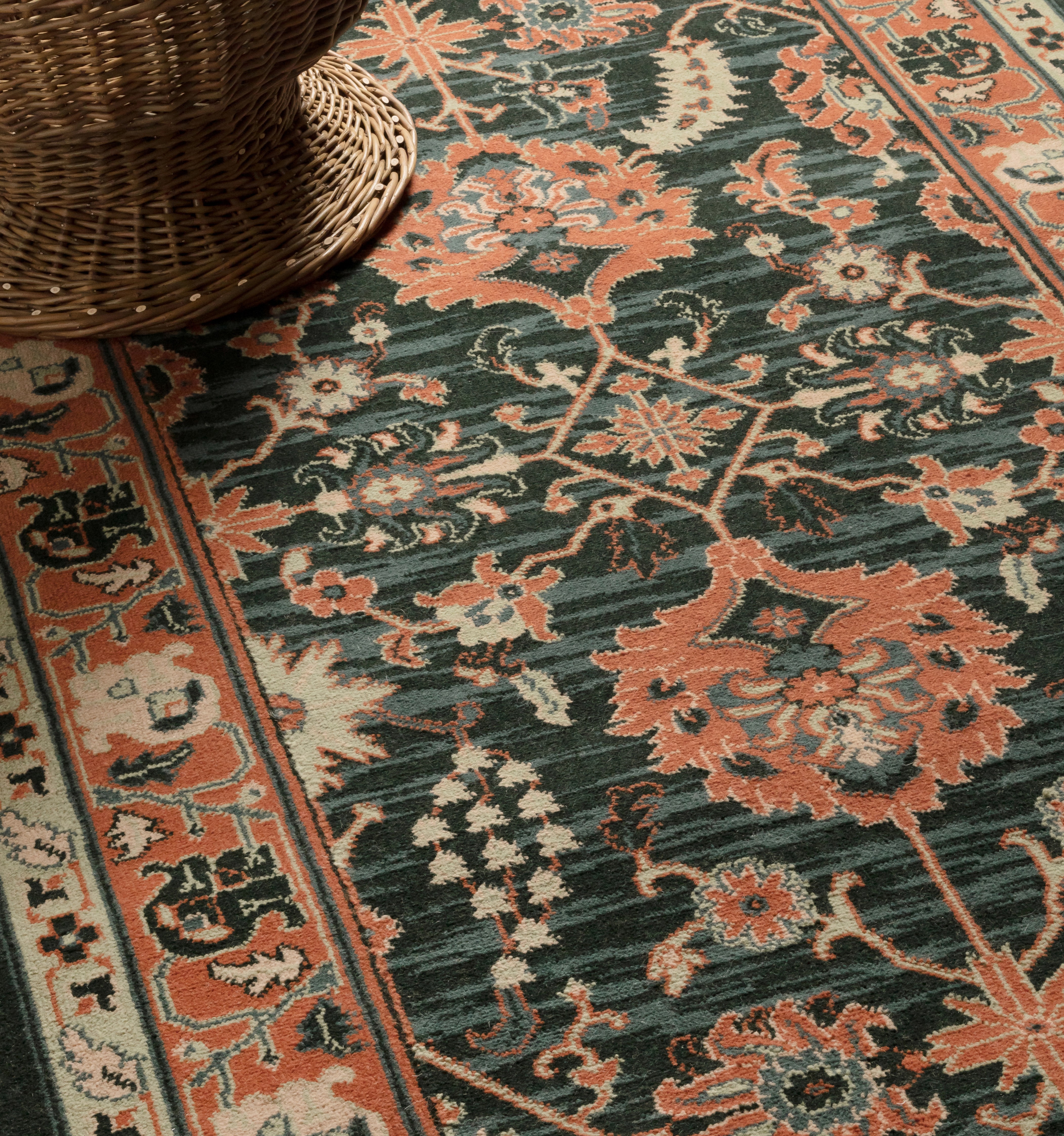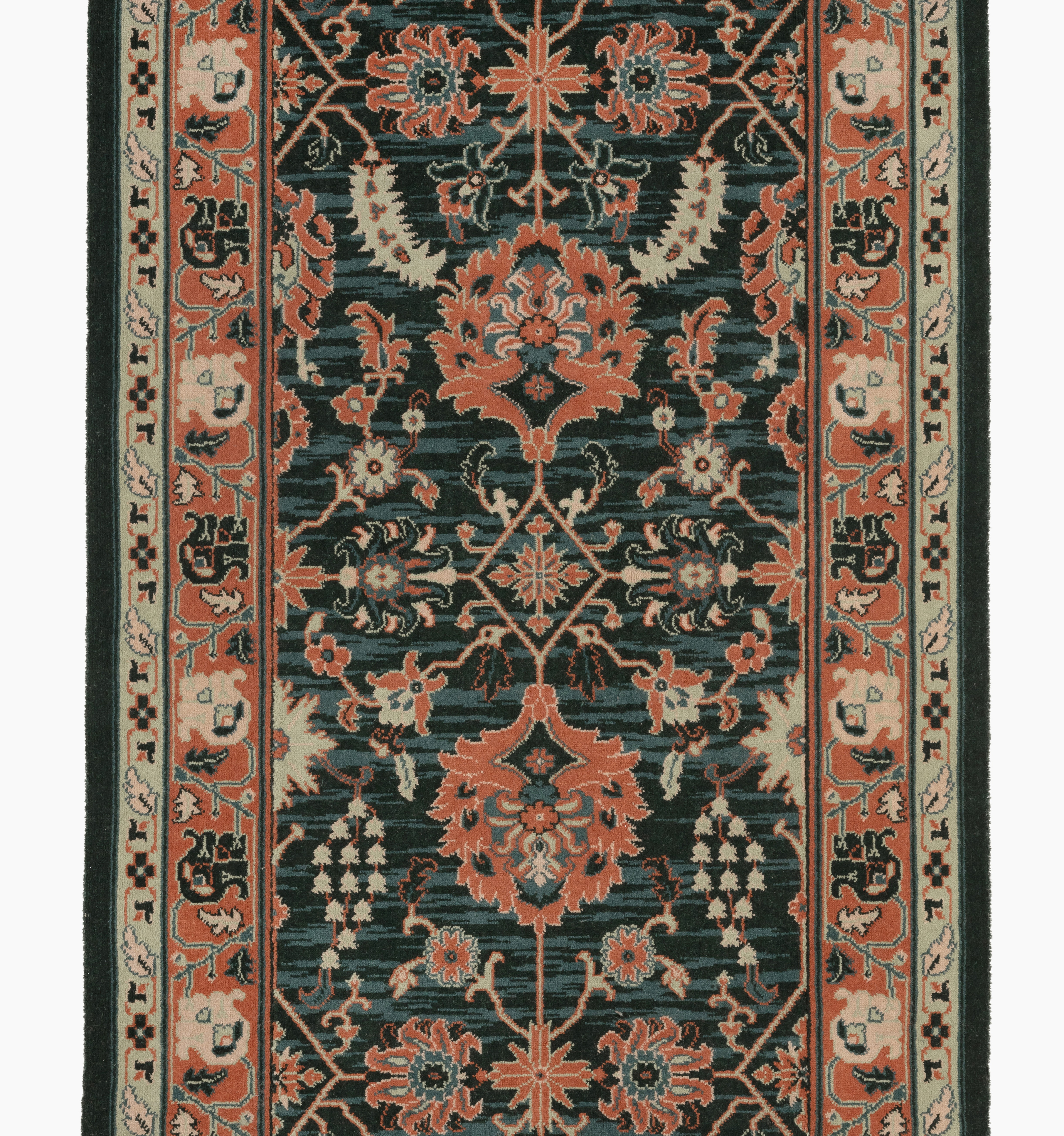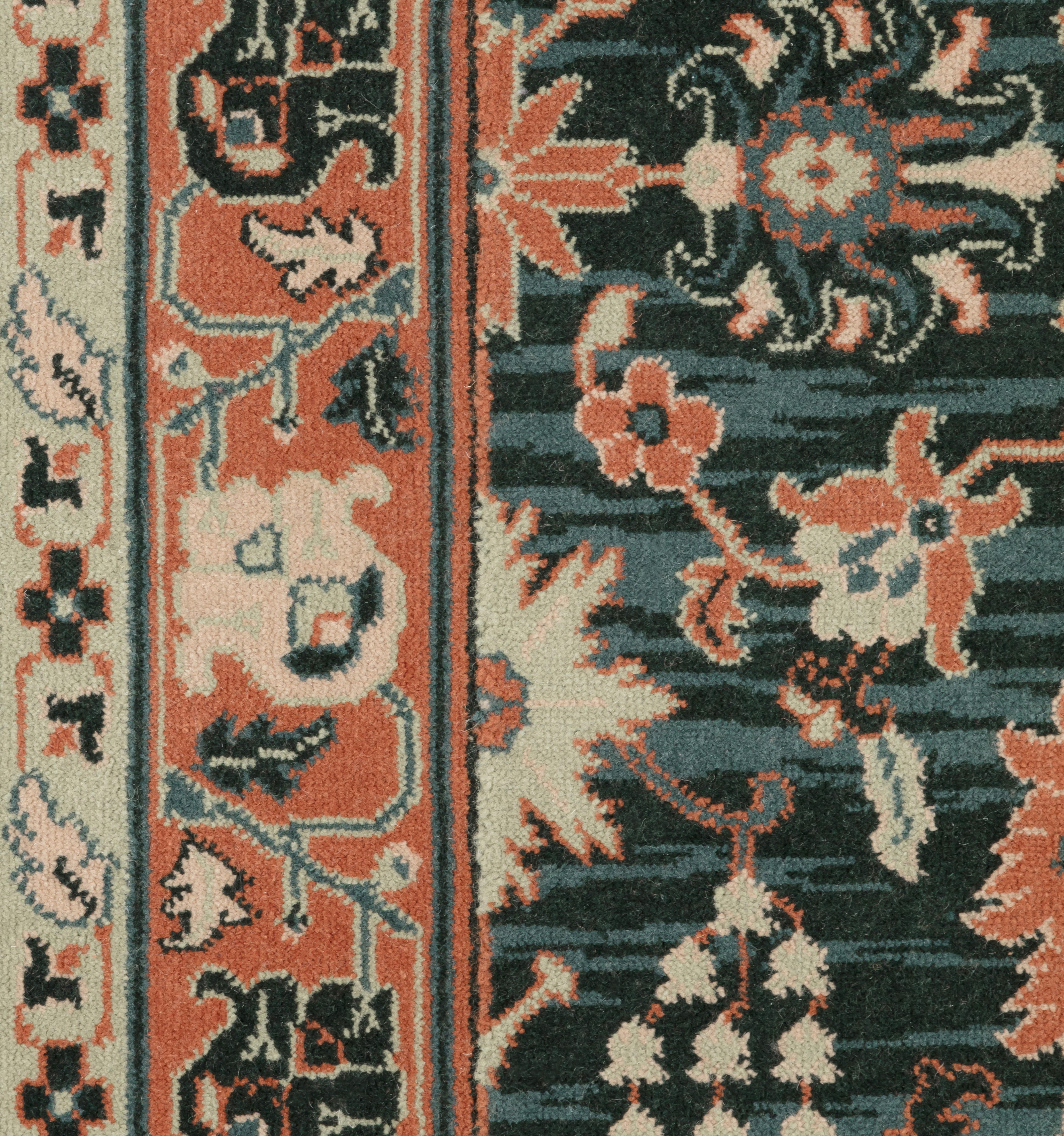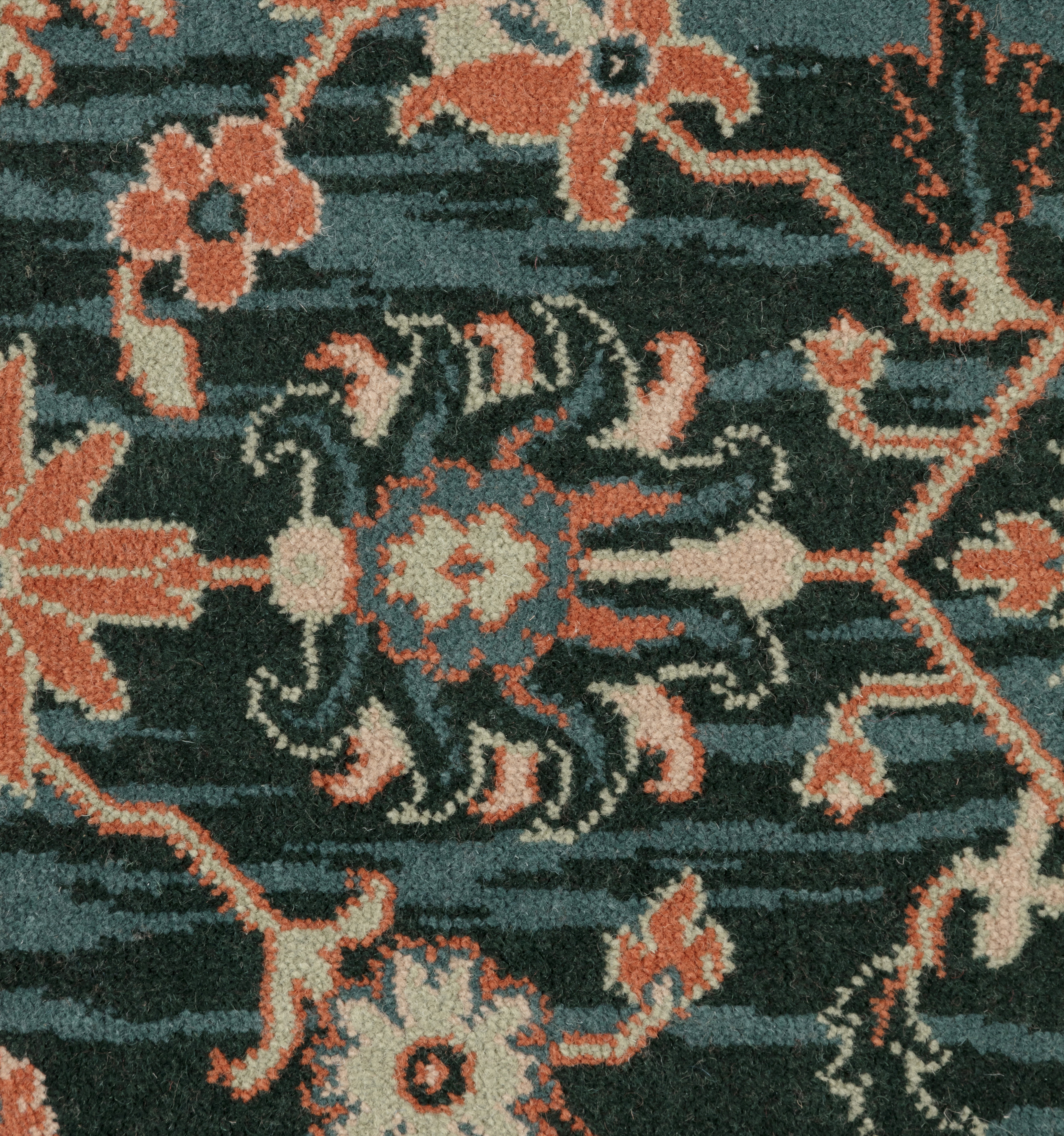 An adaptation of a Kashan rug with an Abrash background using colour variations to achieve a distinctive design of intricate details embedded in a large scale pattern.