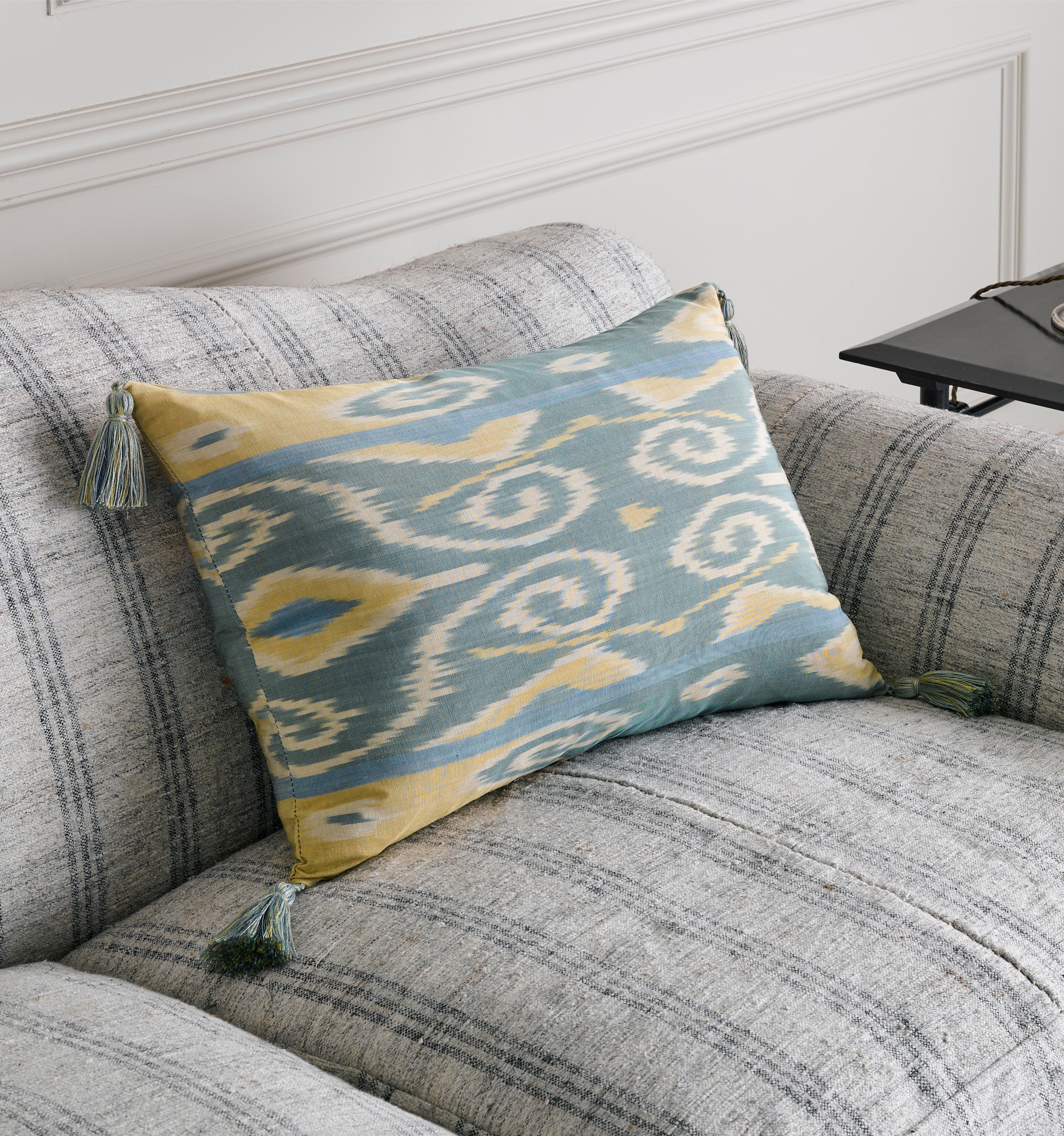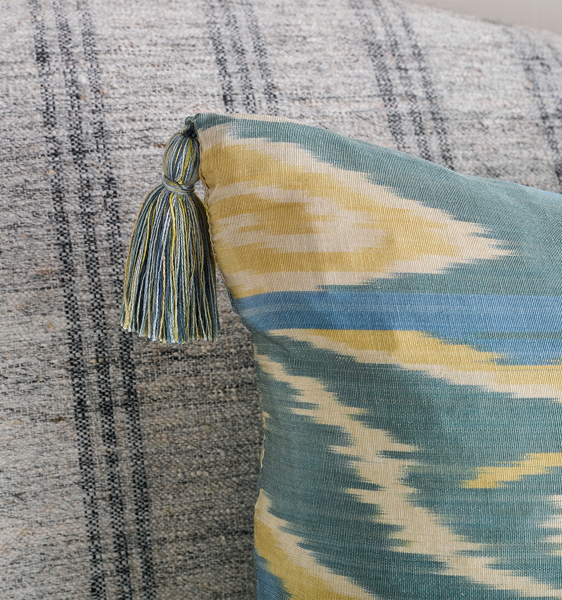 Ahal Ikat Fabric Cushion, with tassels. No piping, no zip. Kindly note the pattern placement may differ.