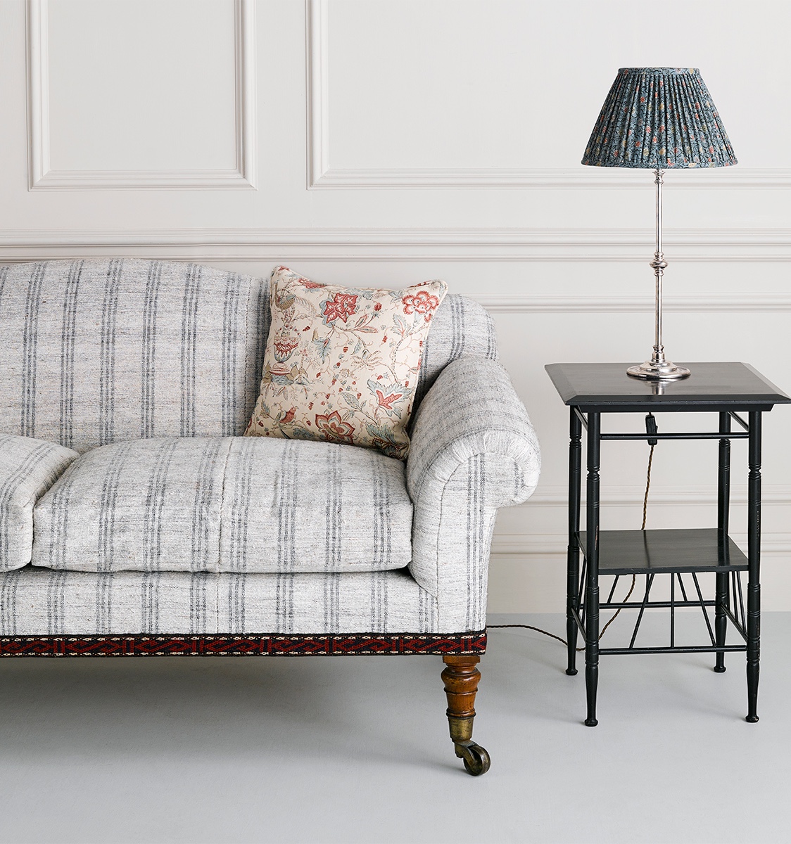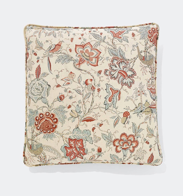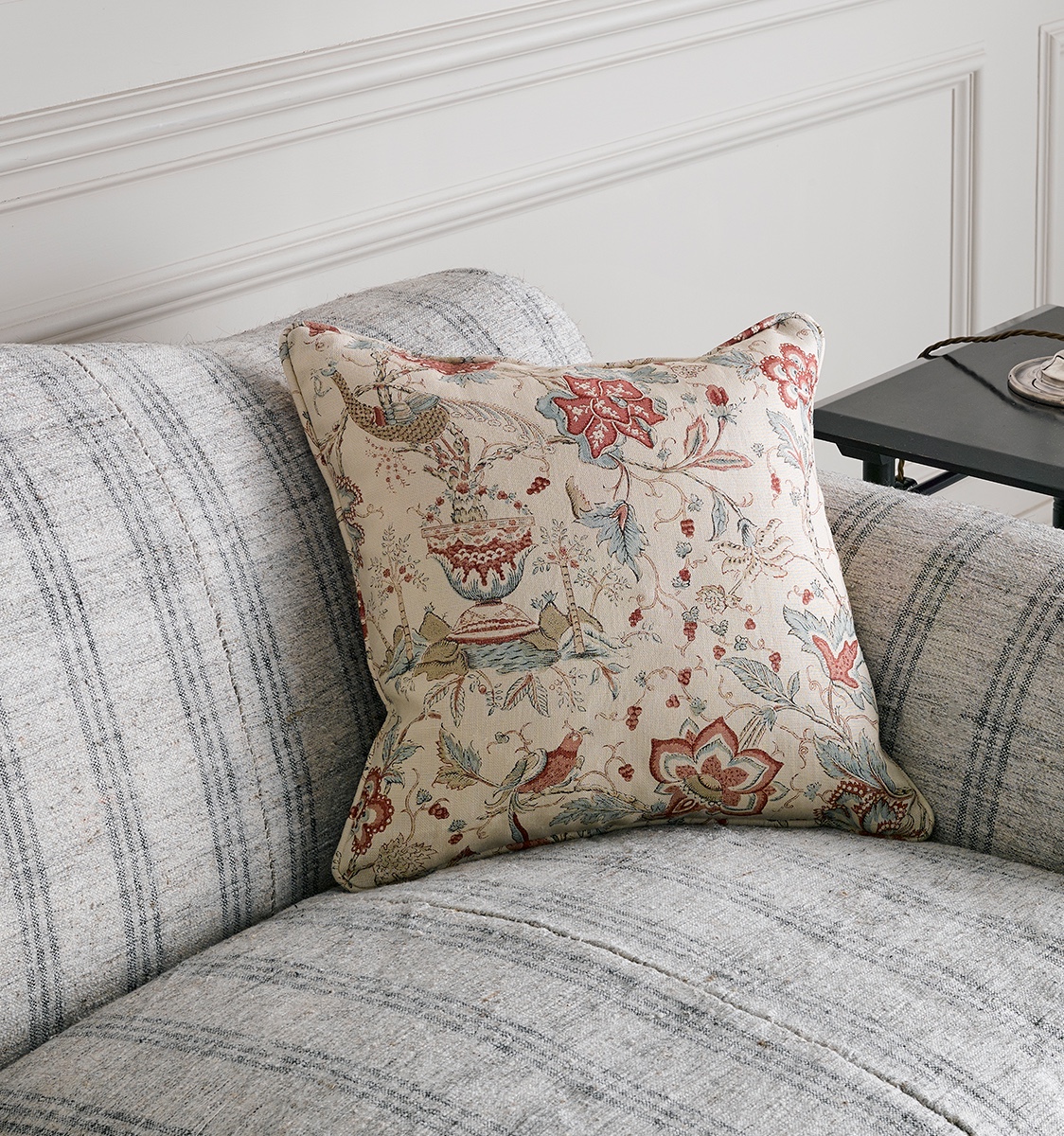 This self-back cushion has a concealed zip and piping. Wonderful detailed screen print on linen. Derived from an early C19th classic French design.