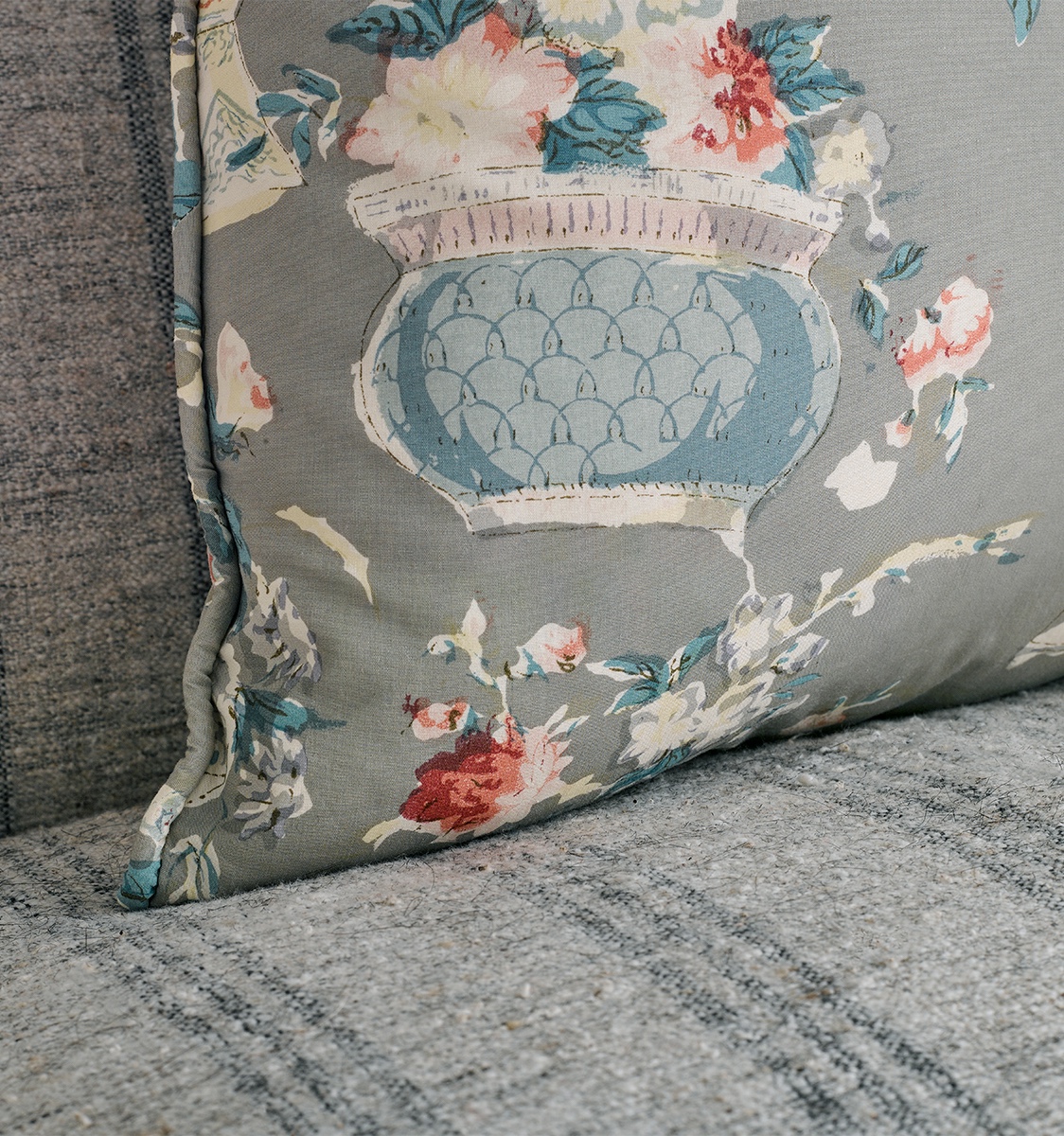 This cushion showcases a French fin de siêcle classic chintz with charming blue and white Chinese pots. Self-backed with concealed zip. Kindly note the pattern placement might differ.