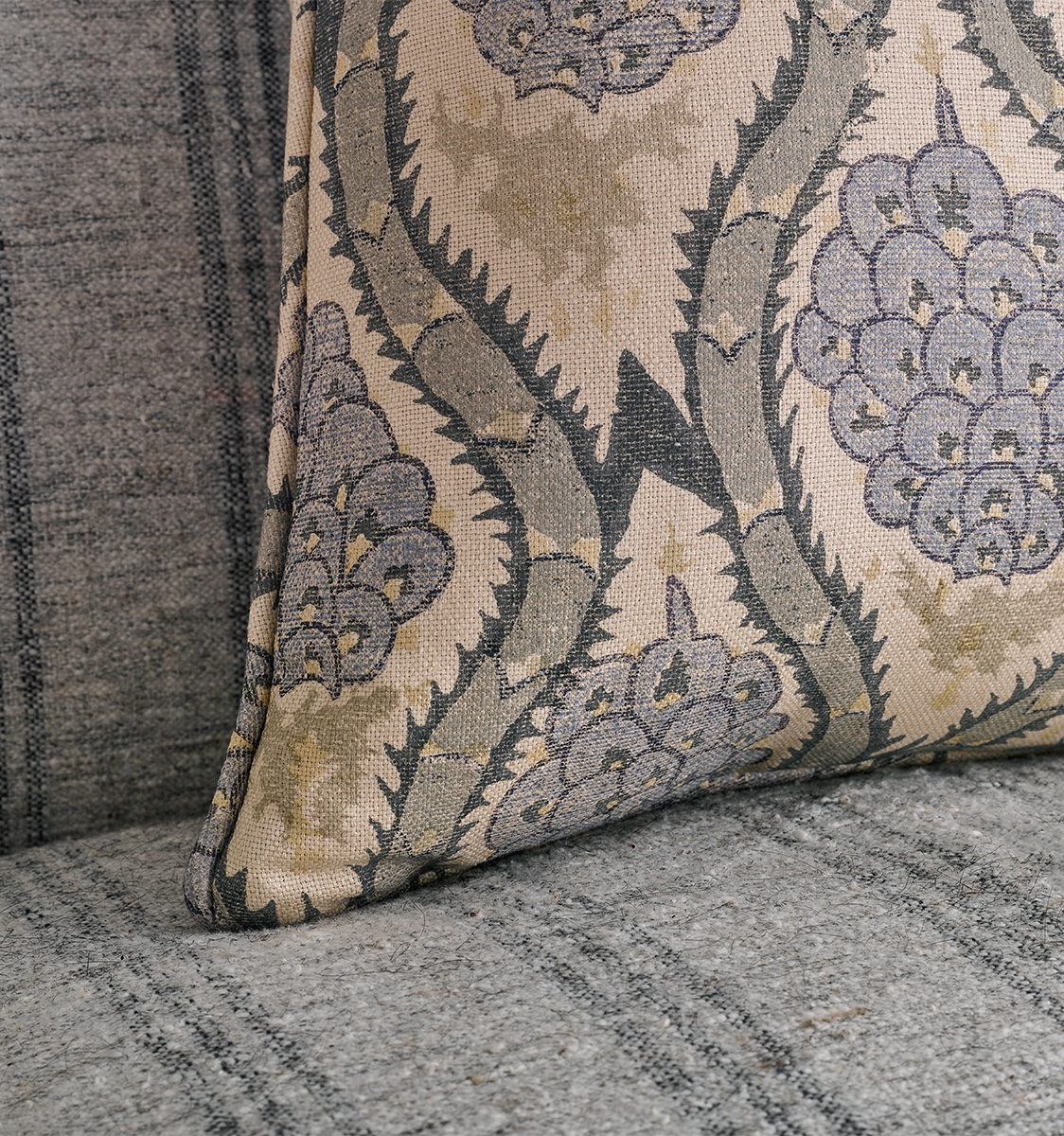 A square cushion handmade at Robert Kime using our Pali fabric. Pali, a variant of a very ancient needlework design, is a pattern that is found in many forms throughout the Middle East.