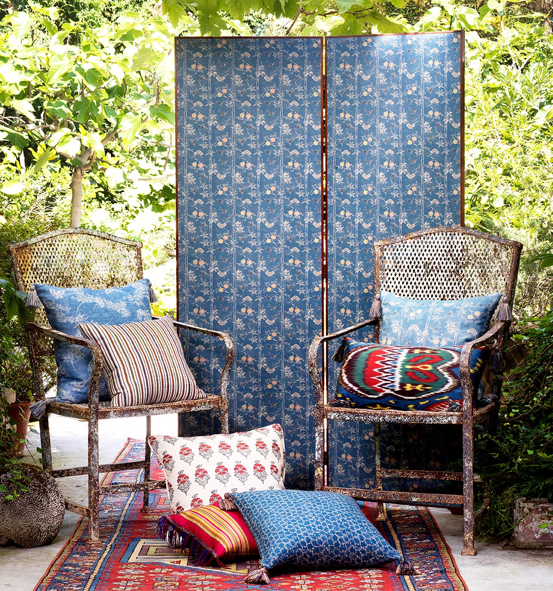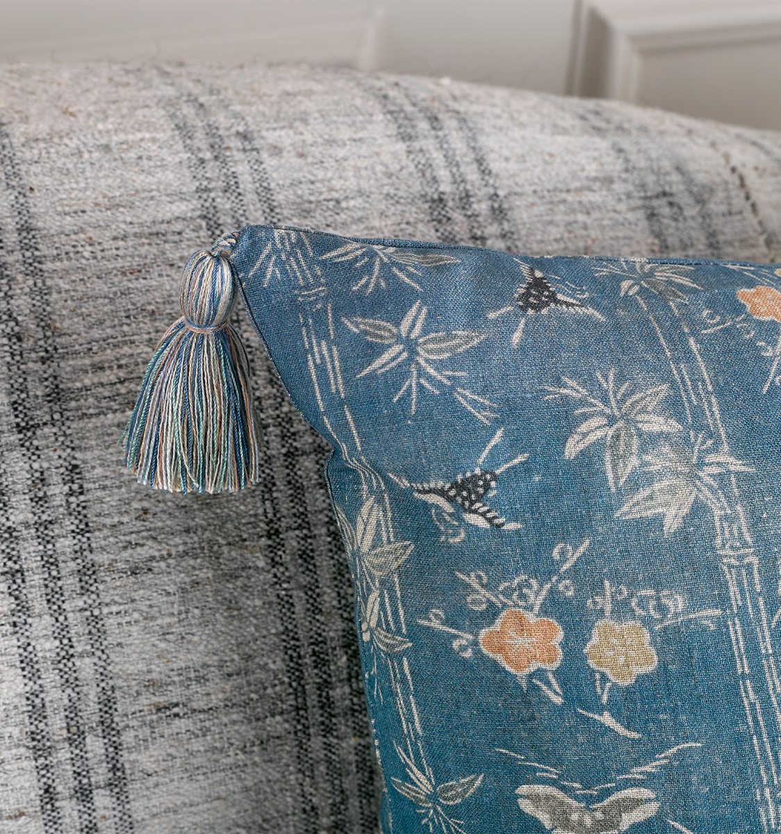Takeyabu, from the Nara collection, showcases birds and flowers amongst stems of bamboo. Inspired by a Bingata fabric fragment which generally depict natural subjects. Tassels are all handmade to match.