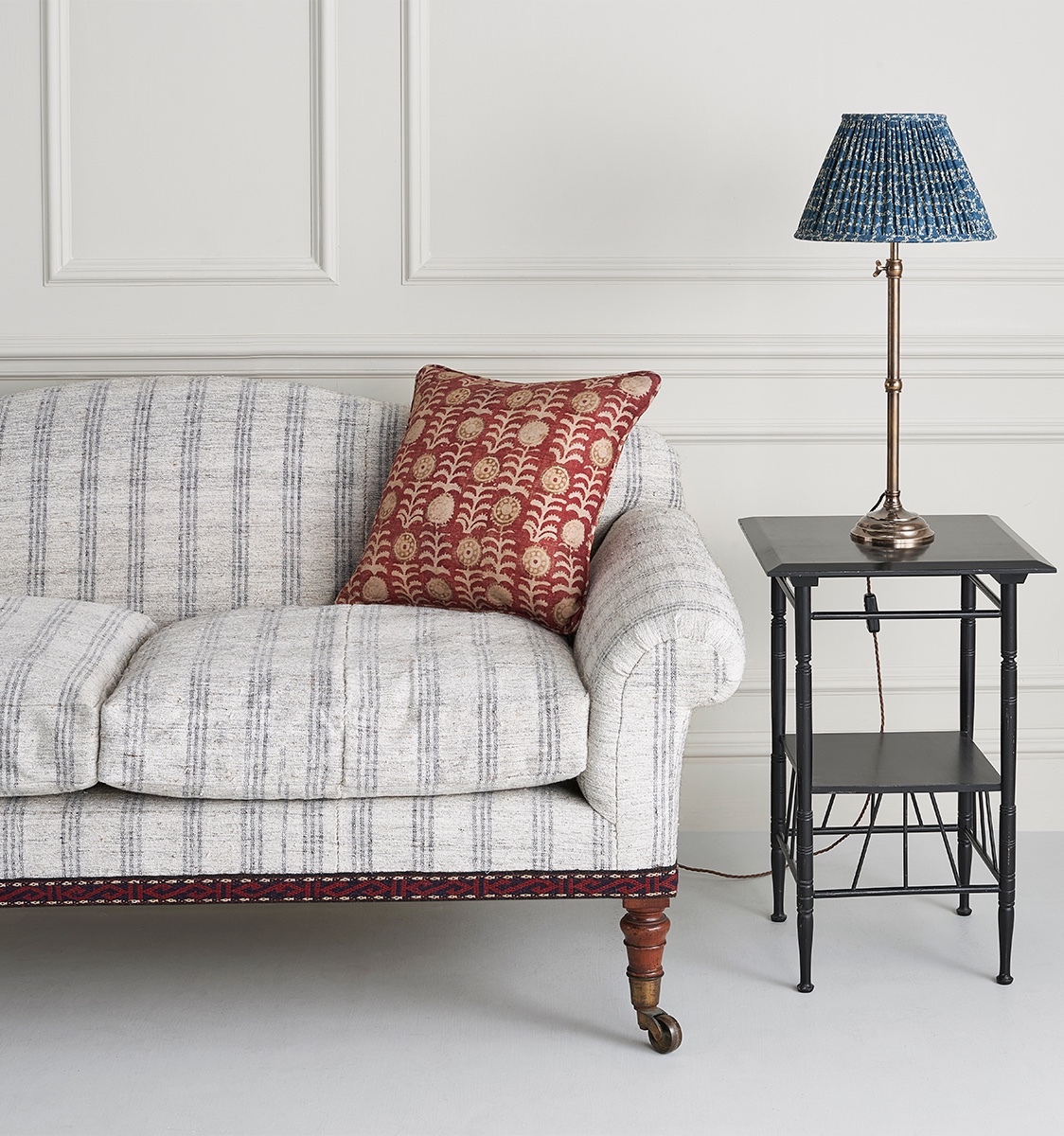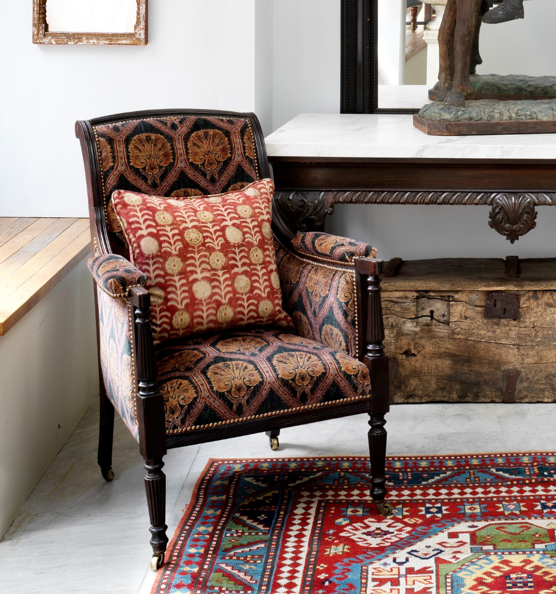 A square cushion handmade at Robert Kime using our Tansy Rust fabric. Tansy is a design inspired by an original block print design found in Robert's archives.