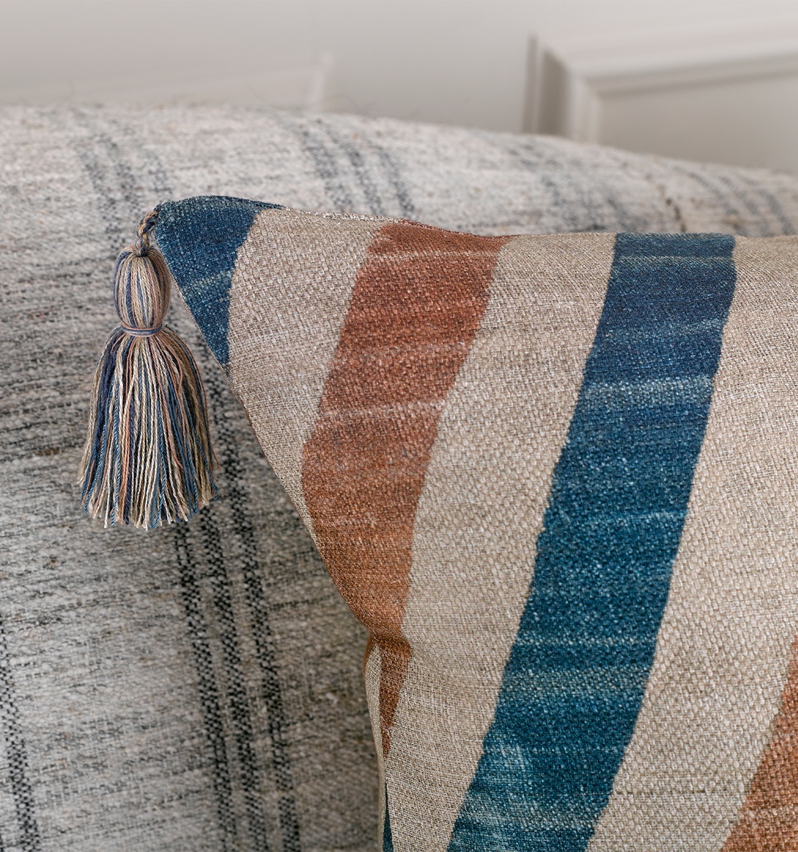 Tazuna cushion with matching tassels. The design is inspired by a decorative Japanese rope, called Tazuna, which is attached to the reins to dress or decorate a horse for a traditional ceremony or festival. The traditional pattern on a Tazuna is of diagonal lines.