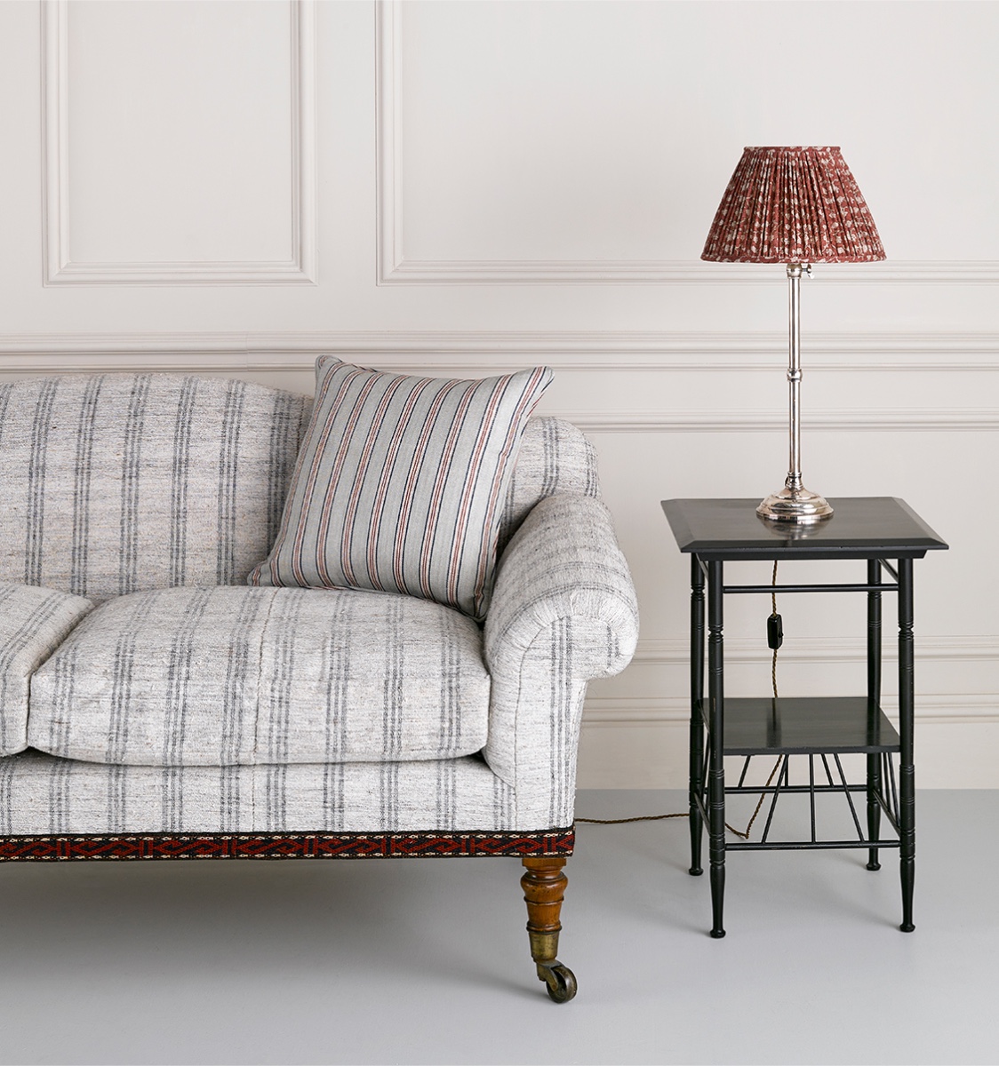 A square cushion handmade at Robert Kime using our Tynemouth Ticking Eucalyptus fabric. Available in six colours, Tynemouth Ticking is translated from an antique ticking from Robert's collection.