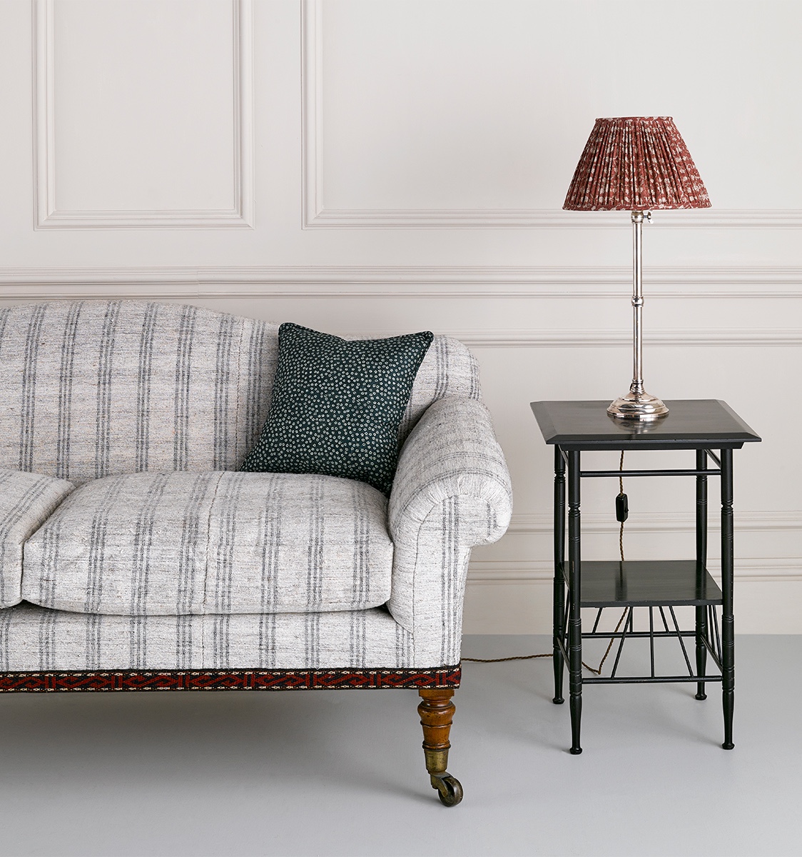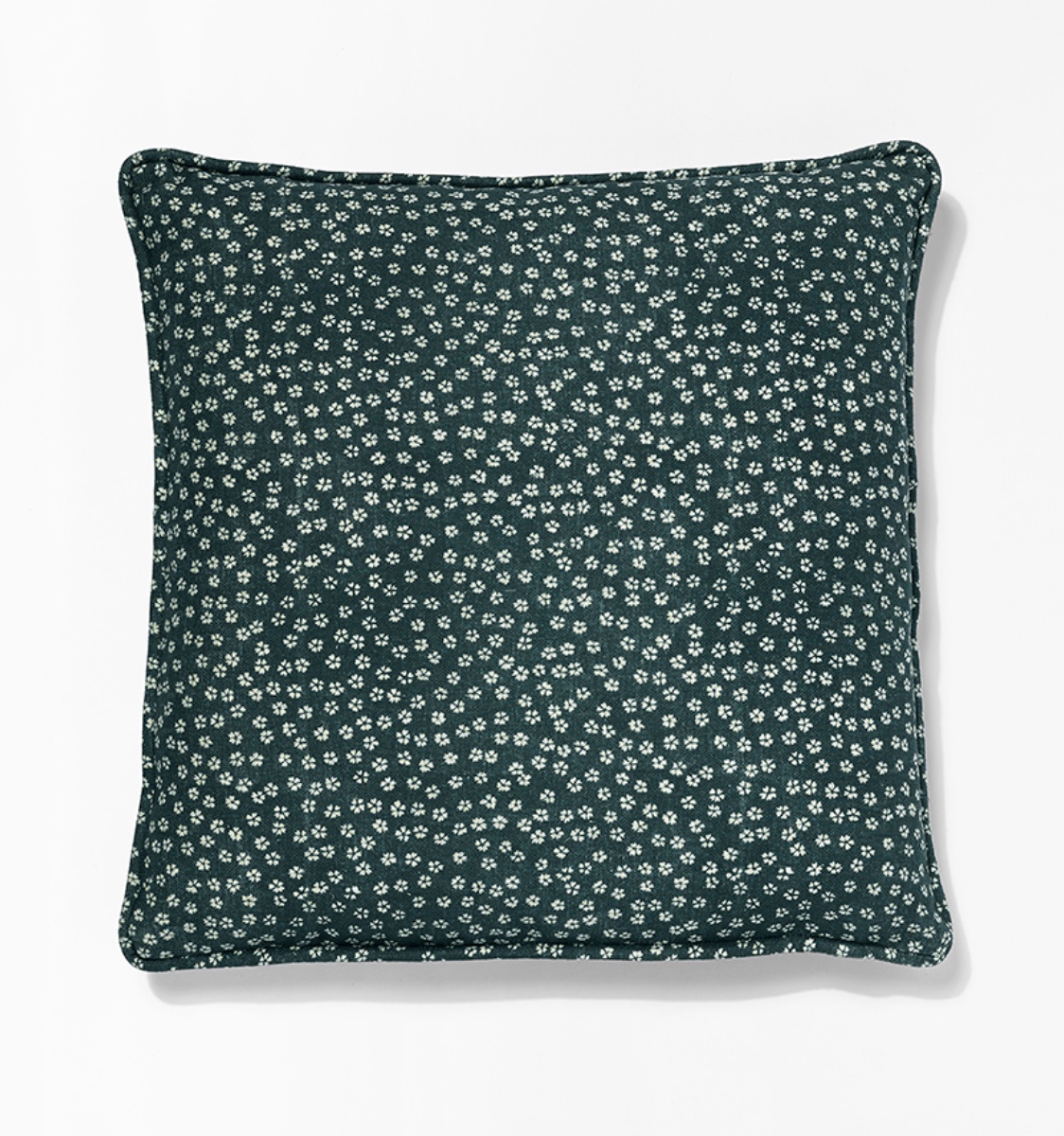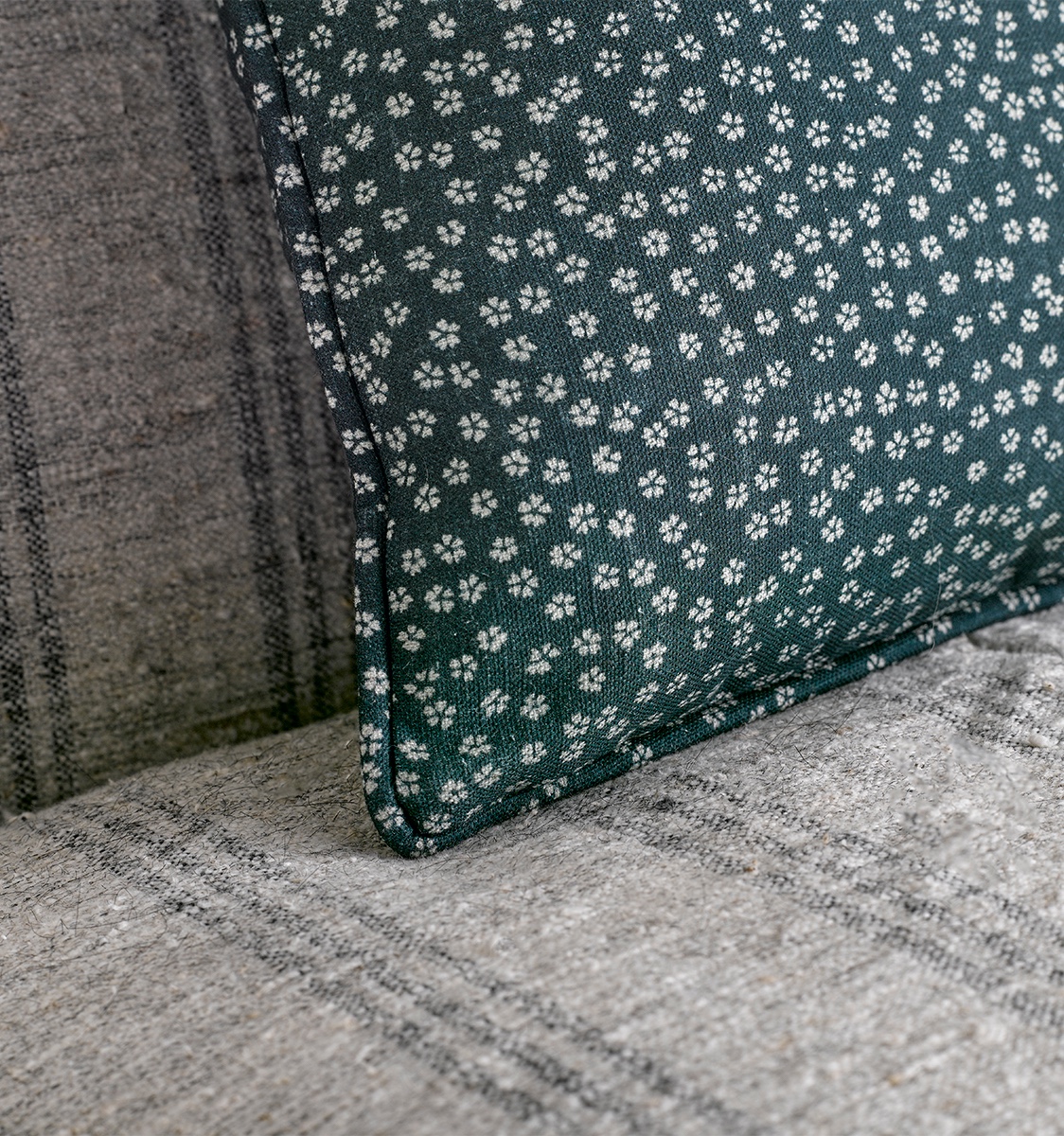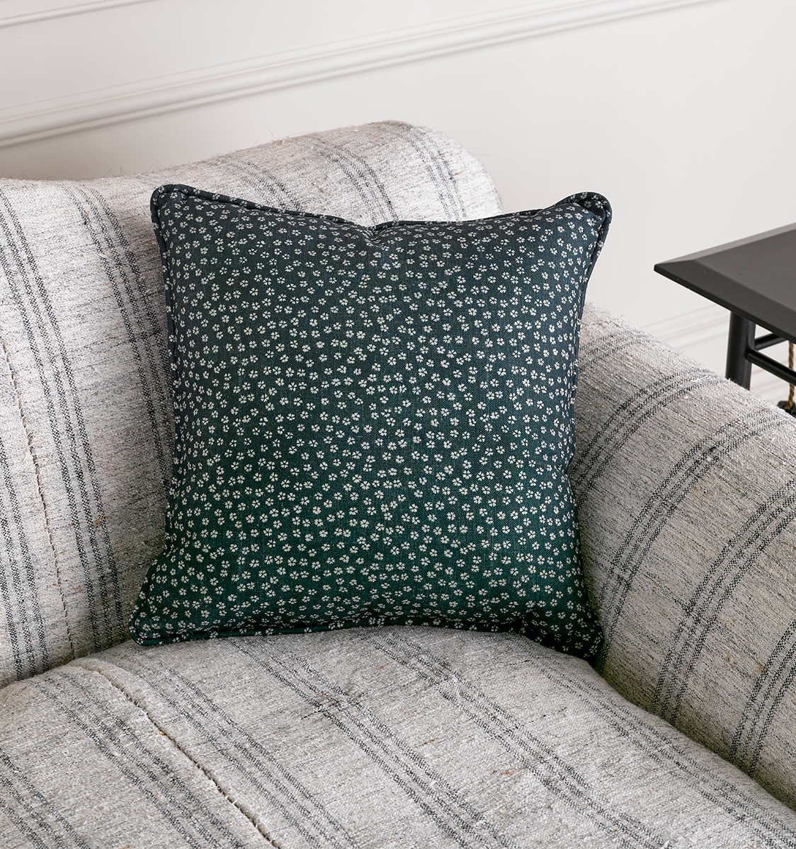 Yozakura cushion, self-piped. 'Yozakura' or night cherry flower celebrates the Japanese symbolism of cherry blossoms indicating a time of renewal and the fleeting nature of life. Inspired by a fragment originating from the Edo period, this style of cotton print was traditionally used to make 'Hakama', a type of Japanese trouser. Yozakura fabric is part of the NARA collection.