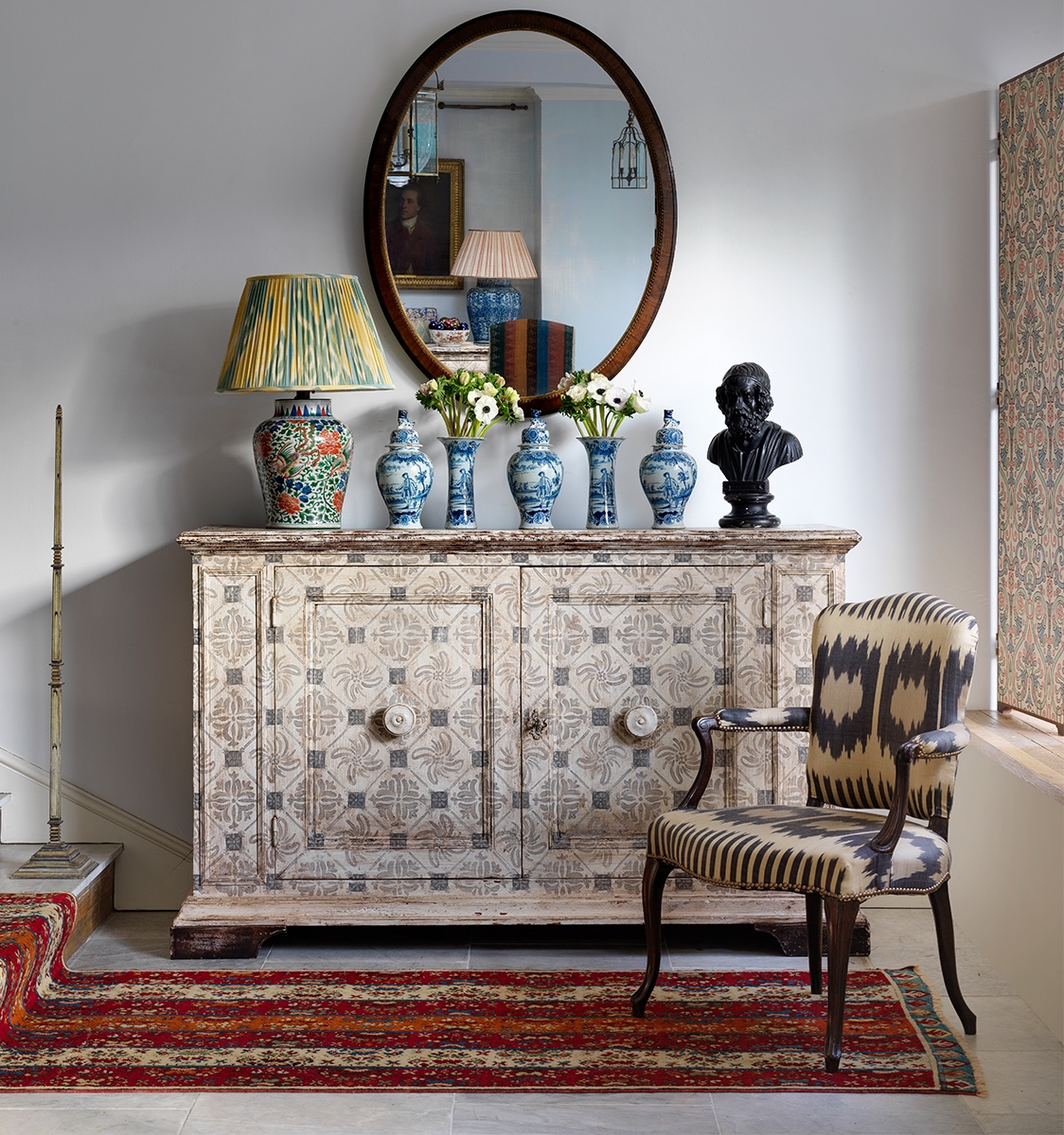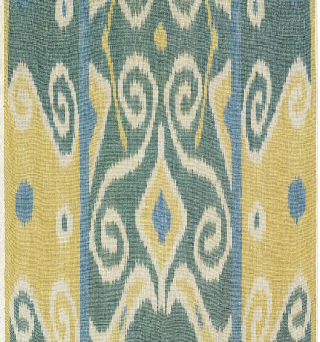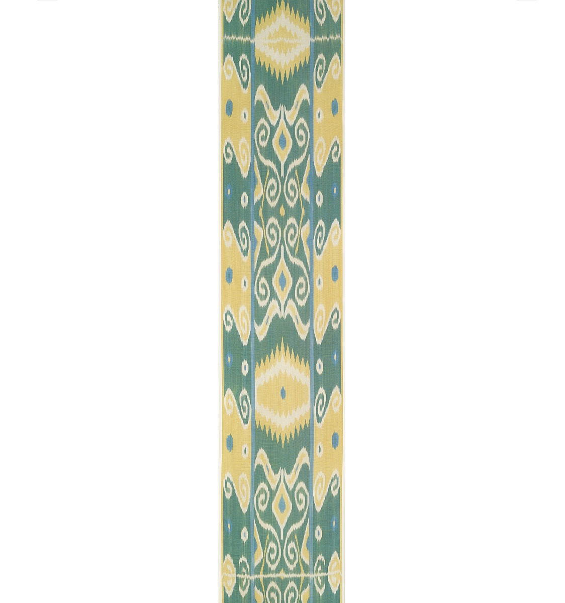 All Robert Kime Ikats are made in the traditional way, hand-dyed and woven on narrow looms in Uzbekistan. As a fabric type, the pattern of a handwoven ikat includes runs of colour, small slubs and threads typical of the craft process. The design mirrors itself every two metres, whereupon a narrow undyed line indicates the repeat. This is entirely intentional and serves to underscore the designs’ authenticity for which Robert Kime Ikats are unmatched.
