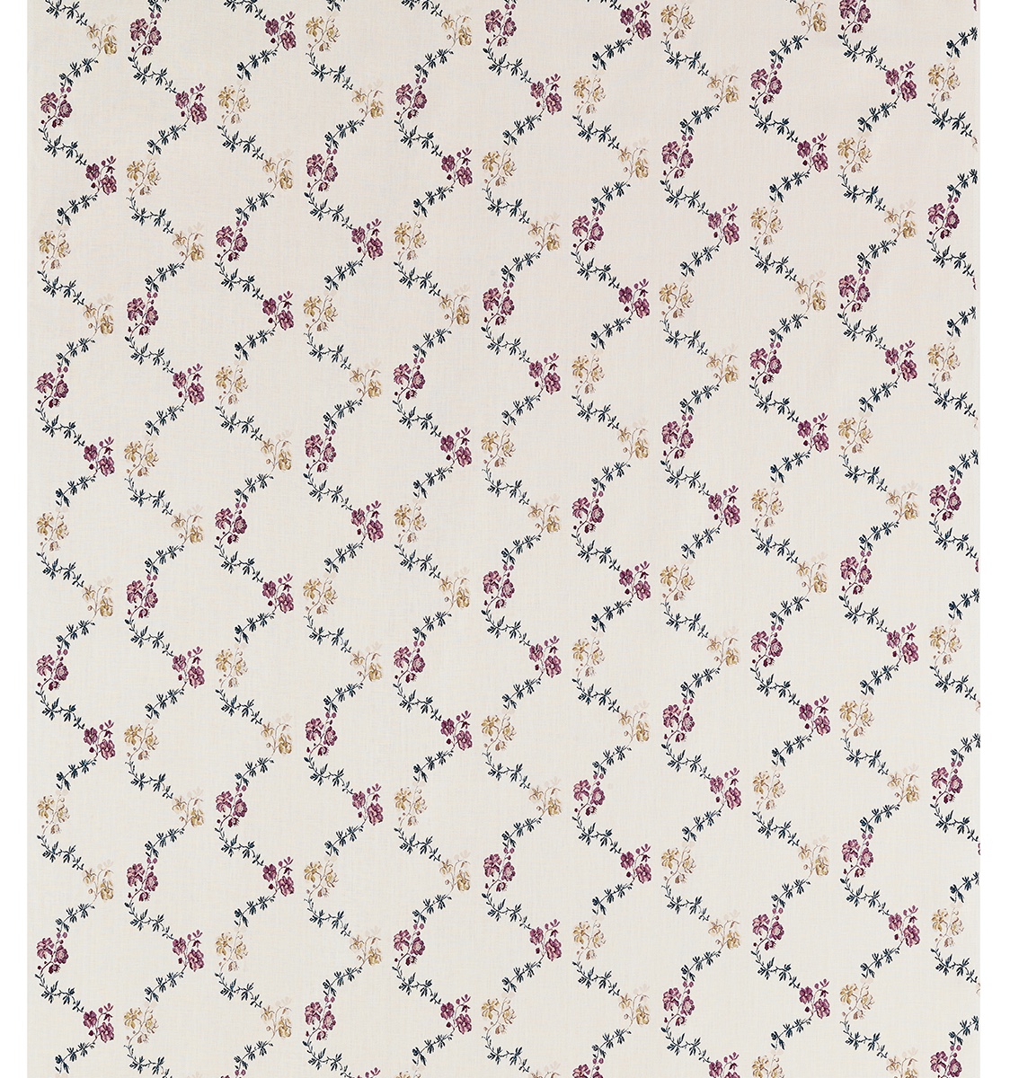 An antique English curtain lends its inspiration to May on Linen. Floral garlands, which climb vertically are screen printed on a heavier linen fabric suitable for upholstery and curtains to name a few applications.