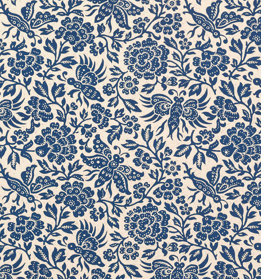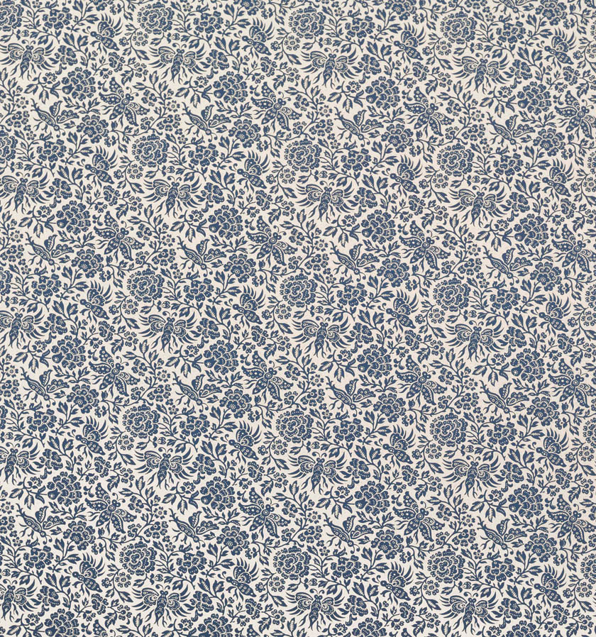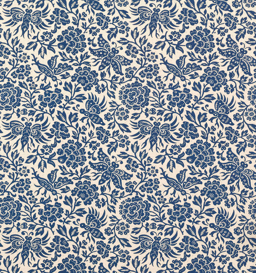 Based on a fragment of cloth found on a C17th chair, this butterfly and floral design is printed onto an aged white cotton.