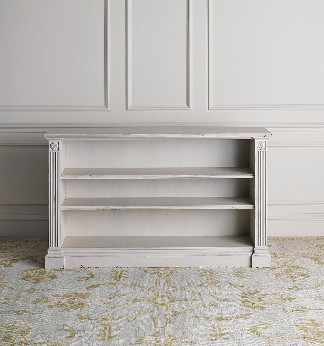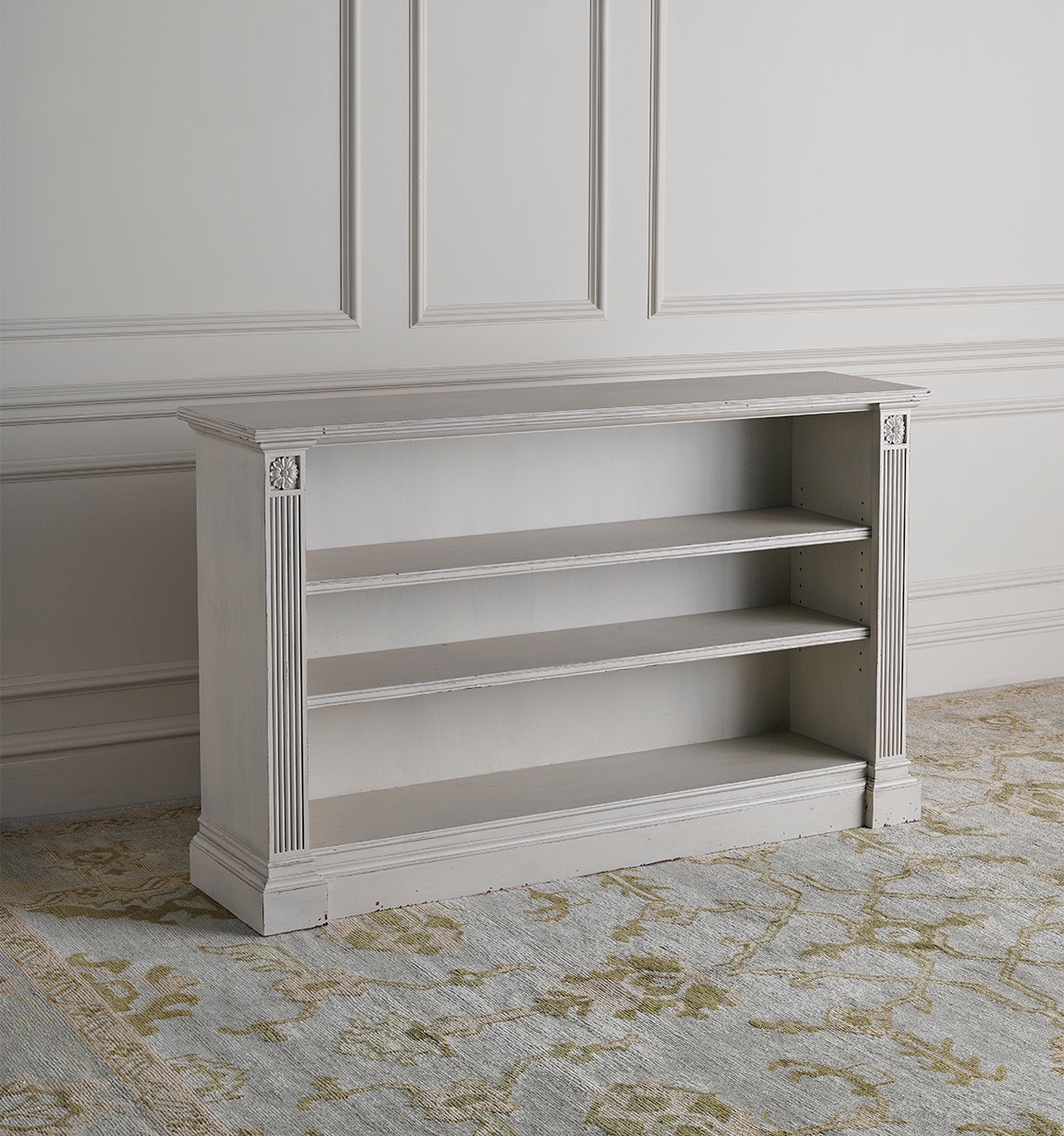 The Painted Alderton Bookcase has an antiqued, hand-painted finish with adjustable height shelving. An adaptation of a Georgian bookcase, it is entirely crafted in England, the oak is sourced in France and is PEFC & FSC certified. Finished with a dead flat varnish for protection.