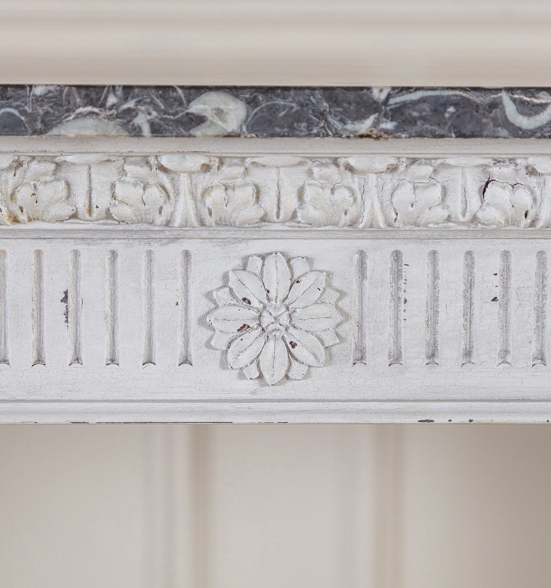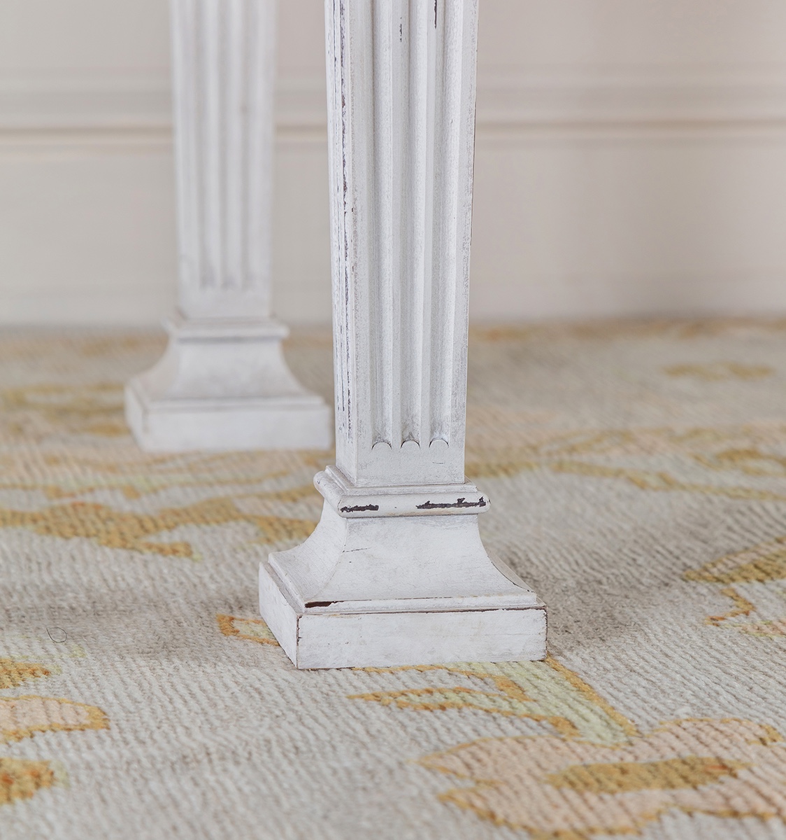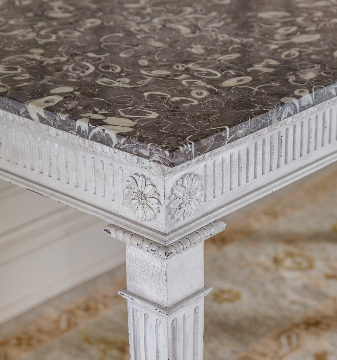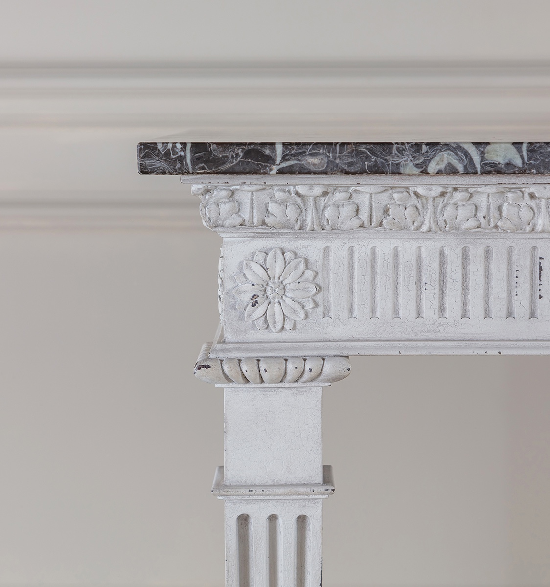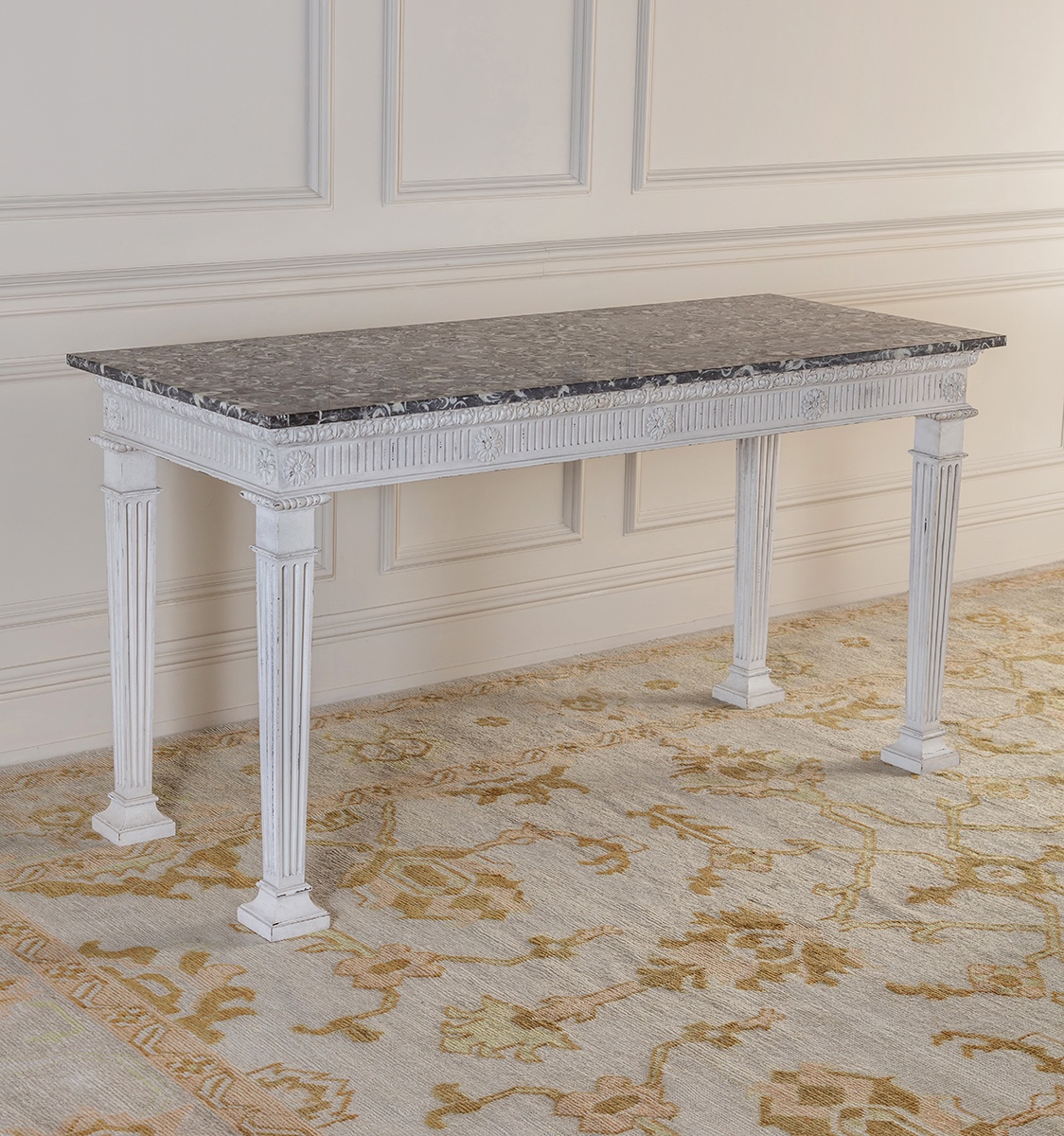 A well, proportioned console table in the manner of Robert Adam. Gesso, antiqued hand-painted softwood, available in bespoke sizes up to 6', with a choice of marble tops. The measurements given are the frame size for a 5' table and do not include the marble top. We recommend a 2cm marble overhang on the front and side edges of the table. If you would like an additional overhang on the back edge to compensate for a skirting board, please note on your enquiry. Here shown with a 2cm deep fossil marble top and a grey marble top.