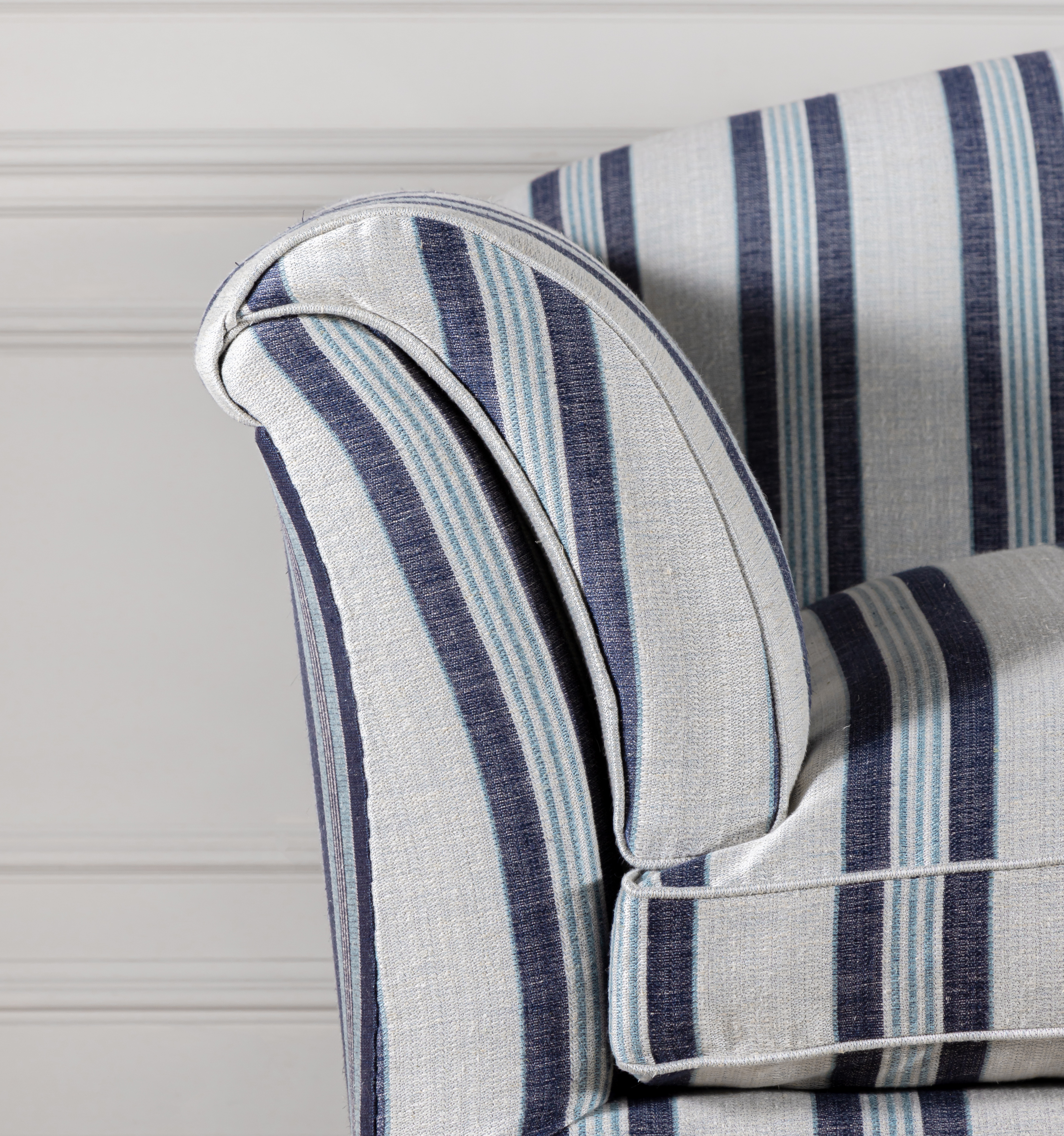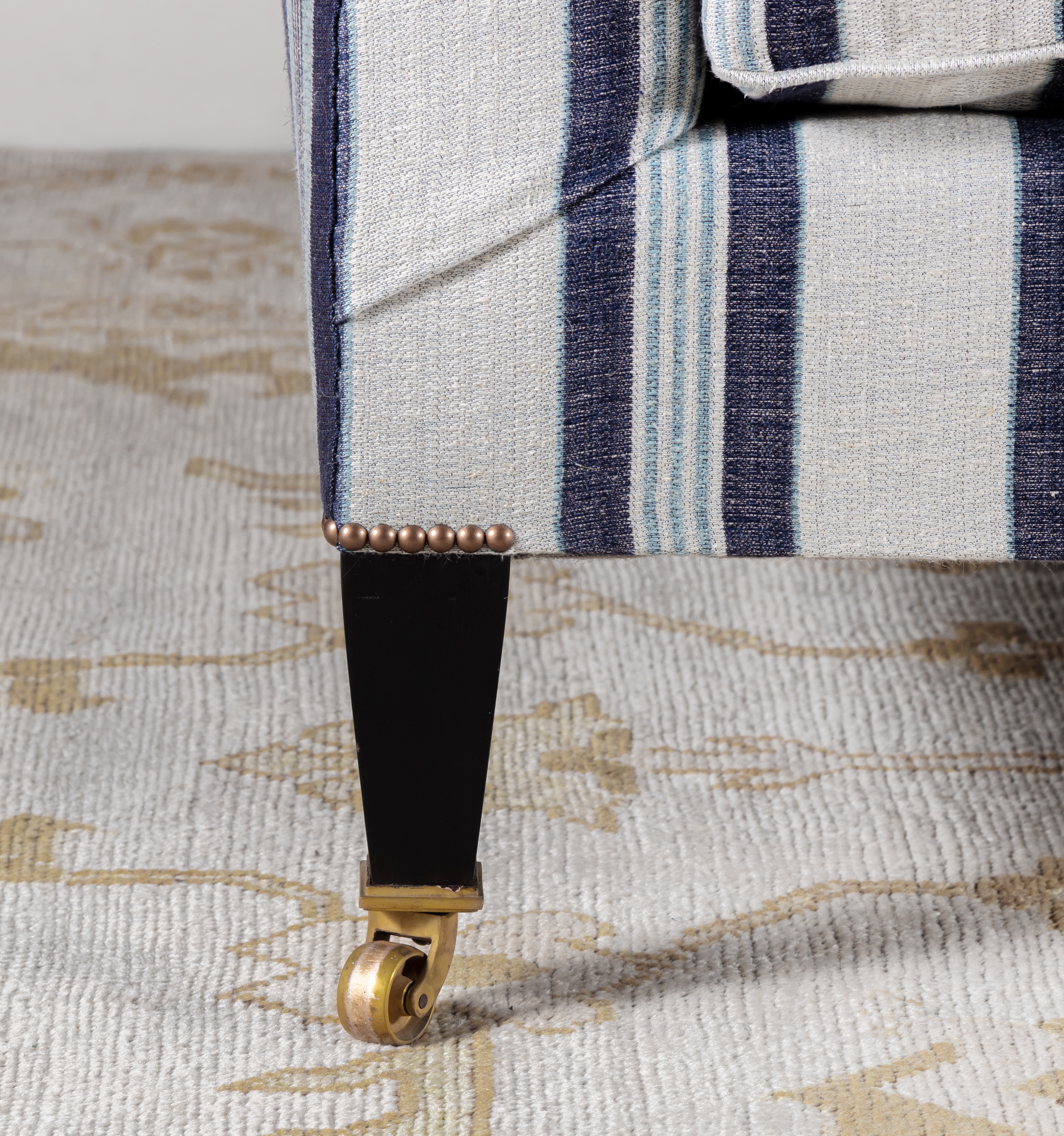 The Abbey Sofa can be upholstered in the Robert Kime fabric of your choice. Shown here upholstered in Robert Kime Collection Algiers Stripe Grey & Coral and Serat Stripe fabric.
