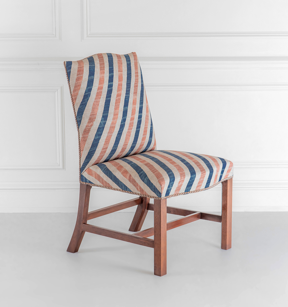 A classic Georgian-style dining chair, generous in scale and comfort. Padded beech frame, traditionally upholstered and finished with a close nail detail. Shown here upholstered in the Robert Kime Collection Serat Stripe and Tazuna fabric. The Gainsborough chair can be upholstered in the Robert Kime fabric of your choice.