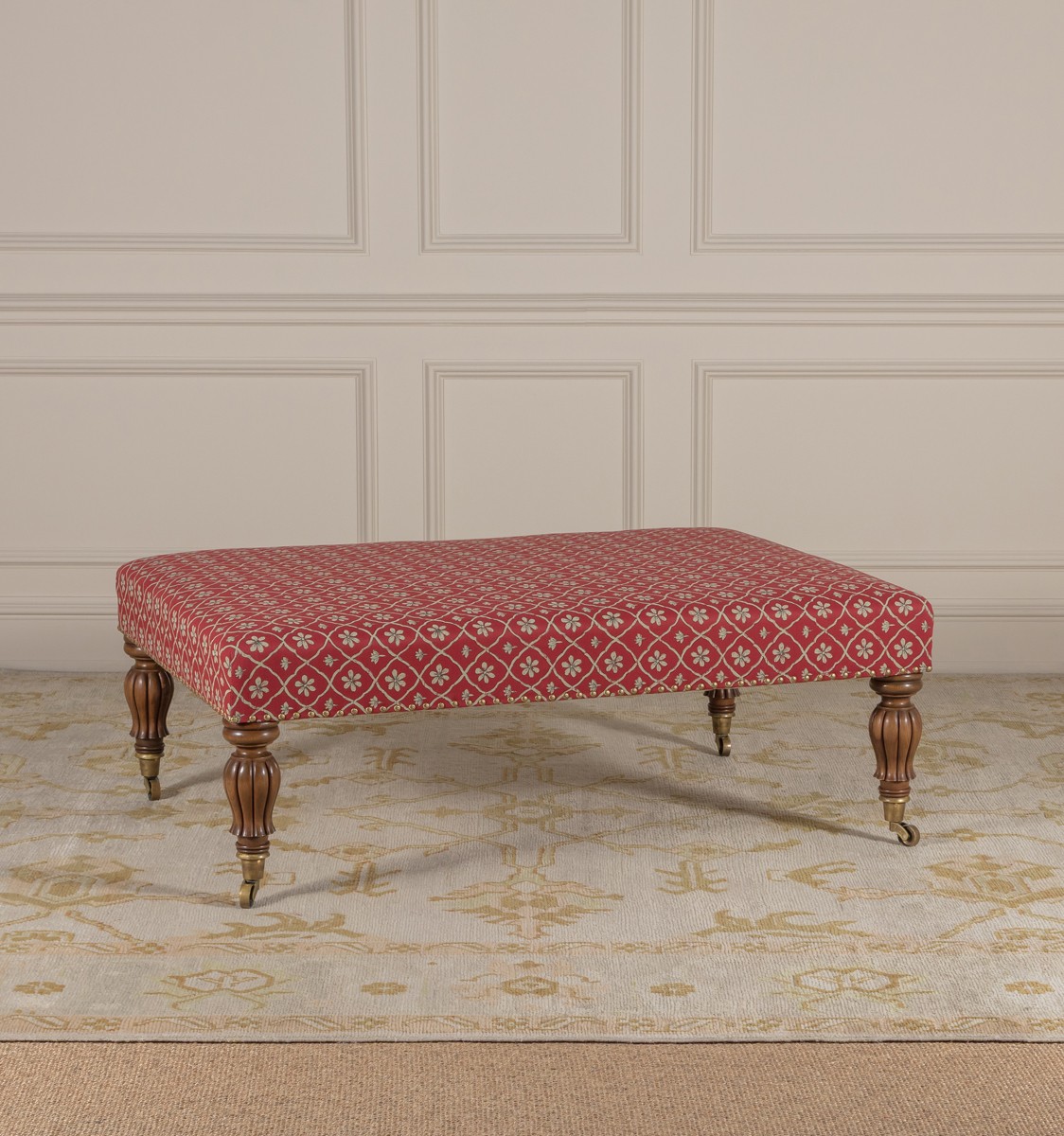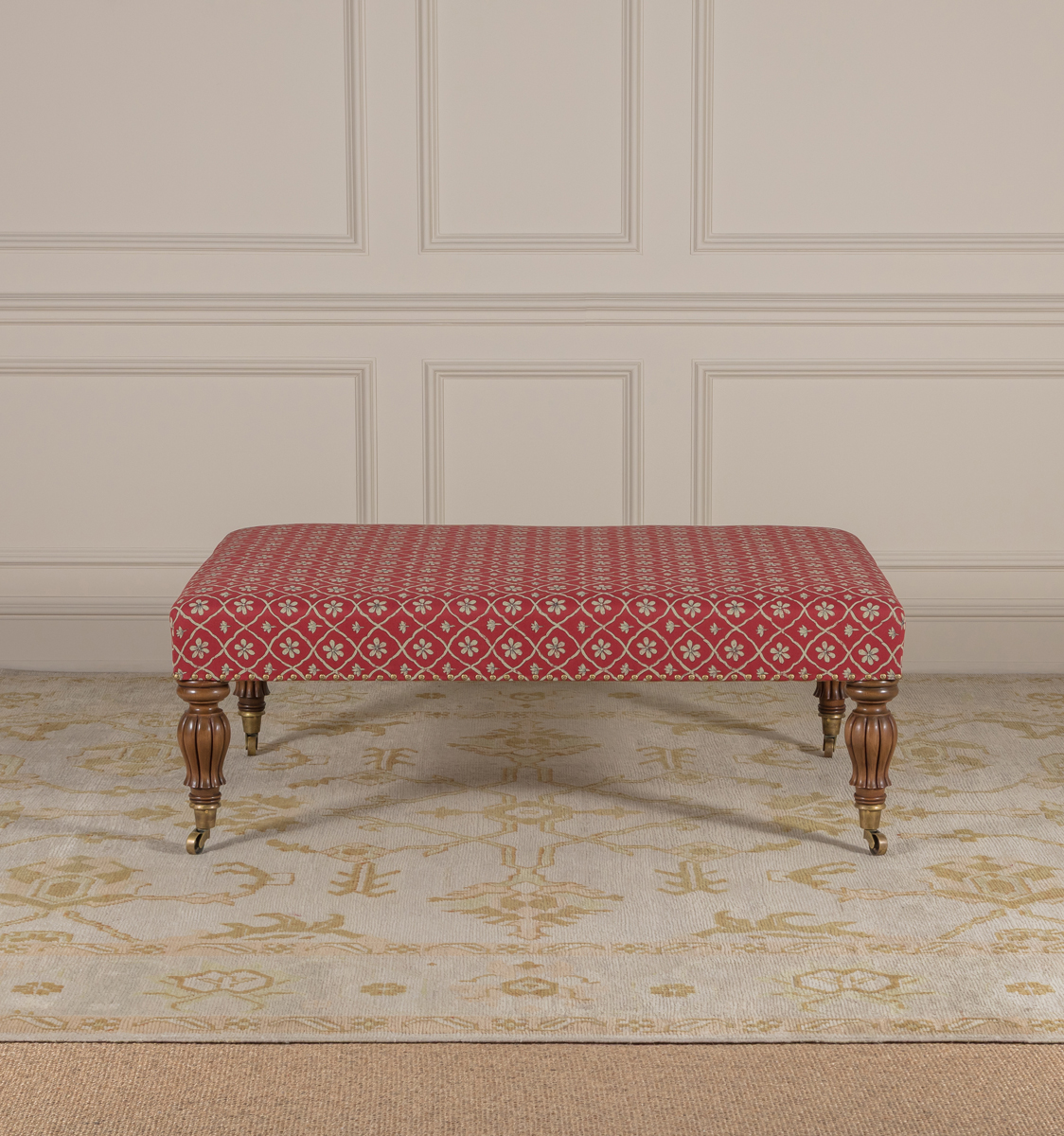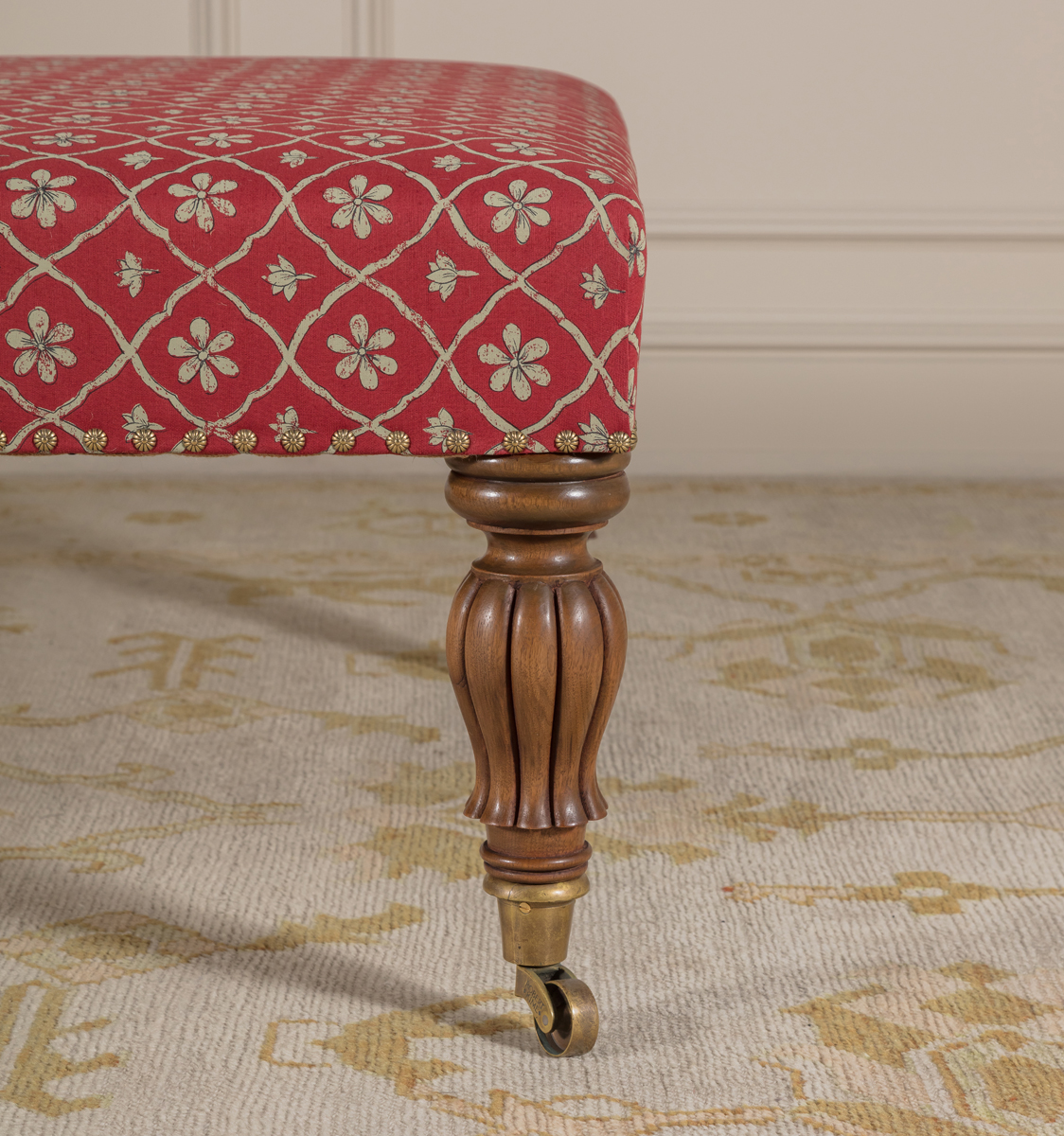 Inspired by a William IV stool with Walnut reeded legs and brass castors. Shown here upholstered in Robert Kime Collection Periwinkle fabric, Ottoman Lampas Blue and an antique weave. The Monkton Stool can be upholstered in the Robert Kime fabric of your choice.