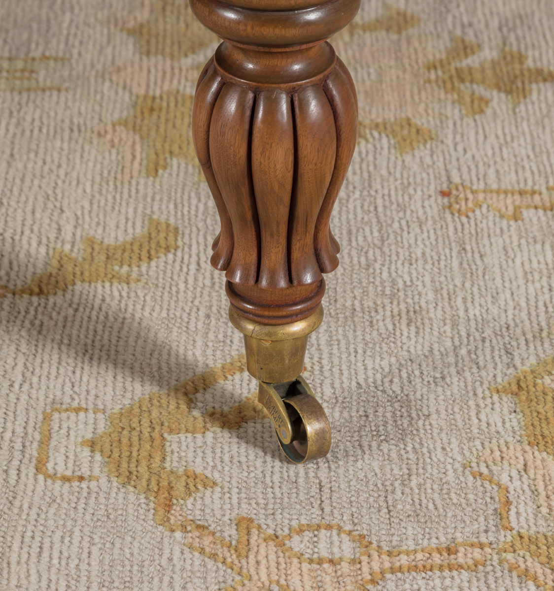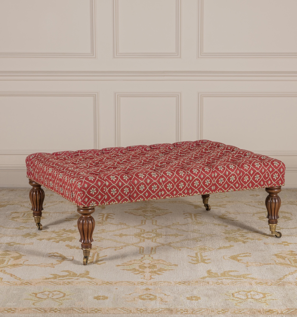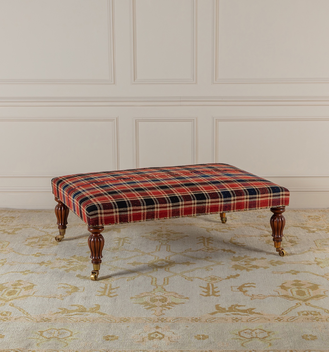 Inspired by a William IV stool with Walnut reeded legs and brass castors. Shown here upholstered in Robert Kime Collection Periwinkle fabric, Ottoman Lampas Blue and an antique weave. The Monkton Stool can be upholstered in the Robert Kime fabric of your choice.