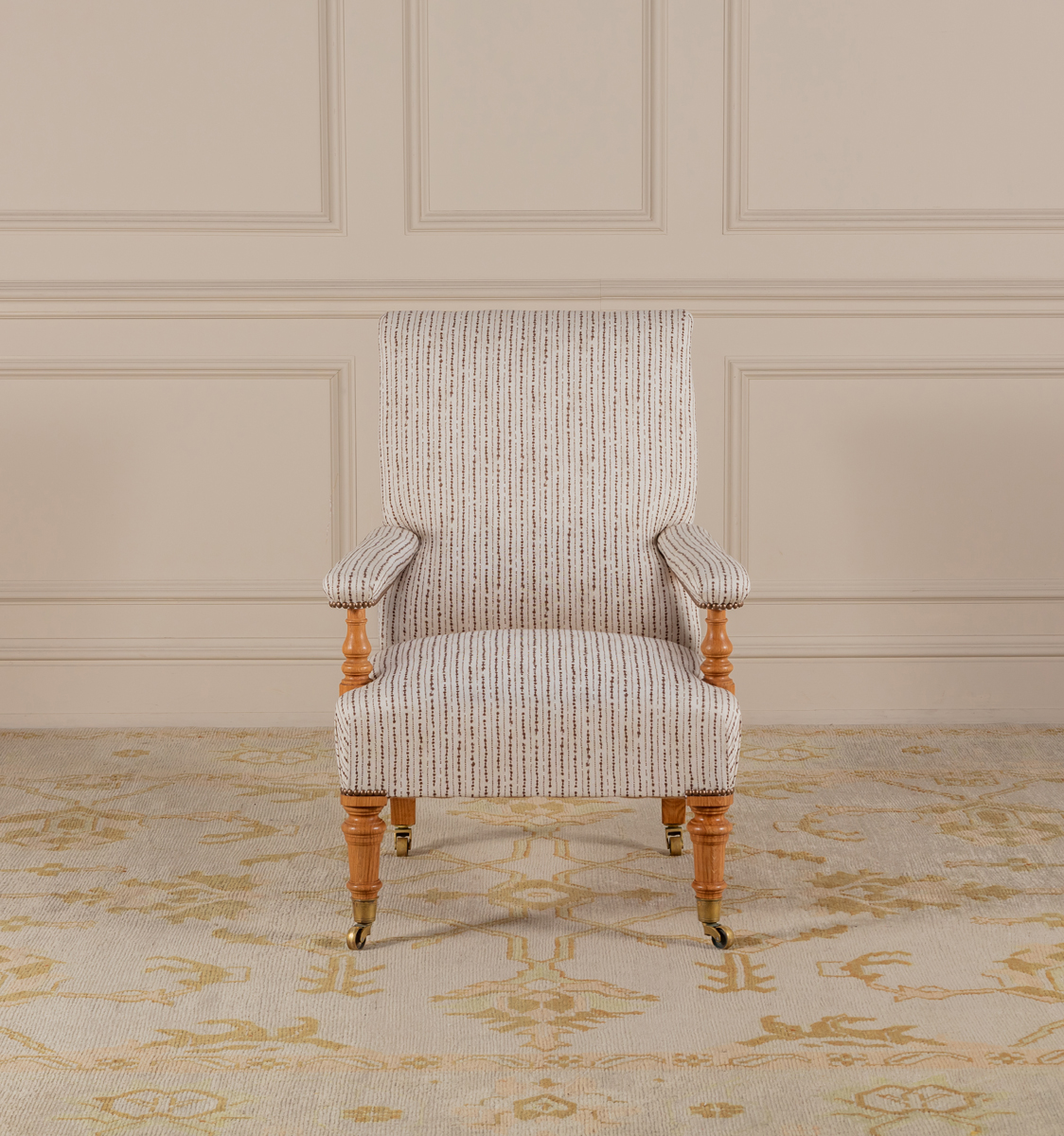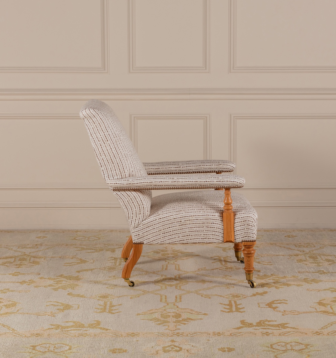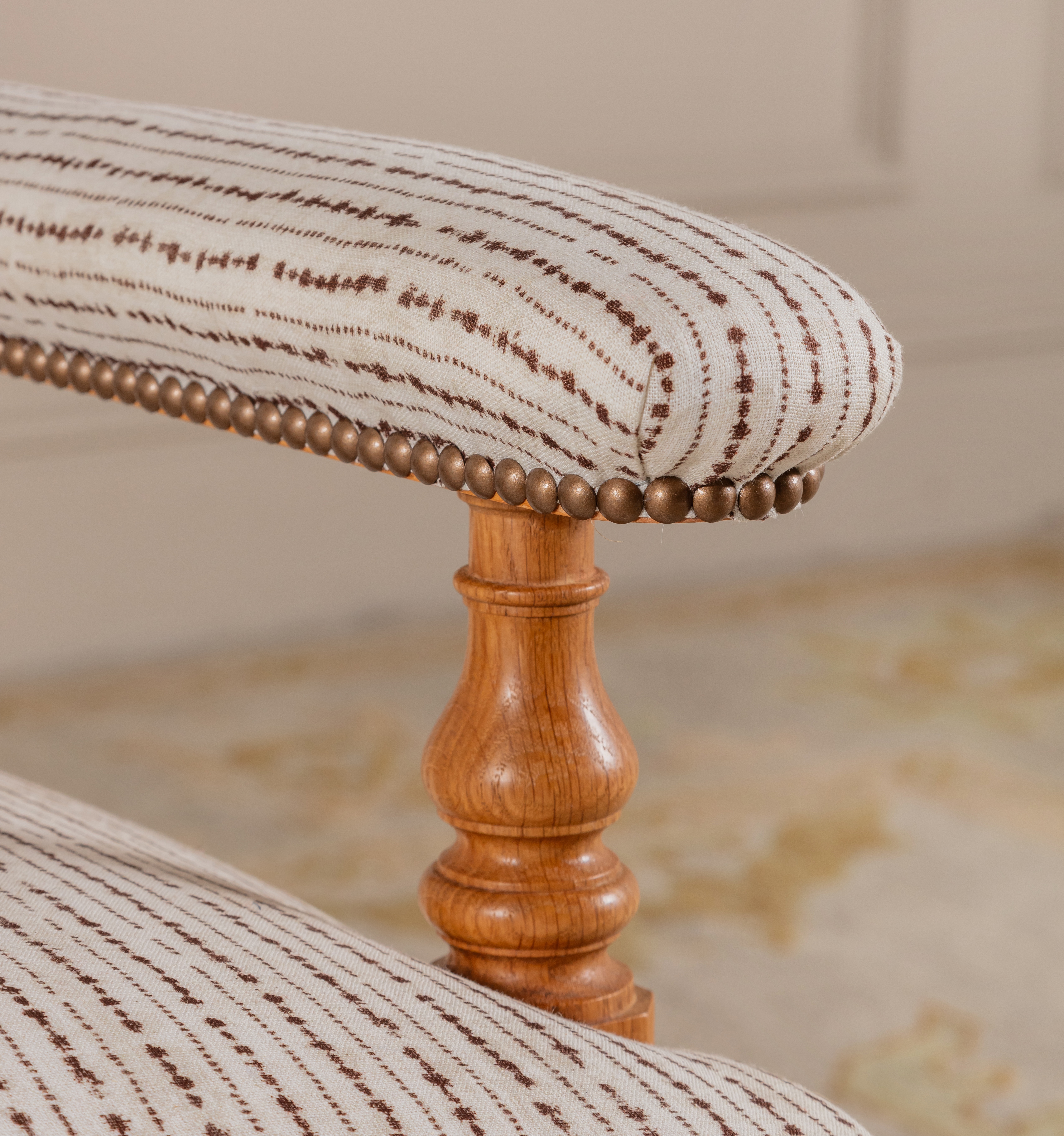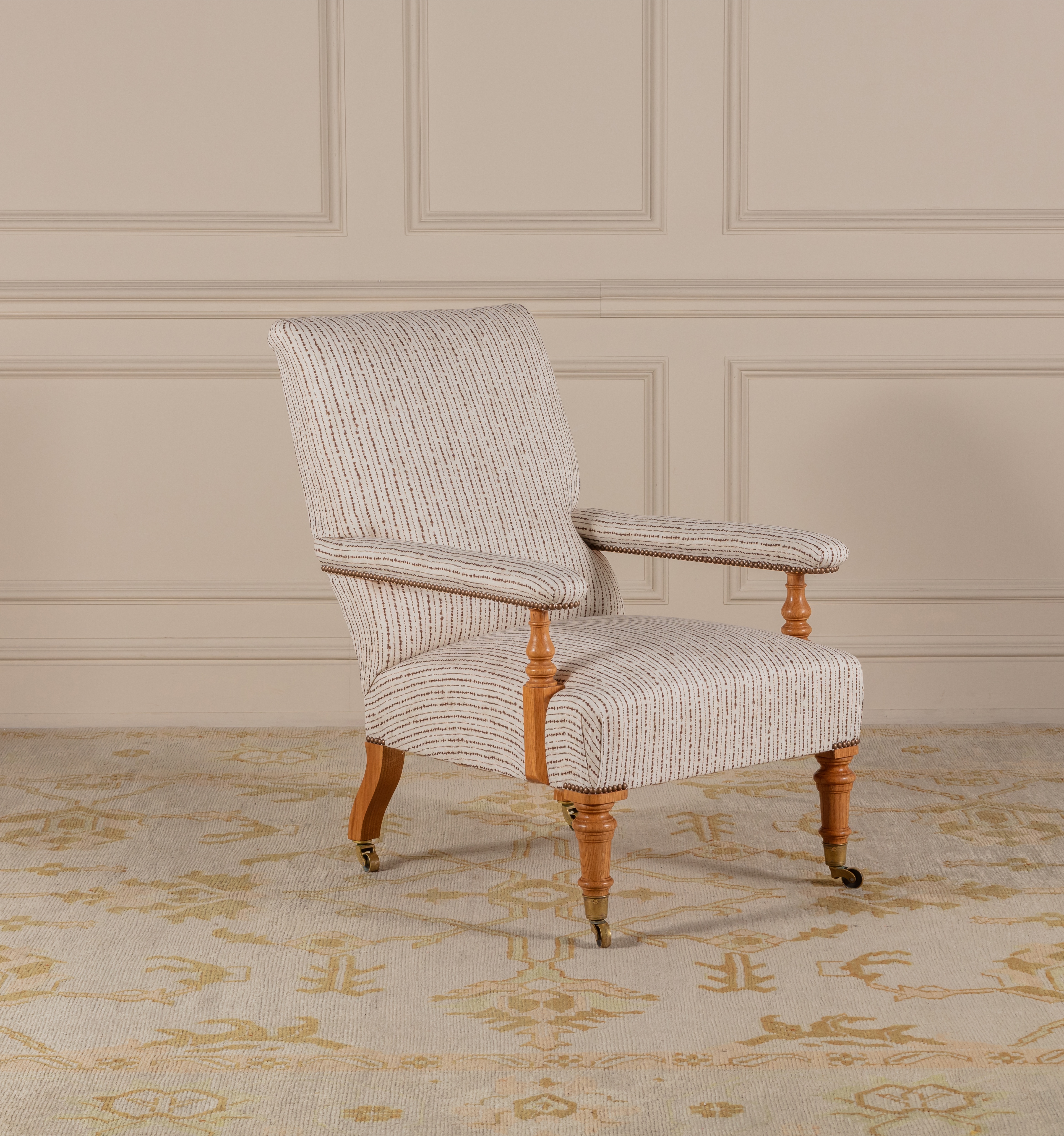 The Oaksey Open Armchair can be upholstered in the Robert Kime fabric of your choice. Shown here upholstered in Robert Kime Hanabi and an antique linen.