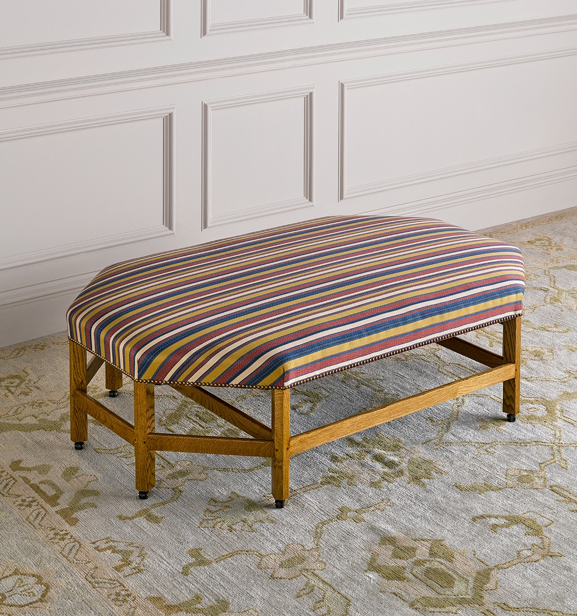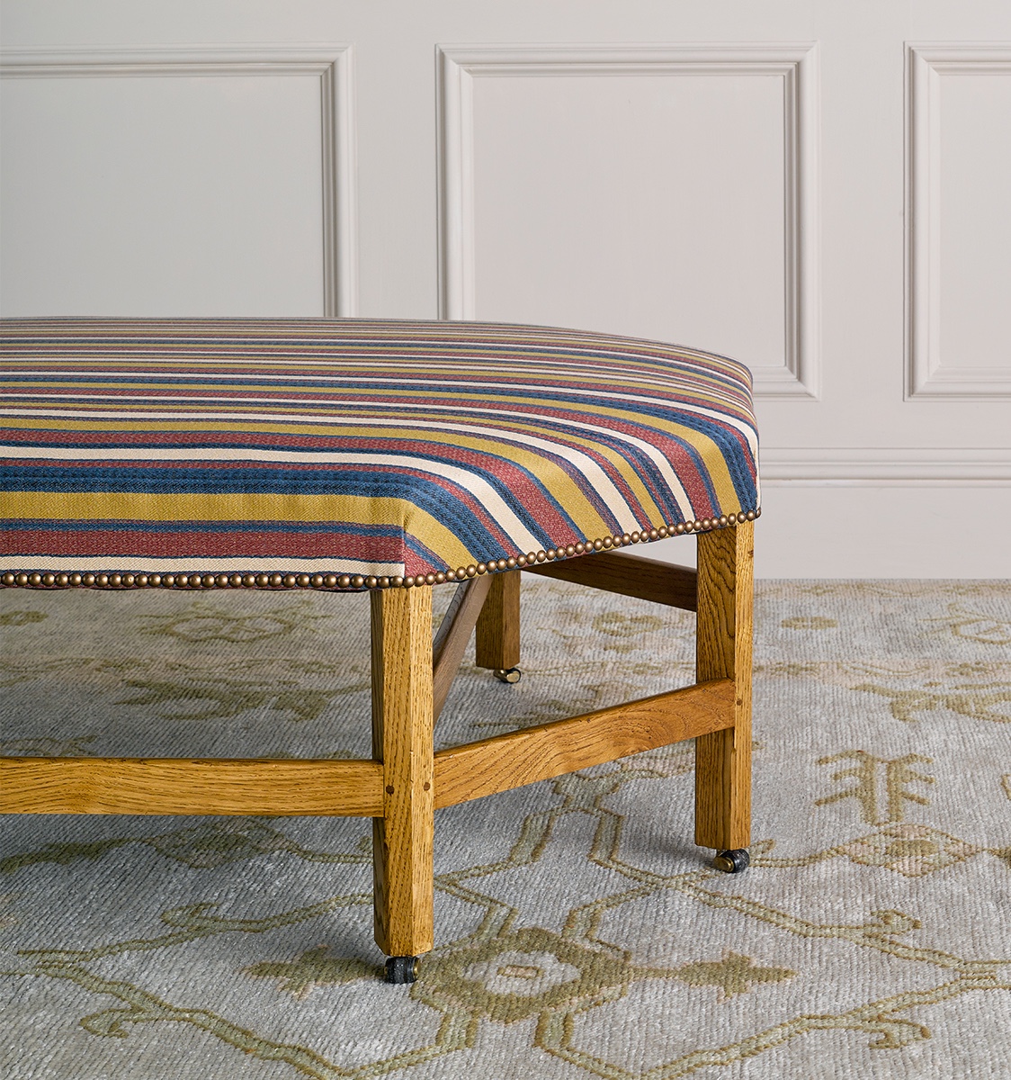 A traditionally constructed and upholstered stool with oak legs and leather wheeled castors. Available also in walnut. Shown here upholstered in Robert Kime Collection Turkoman Stripe fabric. The Octagonal stool can be upholstered in the Robert Kime fabric of your choice.
