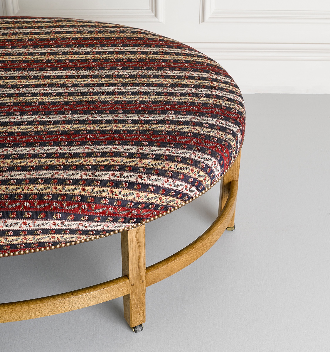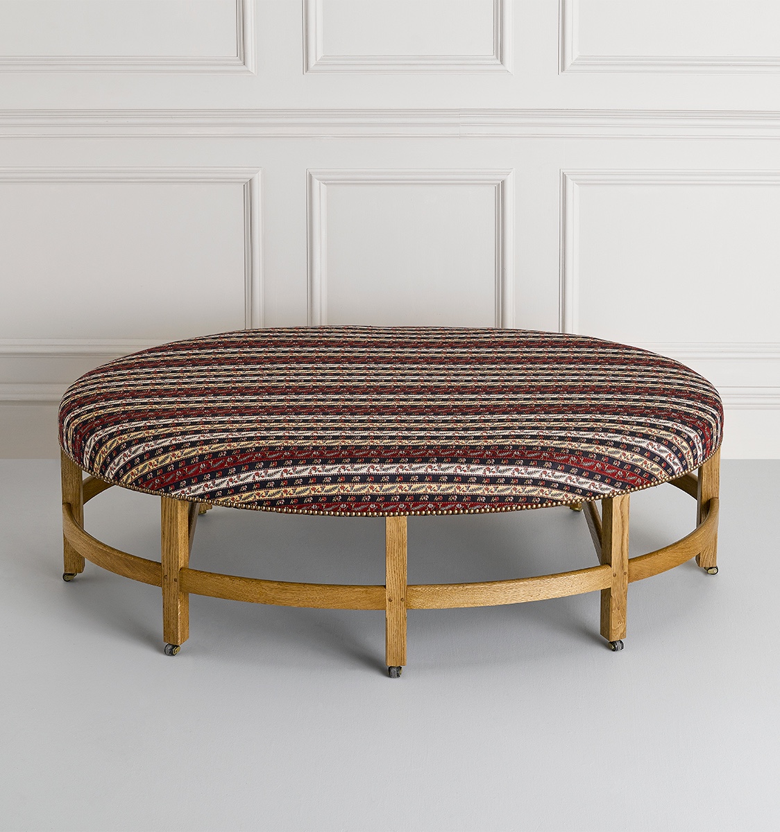 A traditionally constructed and upholstered stool, with a close nailed finish, oak legs and leather wheeled castors. Shown here upholstered in the Robert Kime Collection Qabus fabric. The Oval Stool can be upholstered in the Robert Kime fabric of your choice.