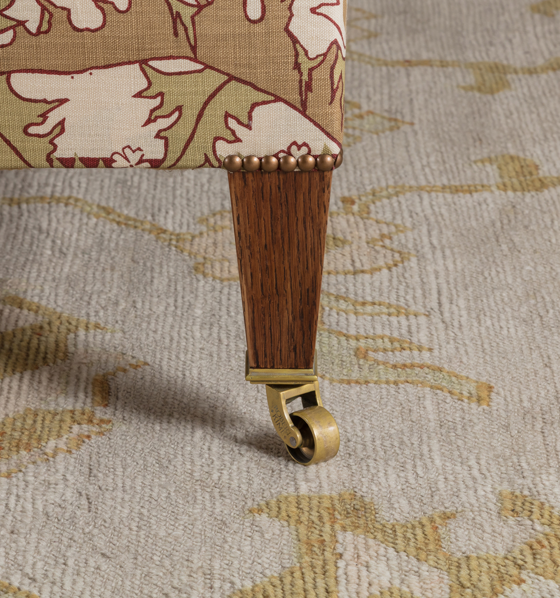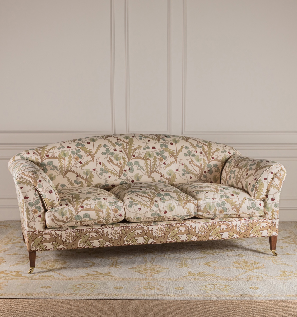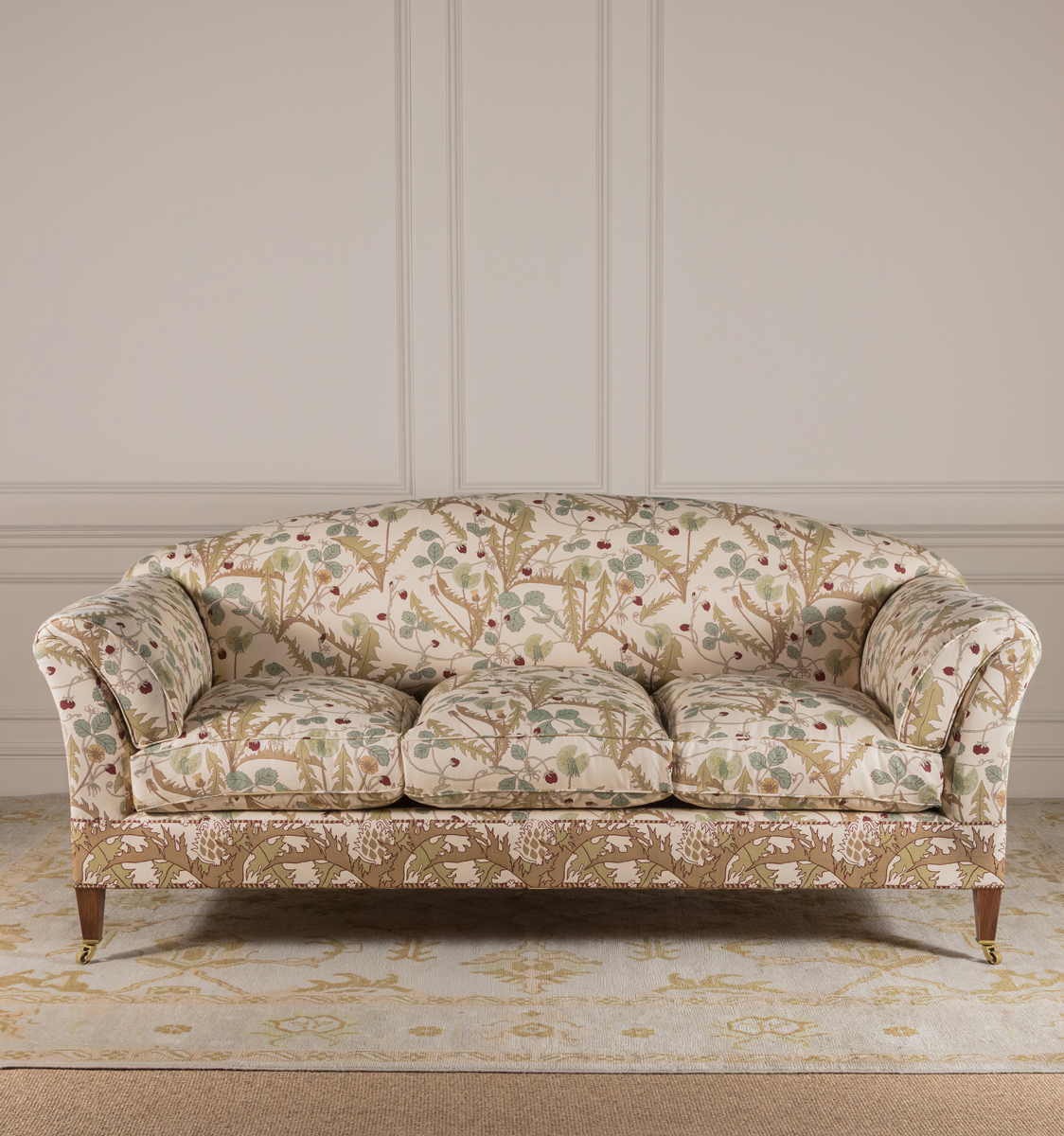 A large deep seated sofa with a beech frame and traditional construction and upholstery with our proprietary, integral down and feather arm and seat cushions, square tapered legs made of oak or walnut in three finishes ( mahogany, mid-oak, mid-walnut) and custom brass castors.