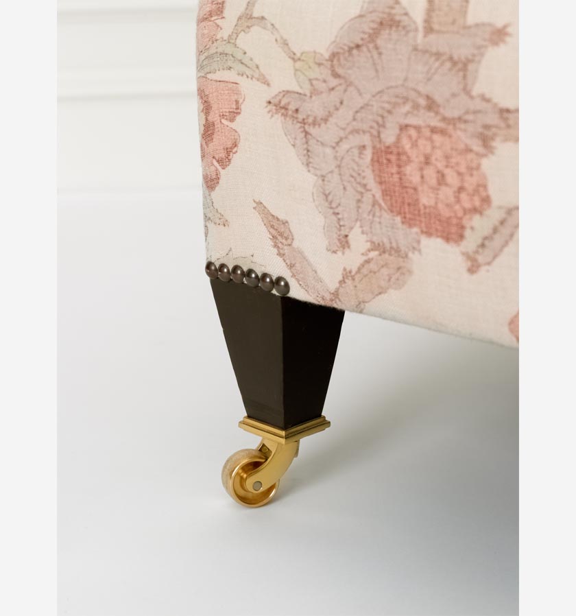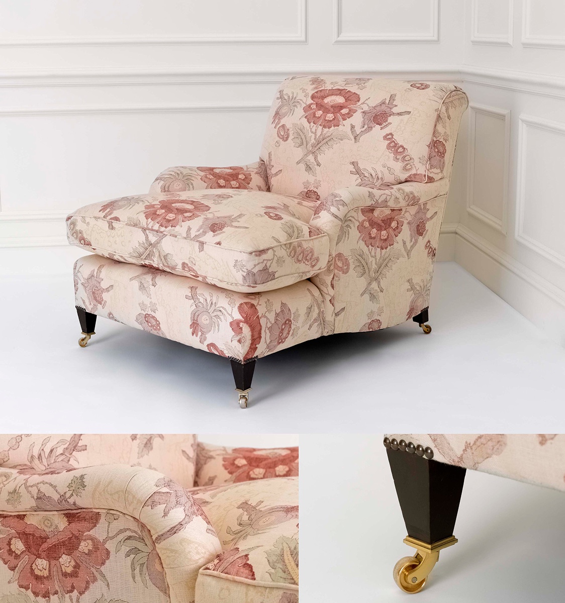 A generously proportioned armchair with a beech frame, traditional construction and upholstery with down and feather cushions, square tapered legs and brass castors. Legs are shown here in a mahogany finish. Can be paired with a Savernake Run-up stool. Shown here upholstered with a valance in the Robert Kime Collection Versailles and Opium Poppy Mid Fade fabric. The Savernake chair can be upholstered in the Robert Kime fabric of your choice.