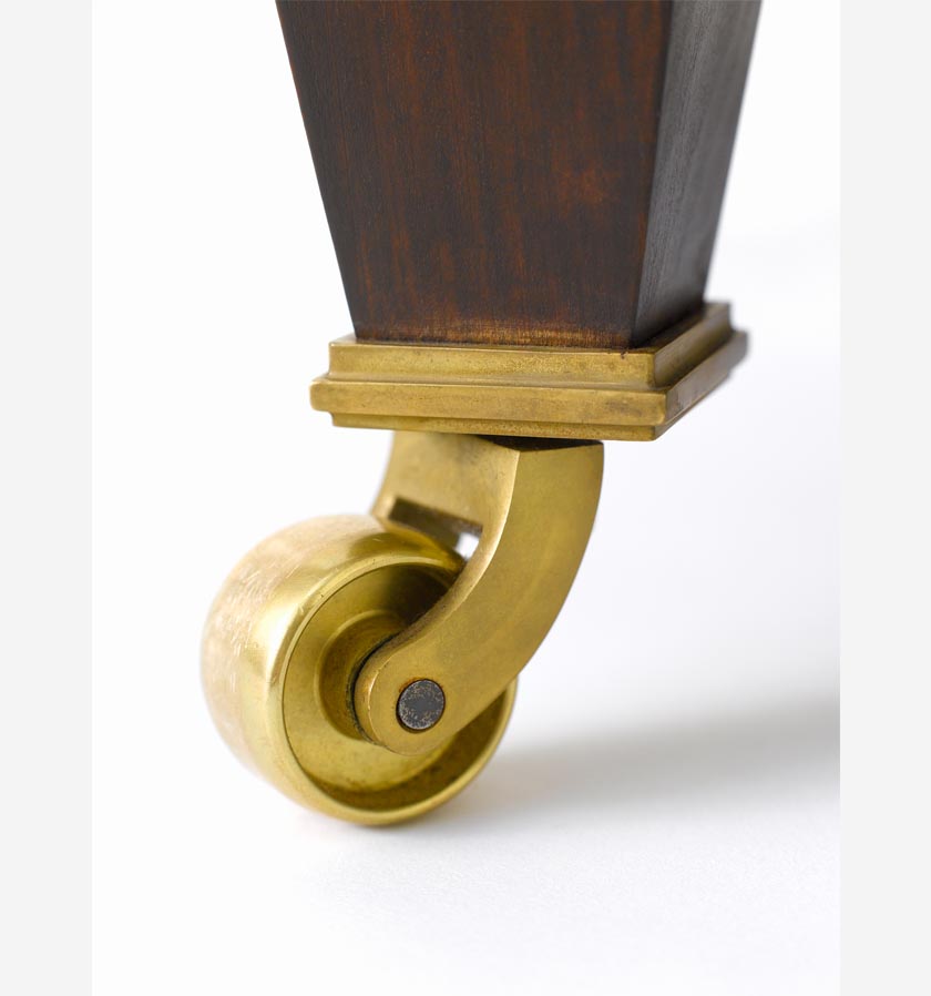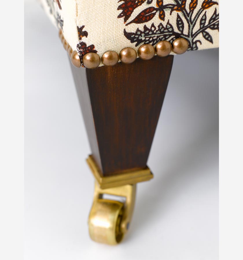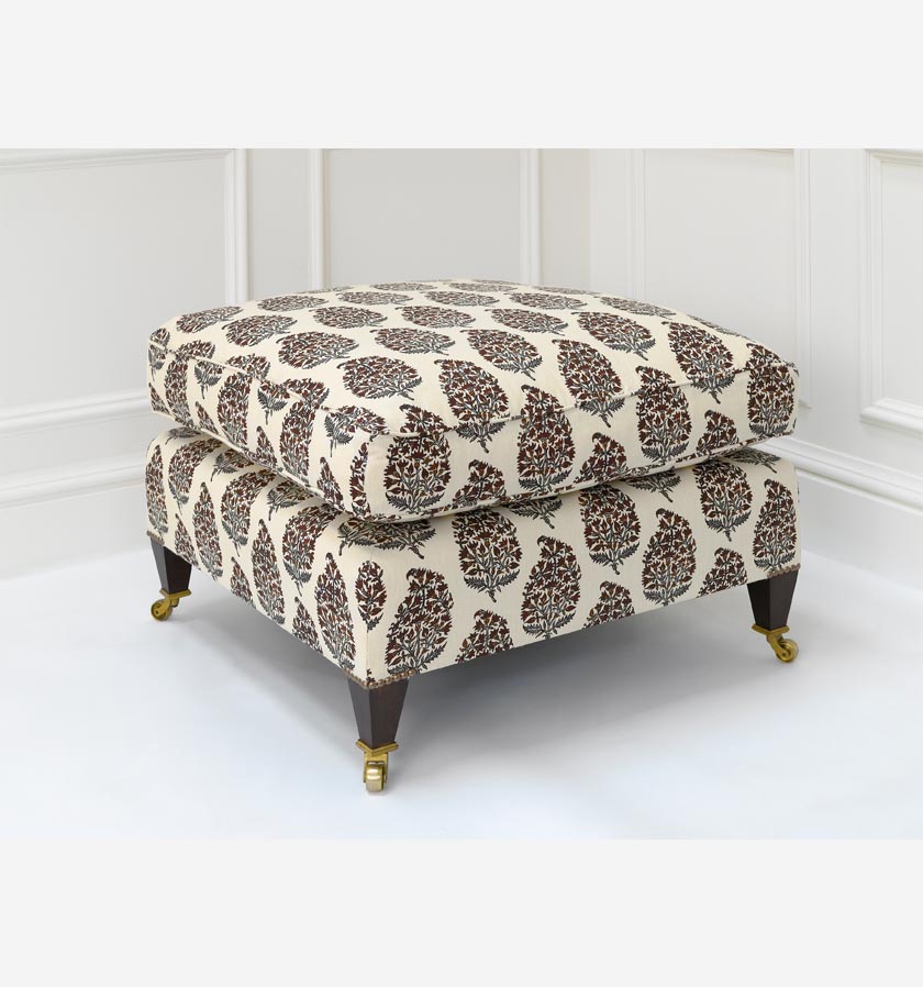 A companion piece to the Savernake Chairs, traditionally constructed and upholstered with down-filled cushions and brass castors. The stool is available in small, medium and large. Shown here upholstered in Robert Kime Collection Indian Pear Red on Cream. The Savernake Run-up Stool can be upholstered in the Robert Kime fabric of your choice.