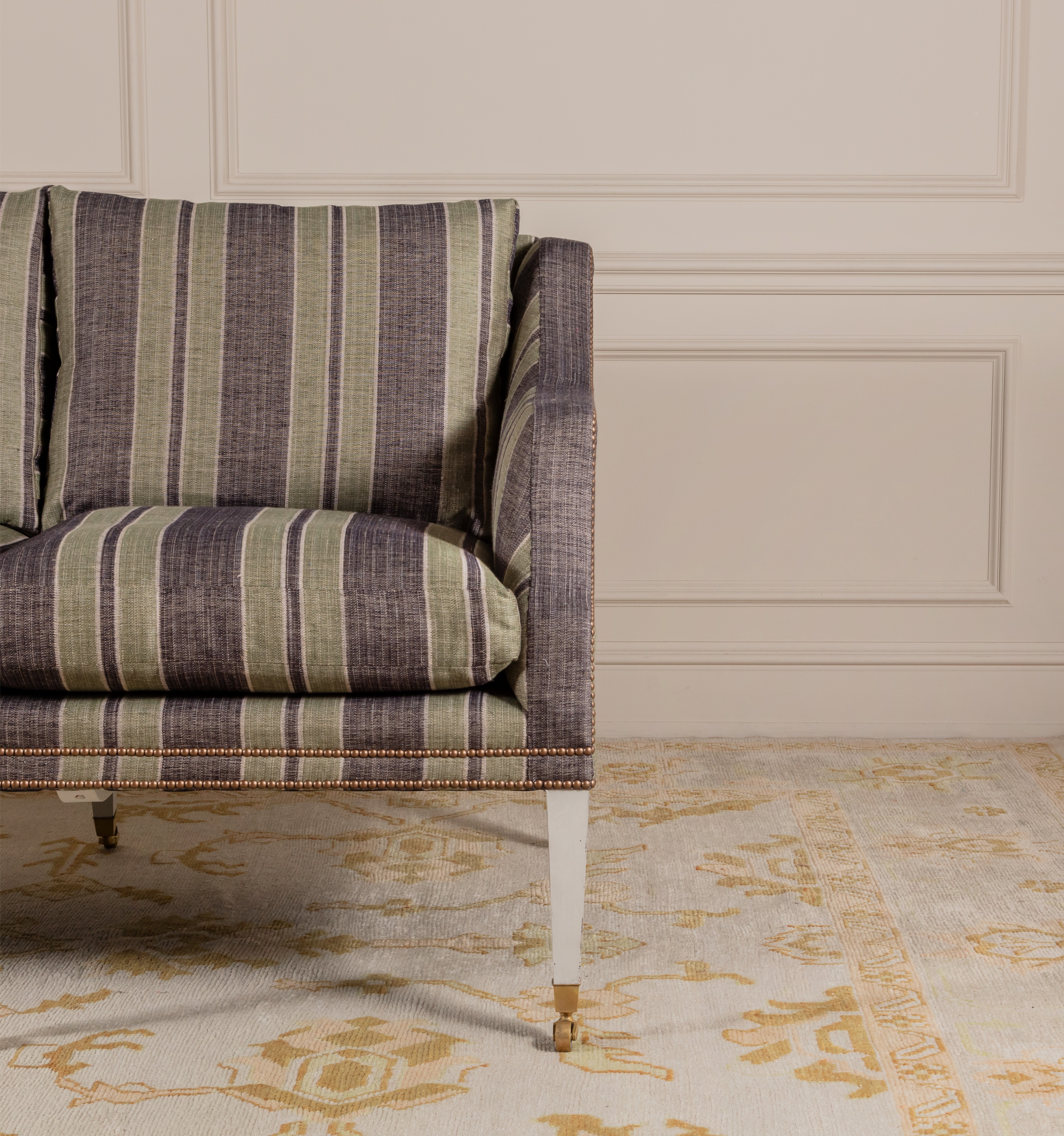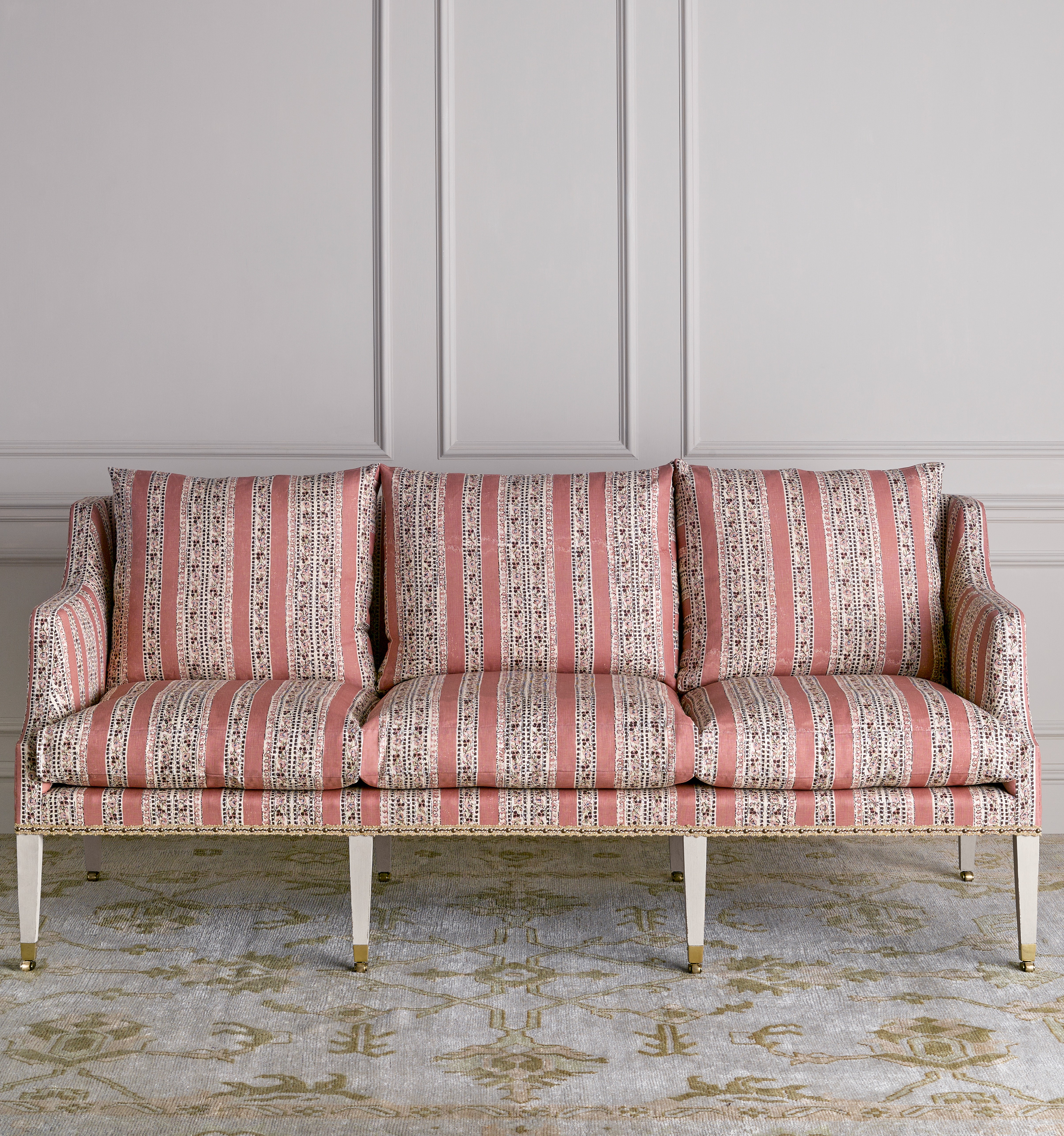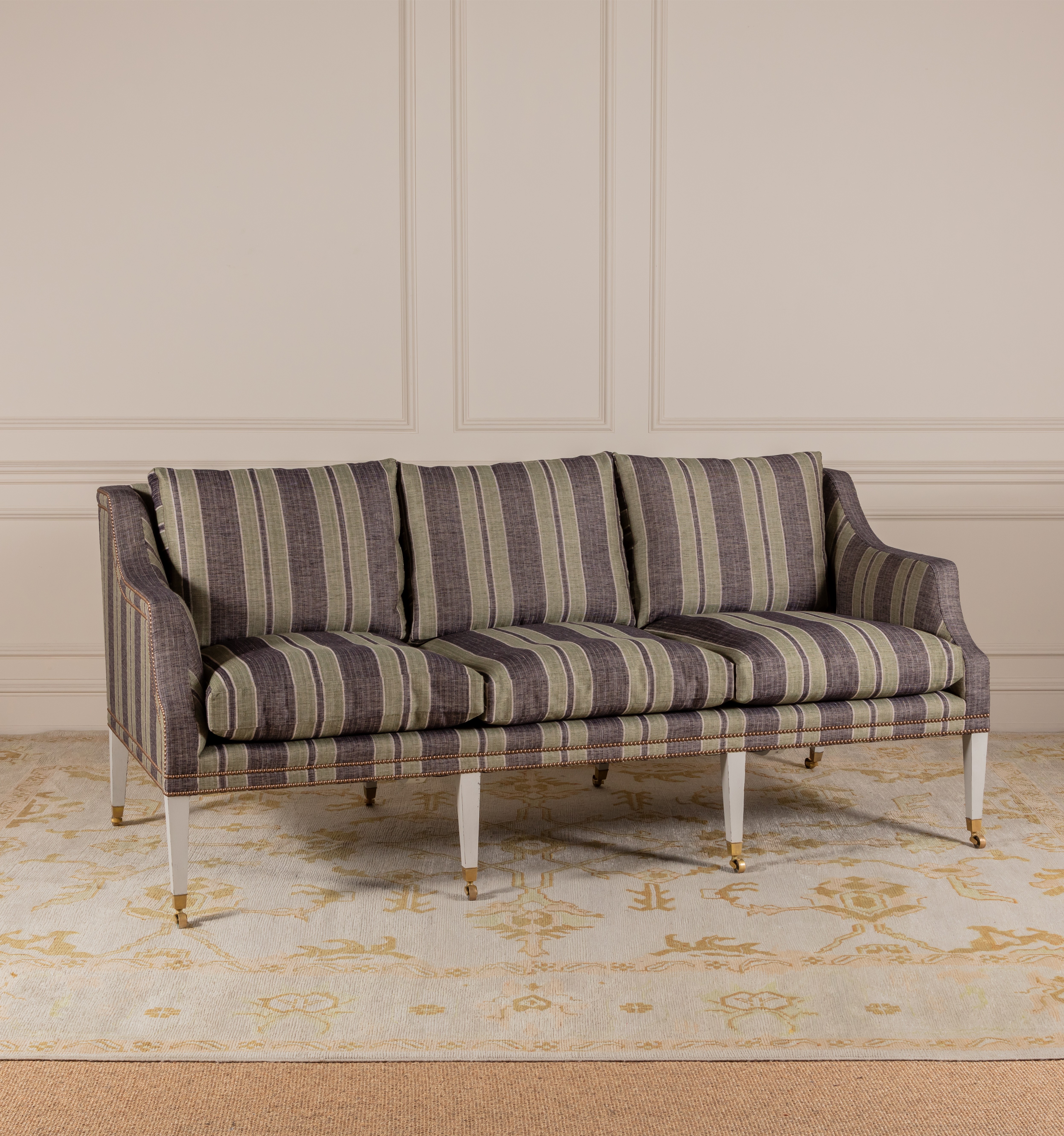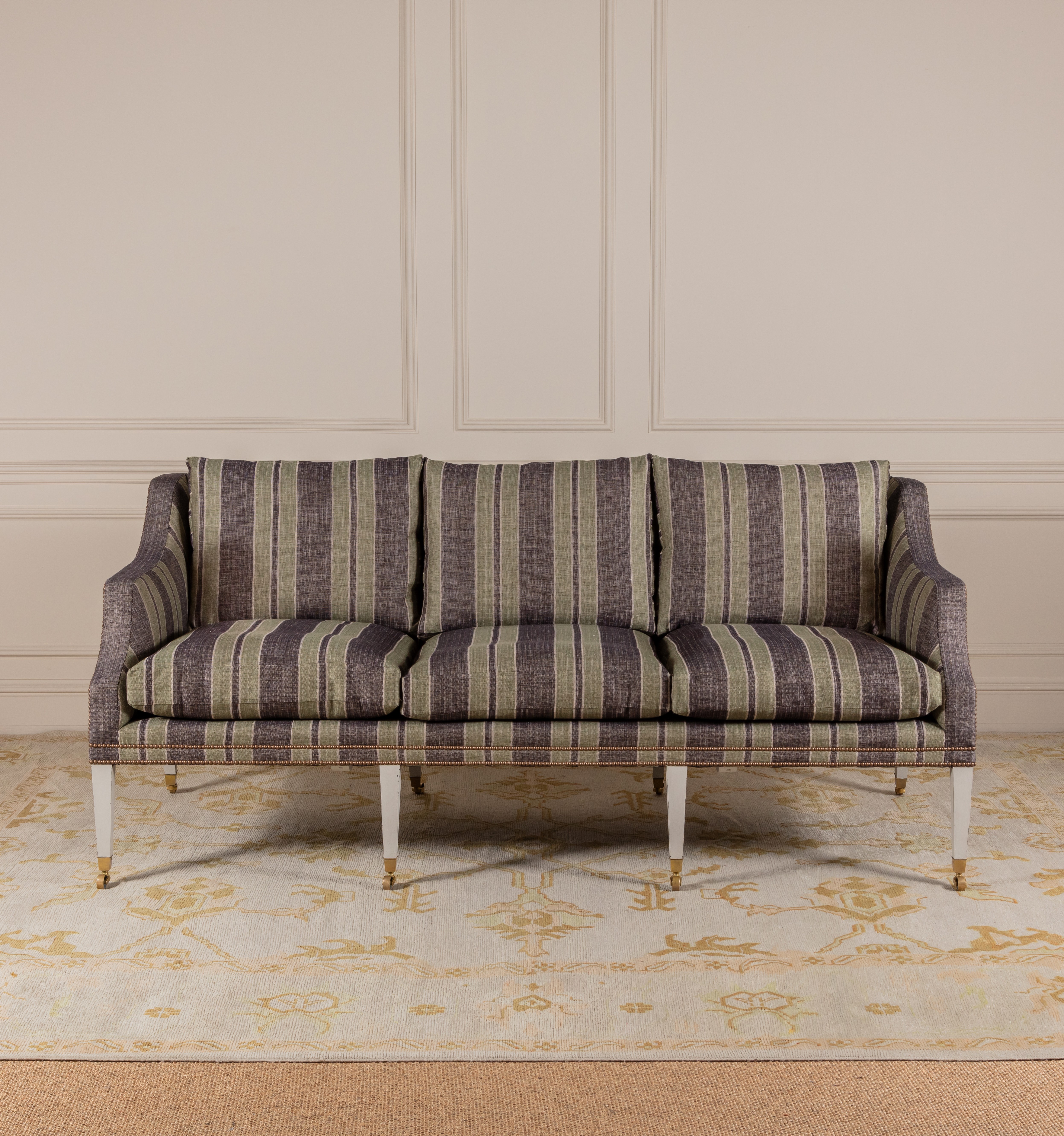 An adaptation of a 19th C sofa, with a beech frame, traditional construction and upholstery with down and feather cushions, square tapered hand-painted legs and brass castors. The wood is PEFC & FSC certified. Shown here upholstered in the Robert Kime Collection Mori and Ashoka Stripe fabric. The Silbury Sofa can be upholstered in the Robert Kime fabric of your choice.