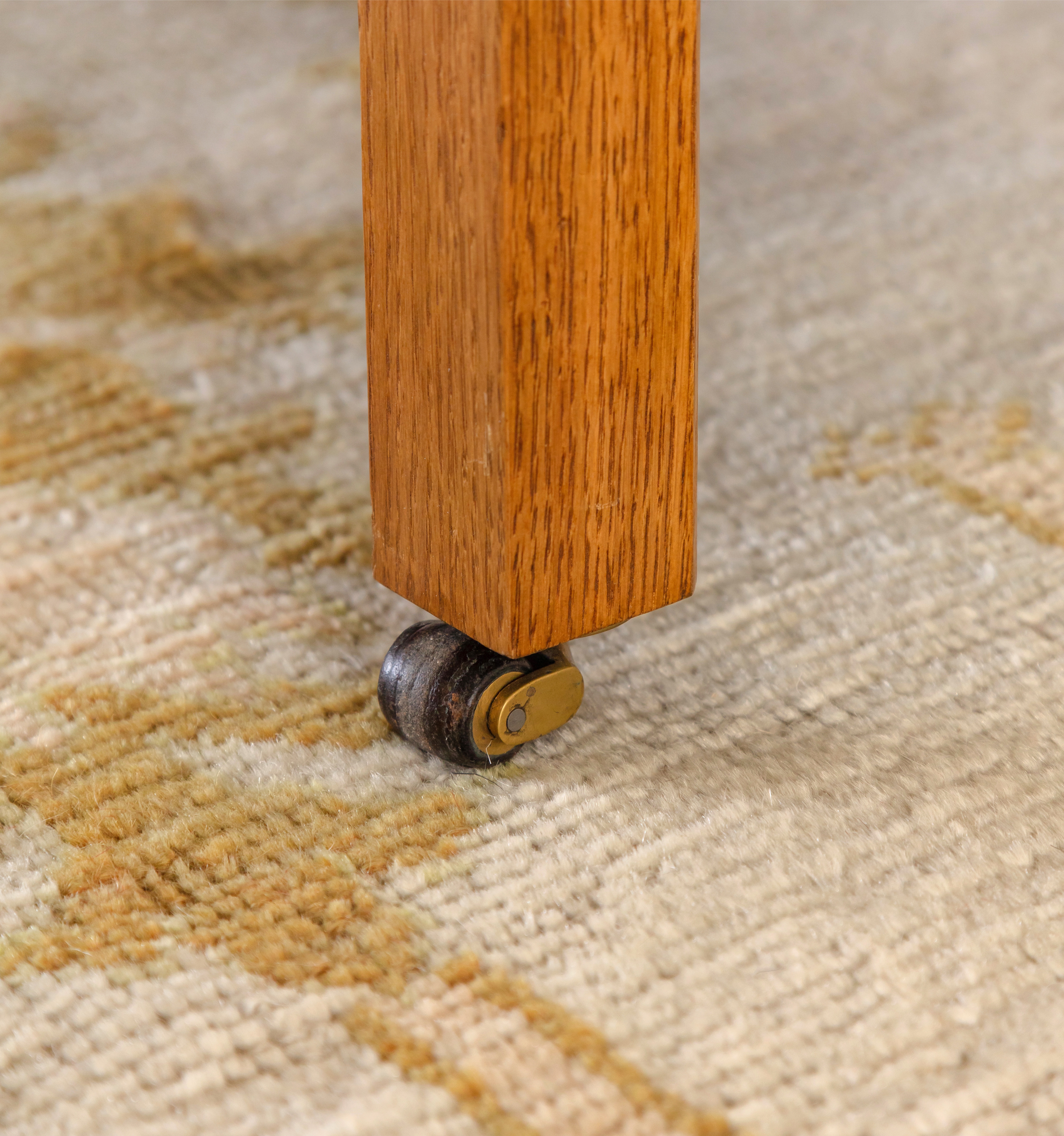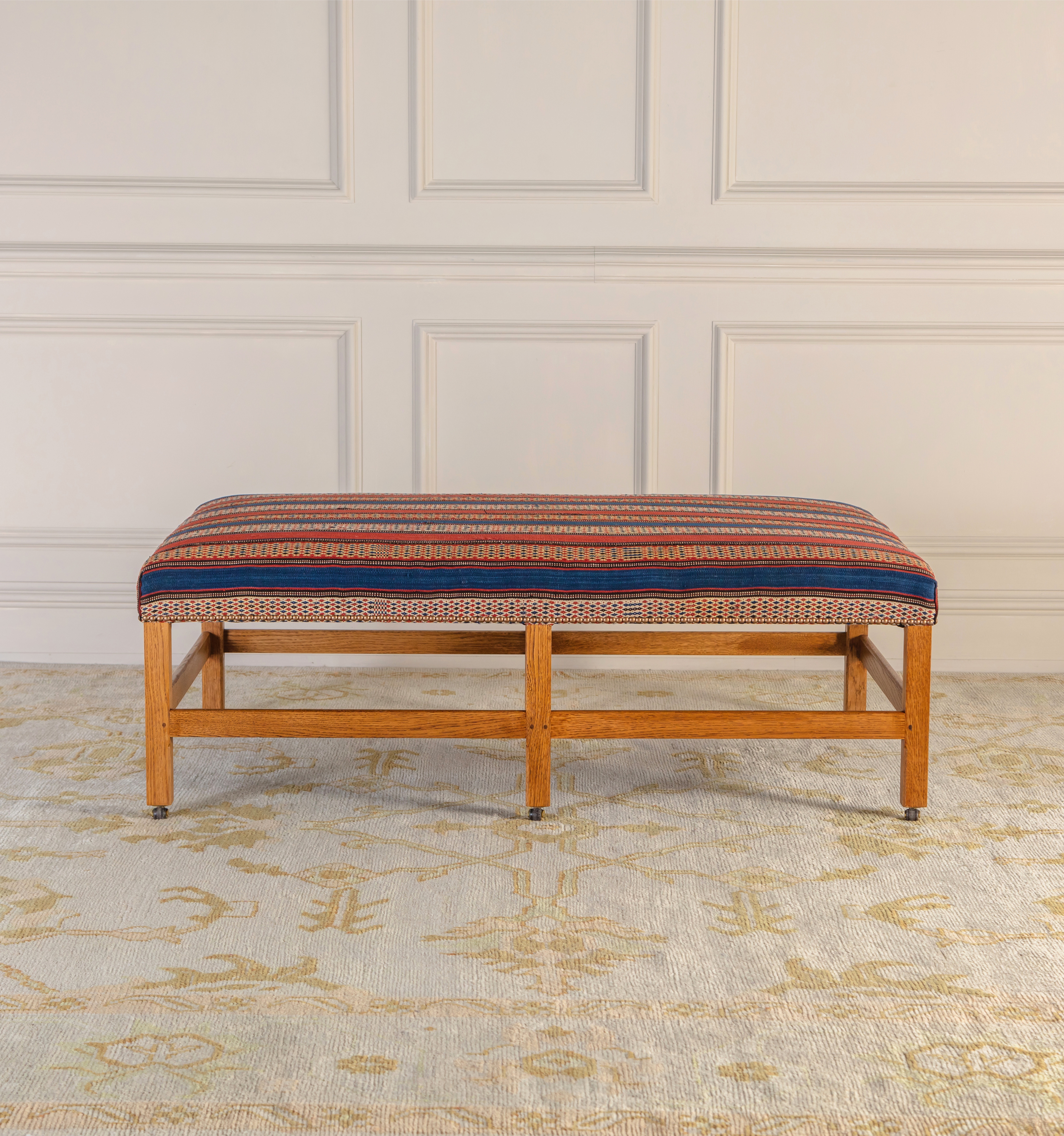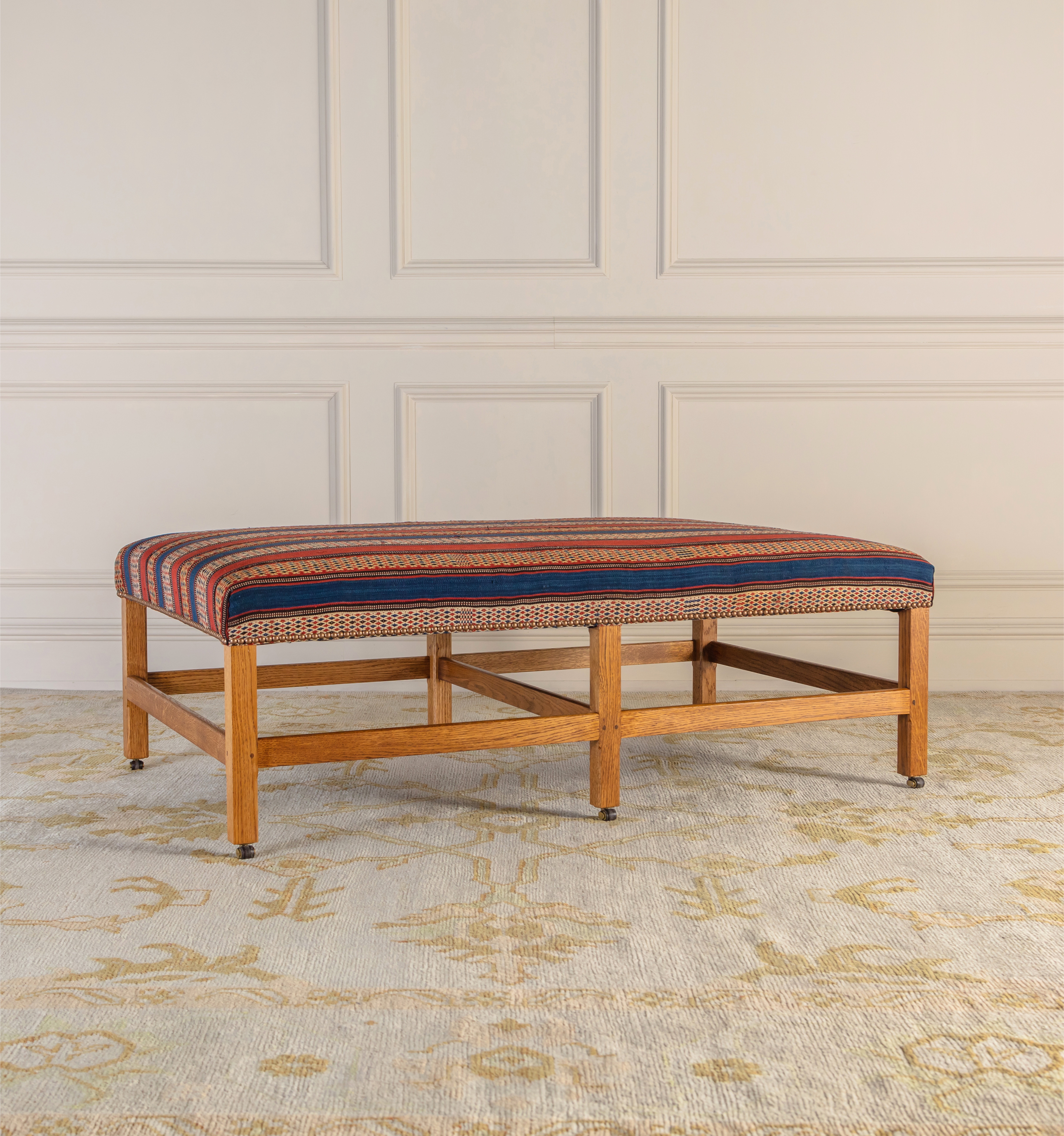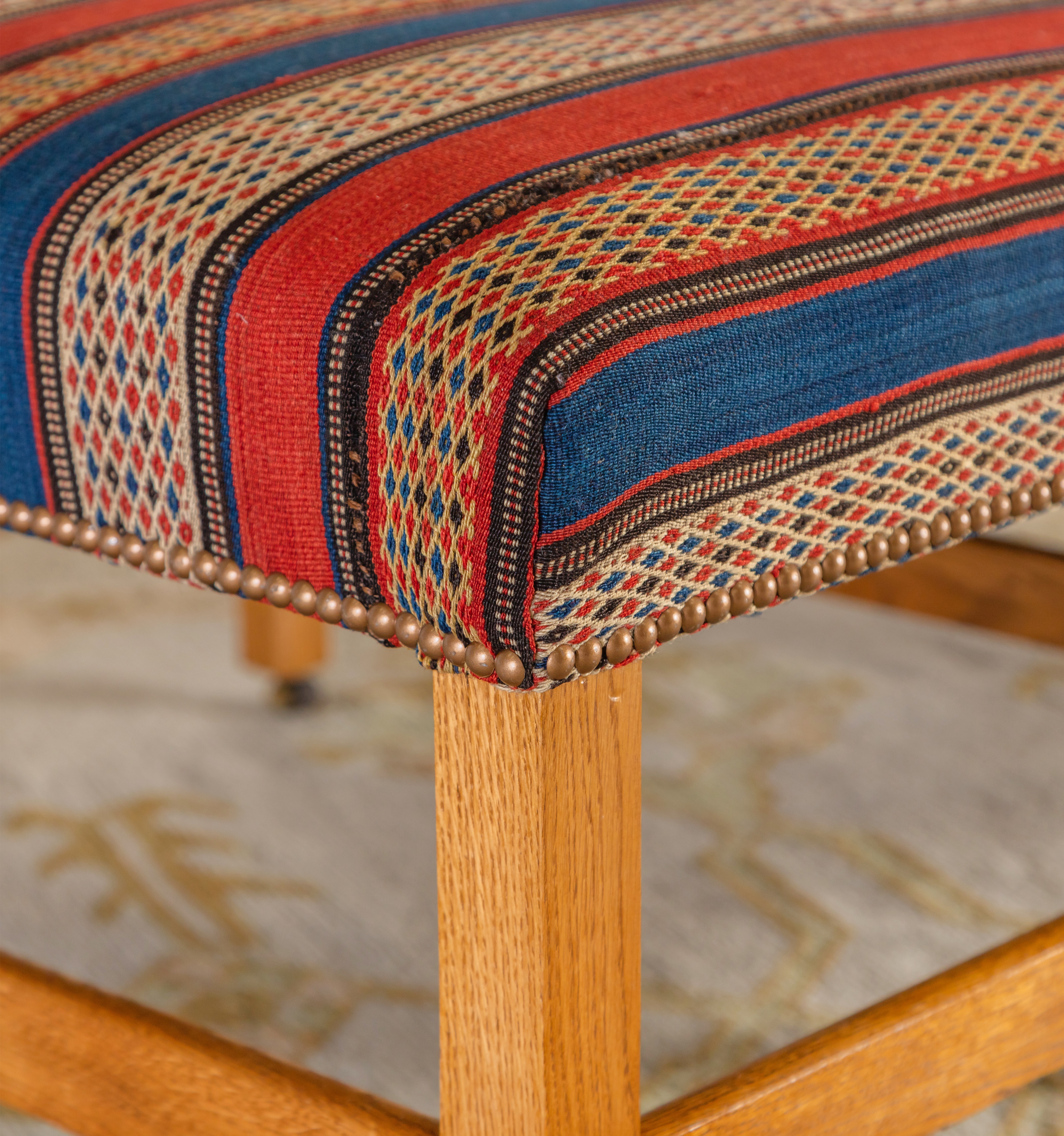 A traditionally constructed and upholstered stool with a close nailed finish, oak legs and leather wheeled castors. This stool can be upholstered in any Robert Kime fabric of your choice. Shown here, upholstered in an antique fabric.