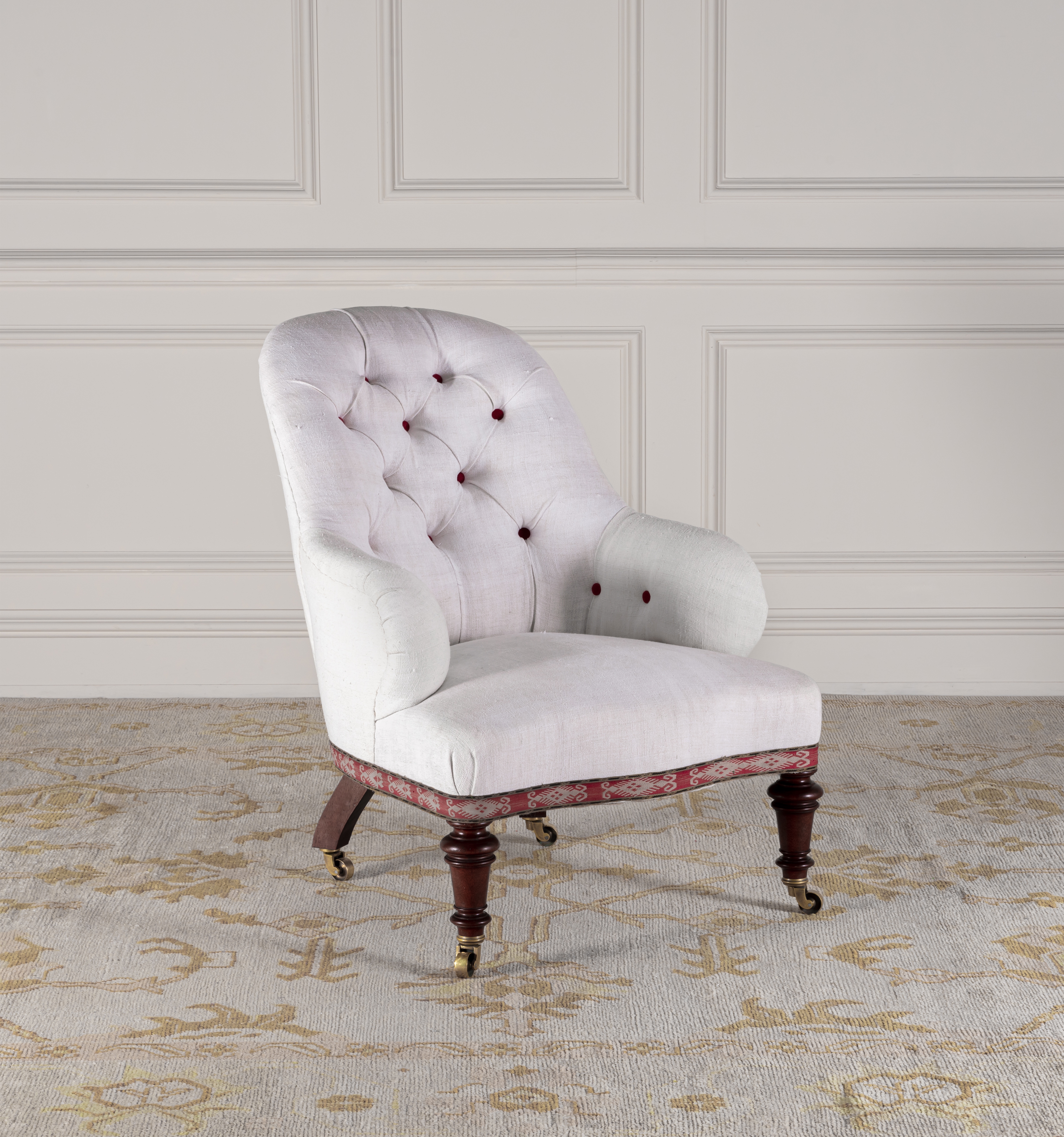 Shown here upholstered in antique French linen and trim. The Stitchcombe chair can be upholstered in the Robert Kime fabric of your choice.