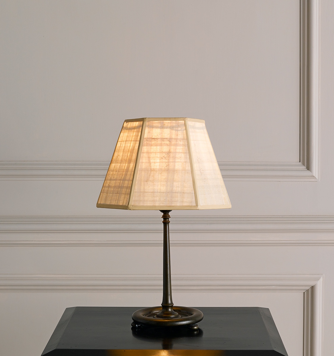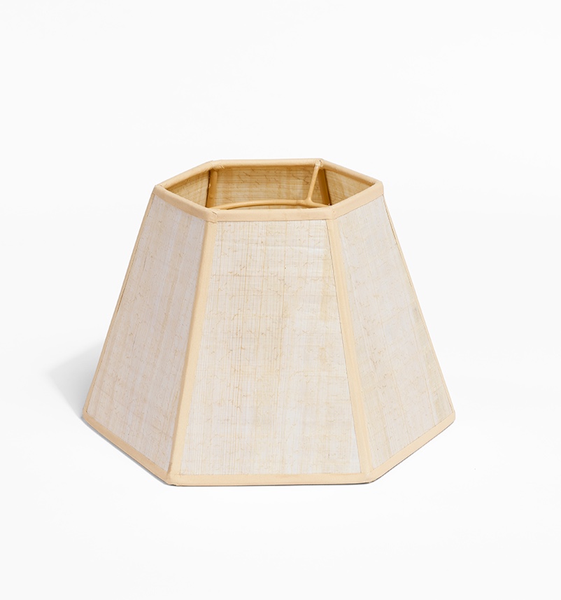 Crisp hexagonal shade made from papyrus. Papyrus is a natural product therefore it may vary in shading, texture and grain, which is part of its beauty. The papyrus may react to changes in temperature. This lampshade is handmade in England.
