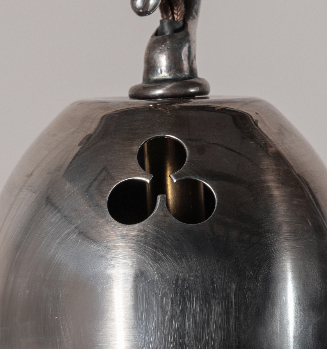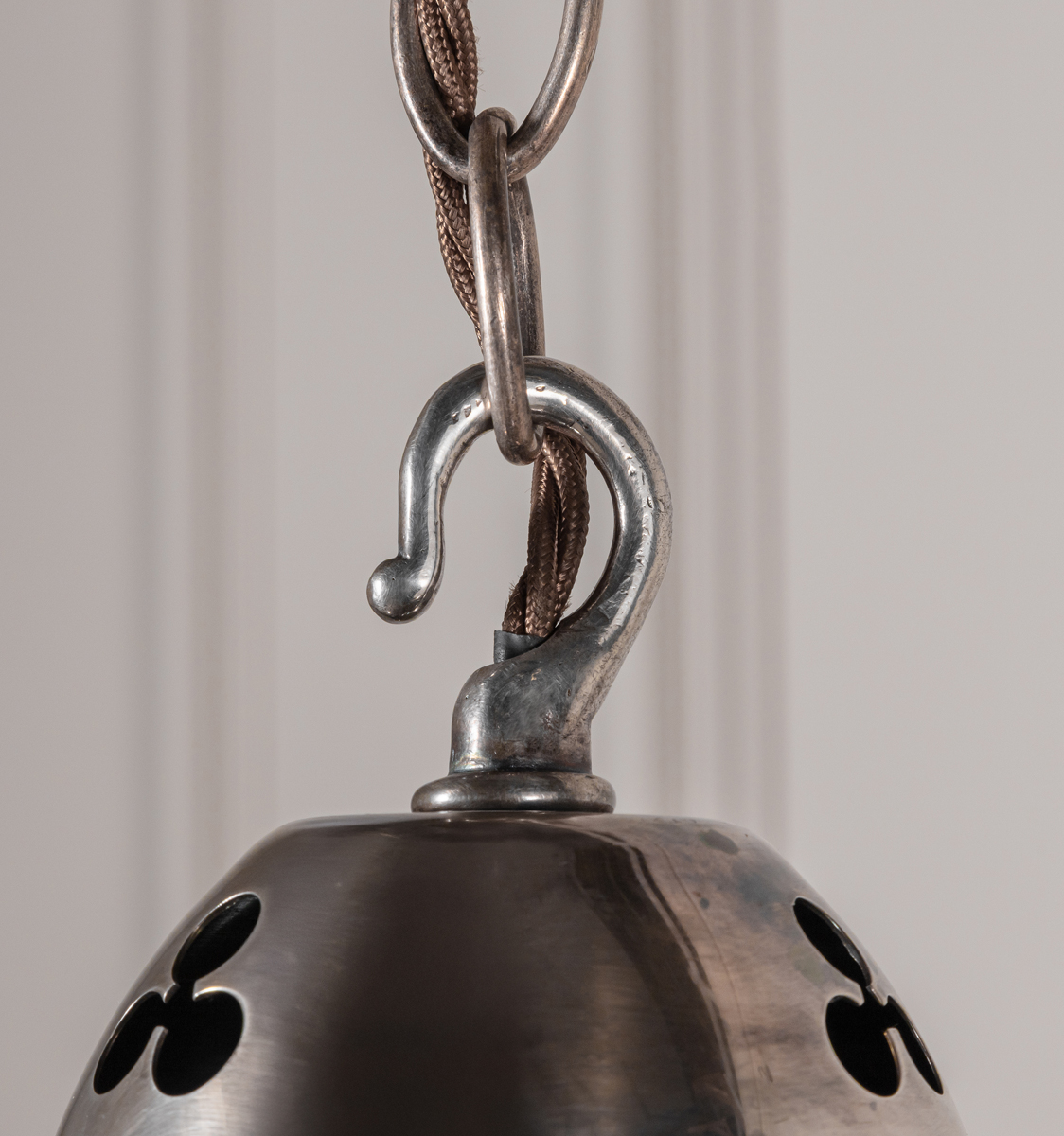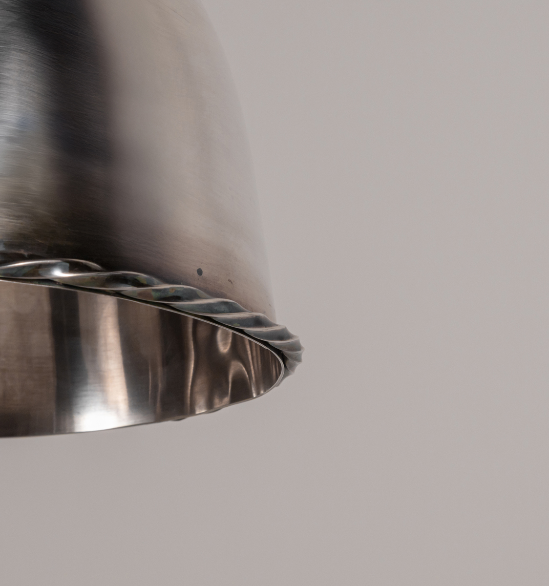A spun brass helmet lamp with trefoil detail. Shown here in silvered brass, and also available in an antique brass finish.