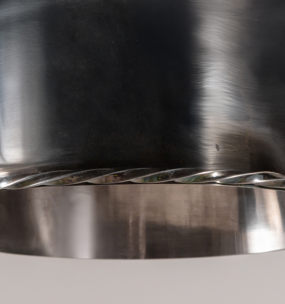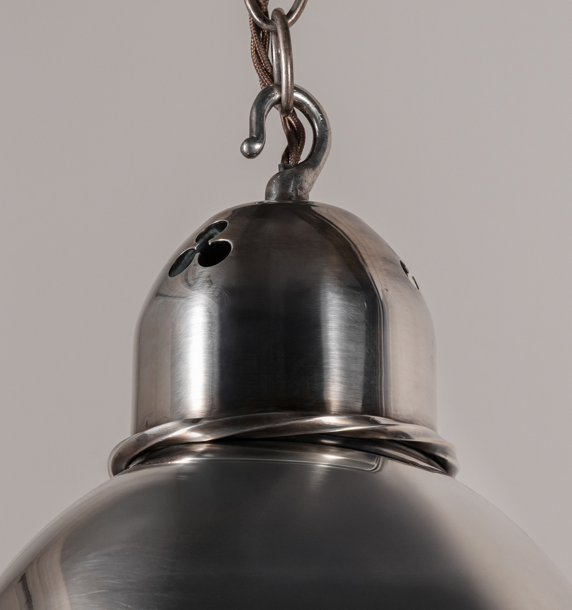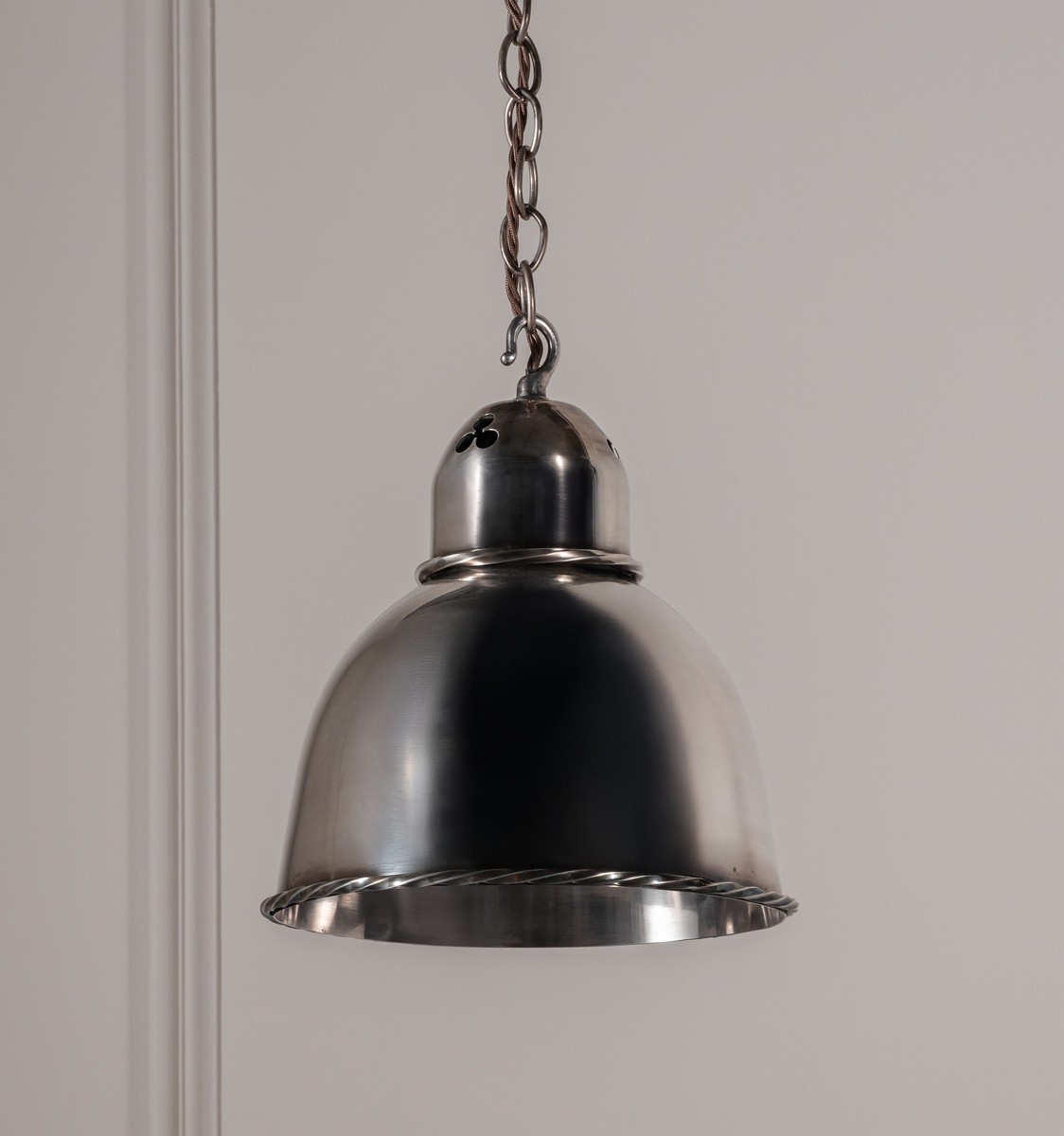 A spun brass helmet lamp with trefoil detail. Shown here in silvered brass, and also available in an antique brass finish.