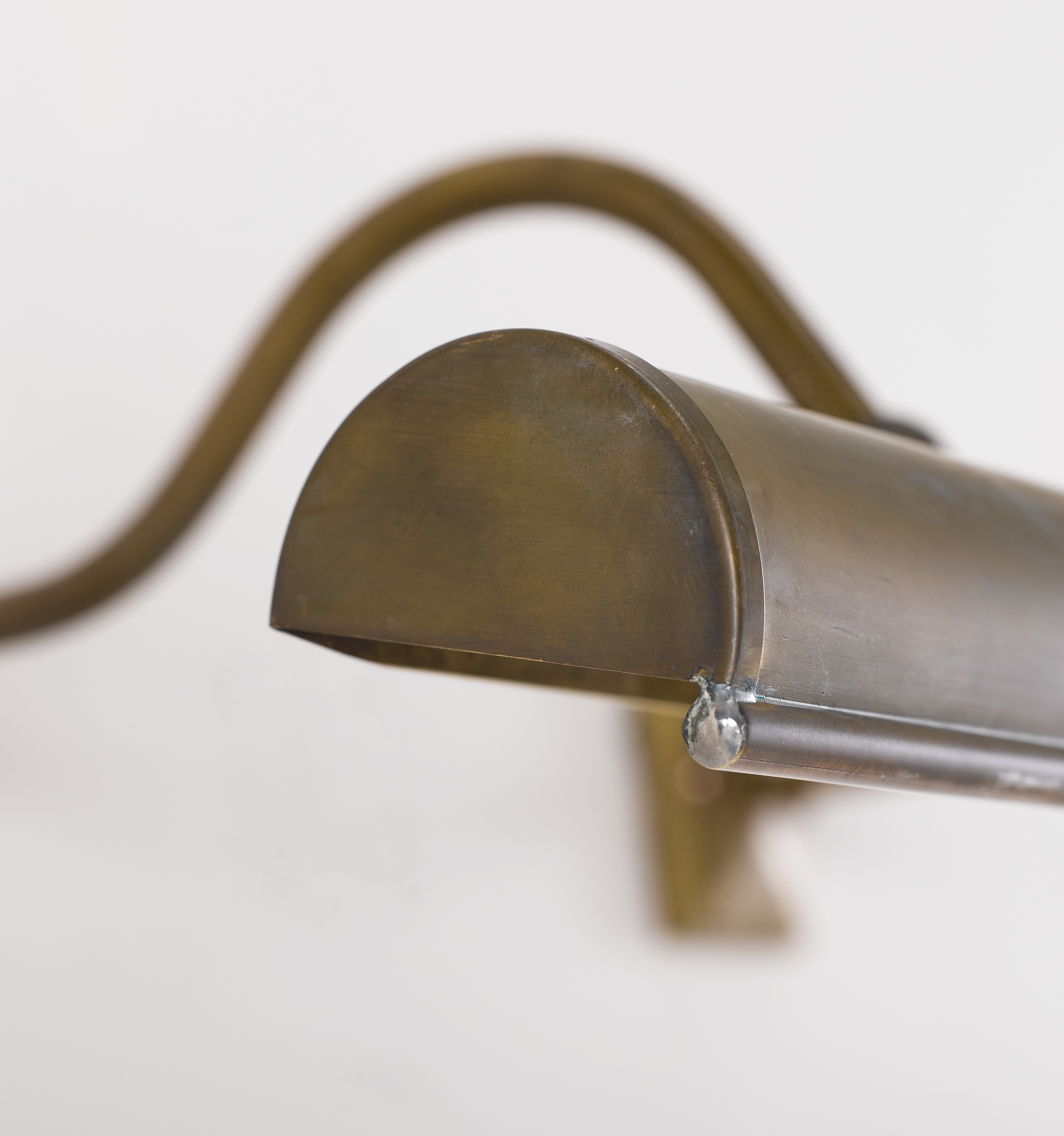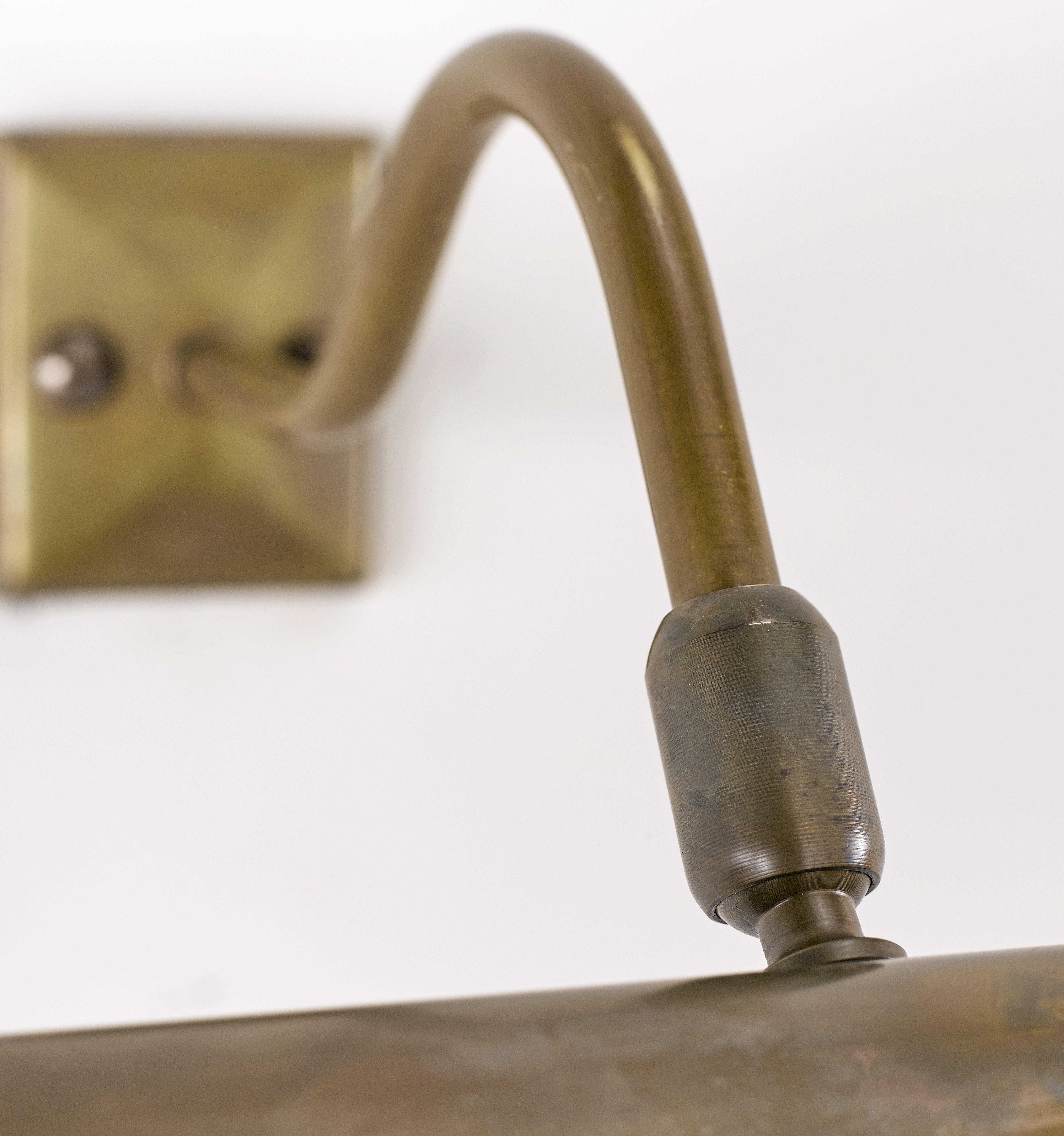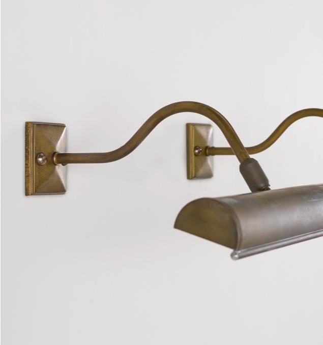 A large classic picture light with two arms and swivel heads, designed to be attached to either a picture frame or to be wall mounted. The fifth image shows a Picture Light frame mounted, which is several years old, the brass has darkened naturally.