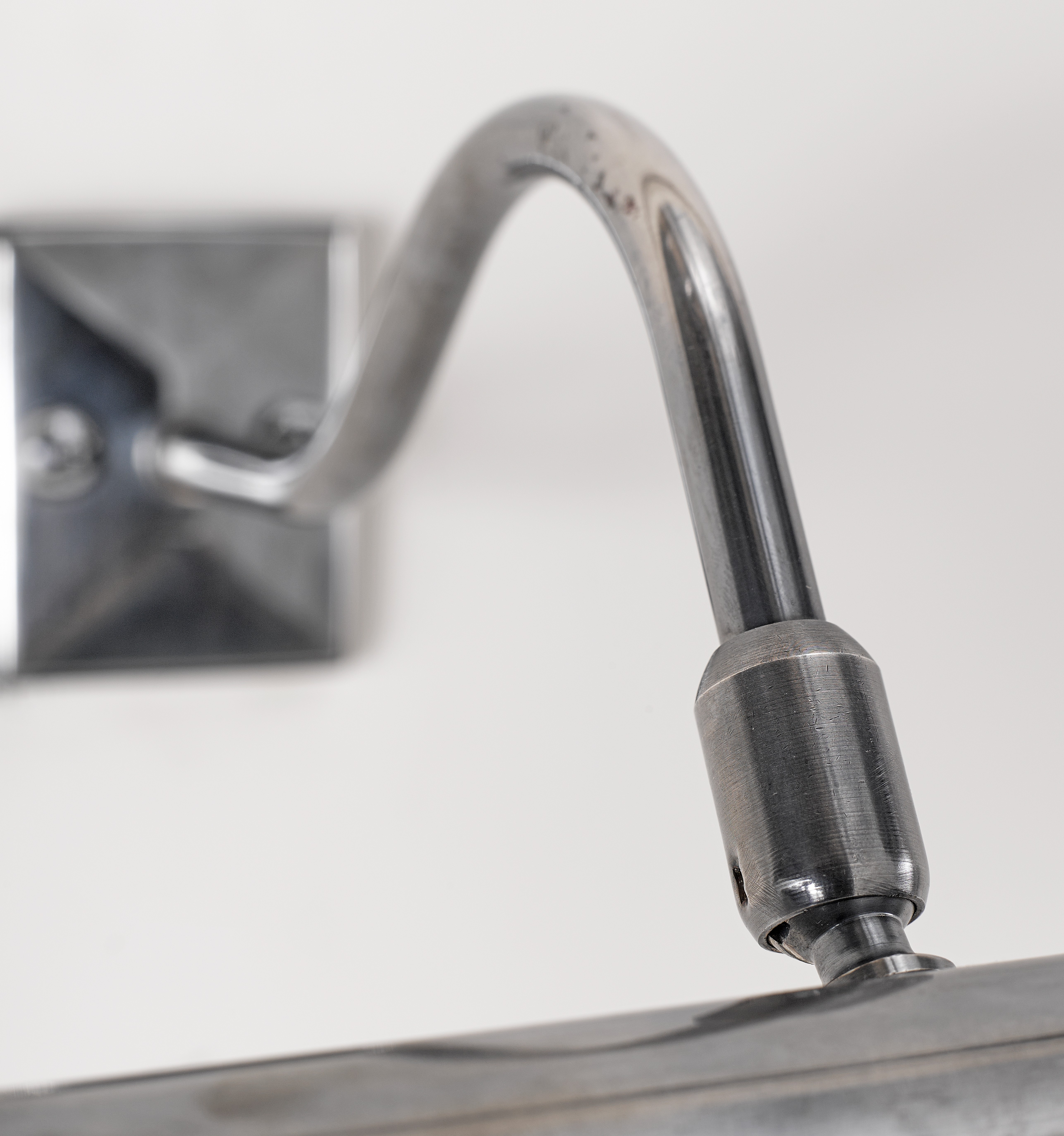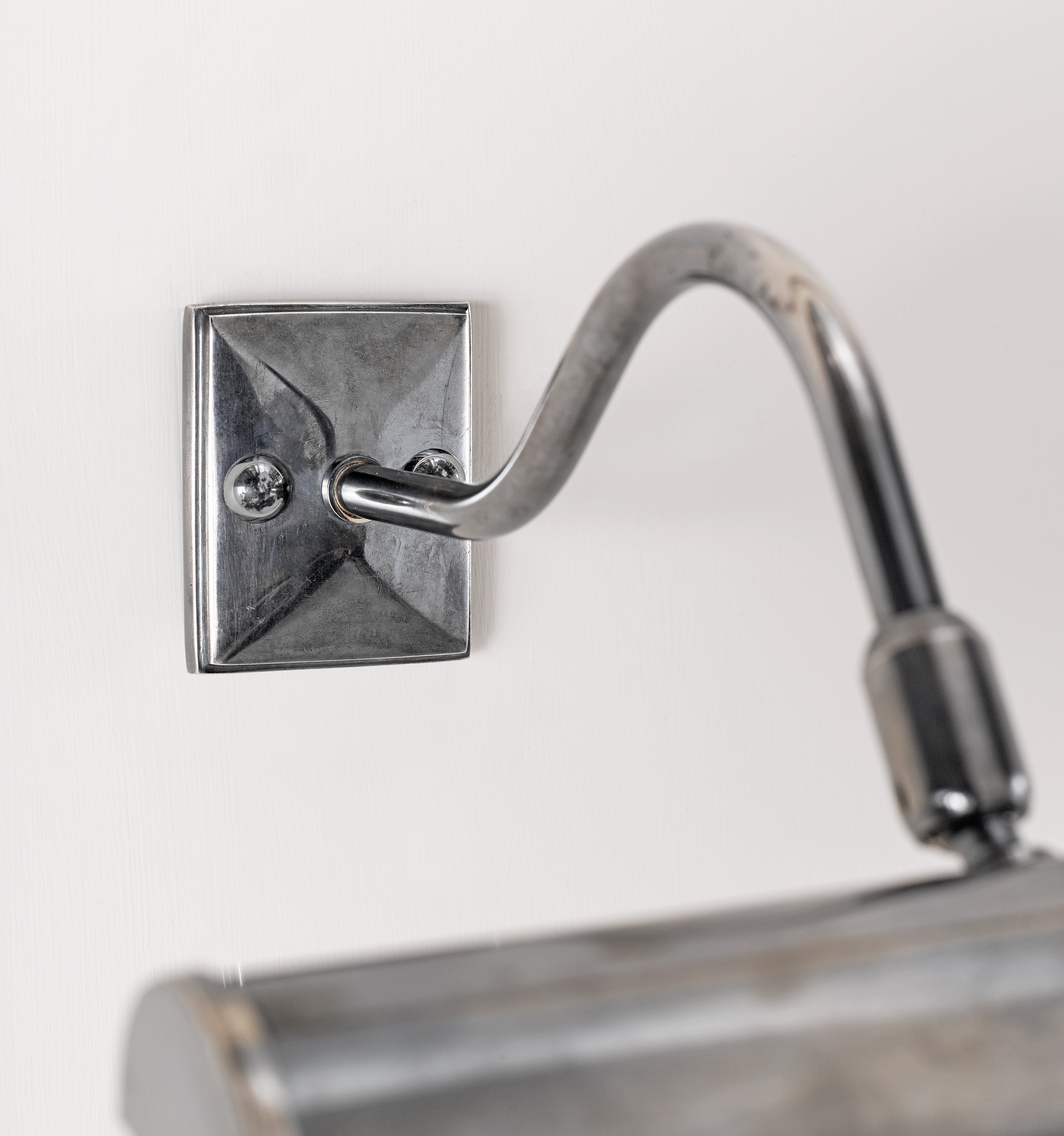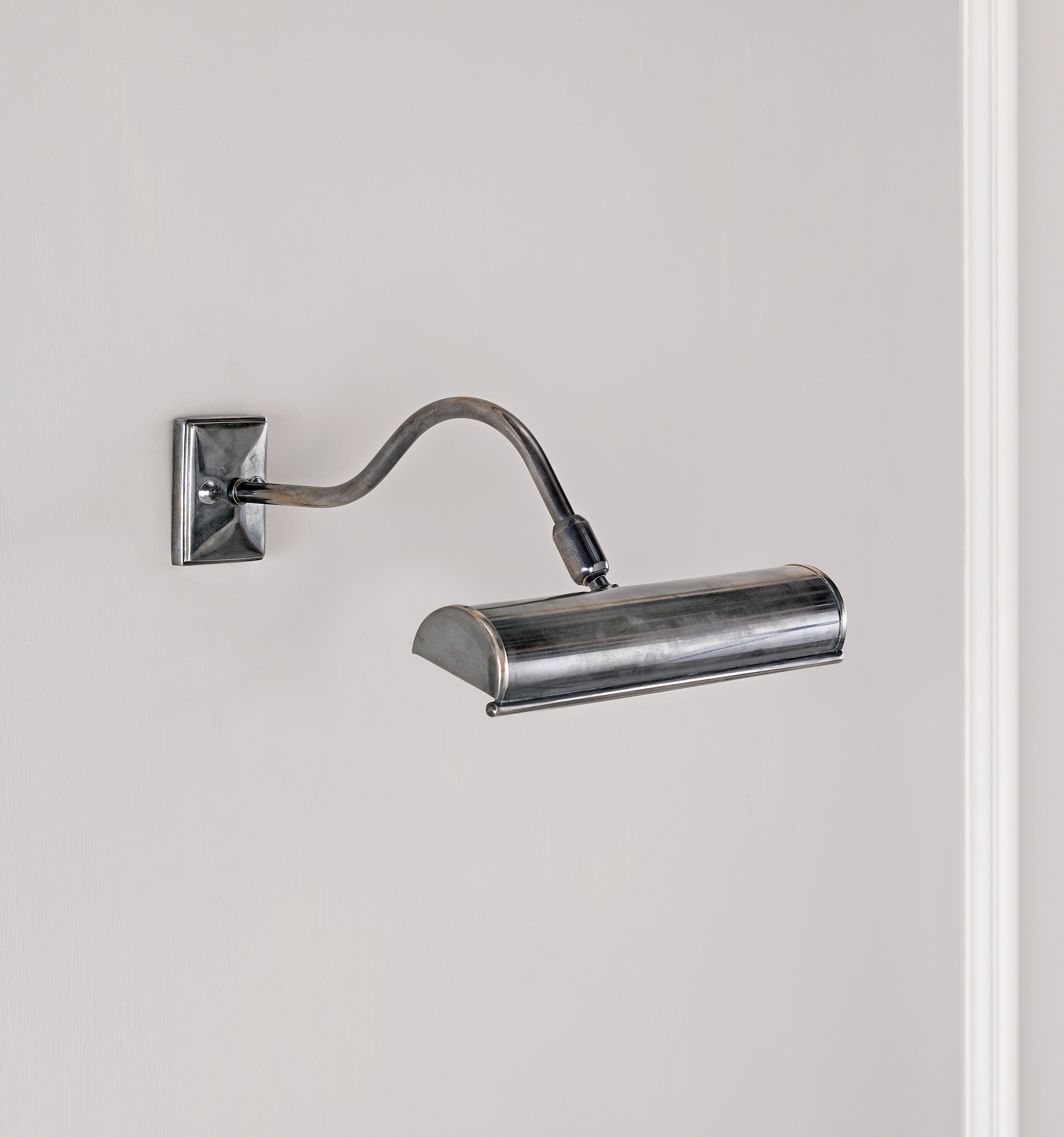 A classic picture light with swivel head, designed to be attached to either a picture frame or to be wall mounted. Shown here wall mounted.