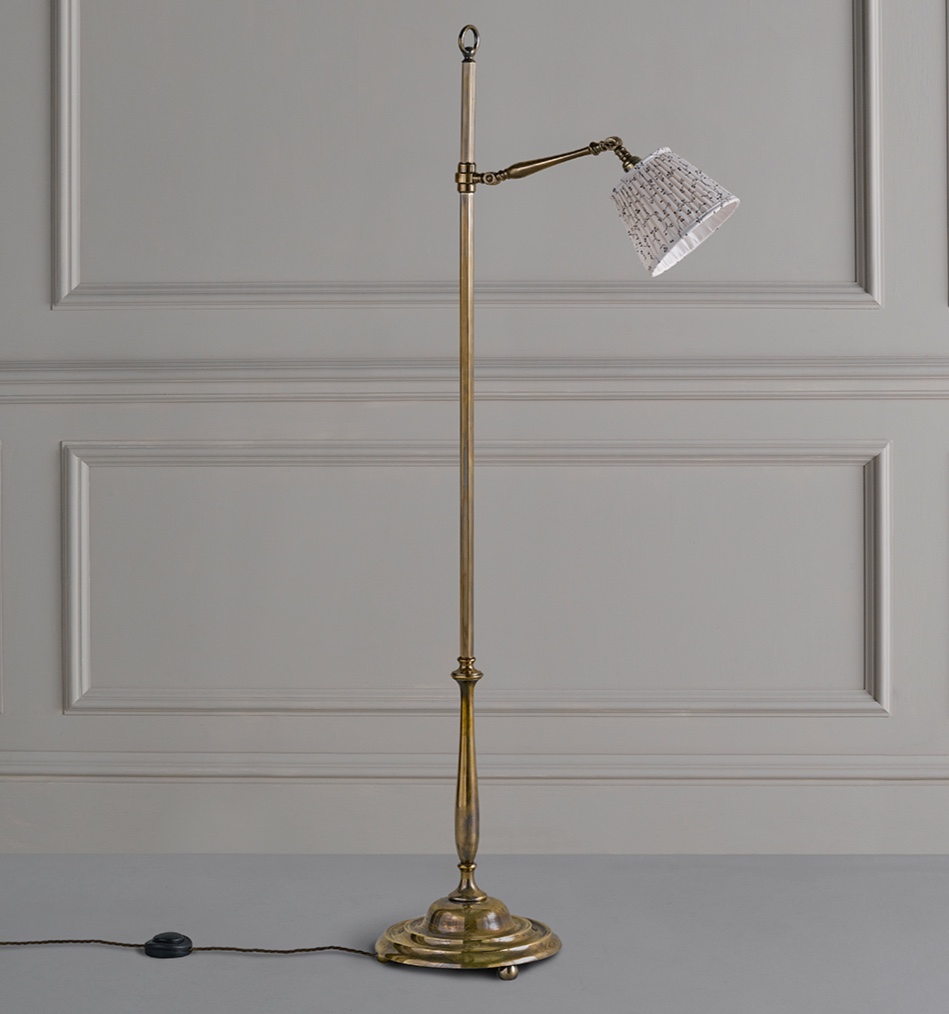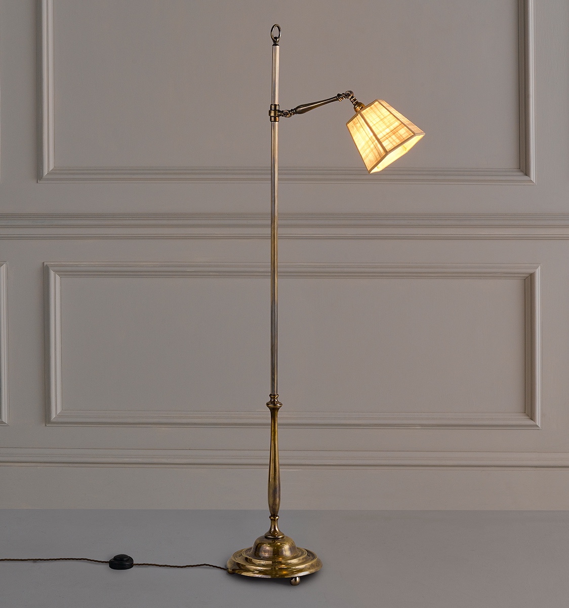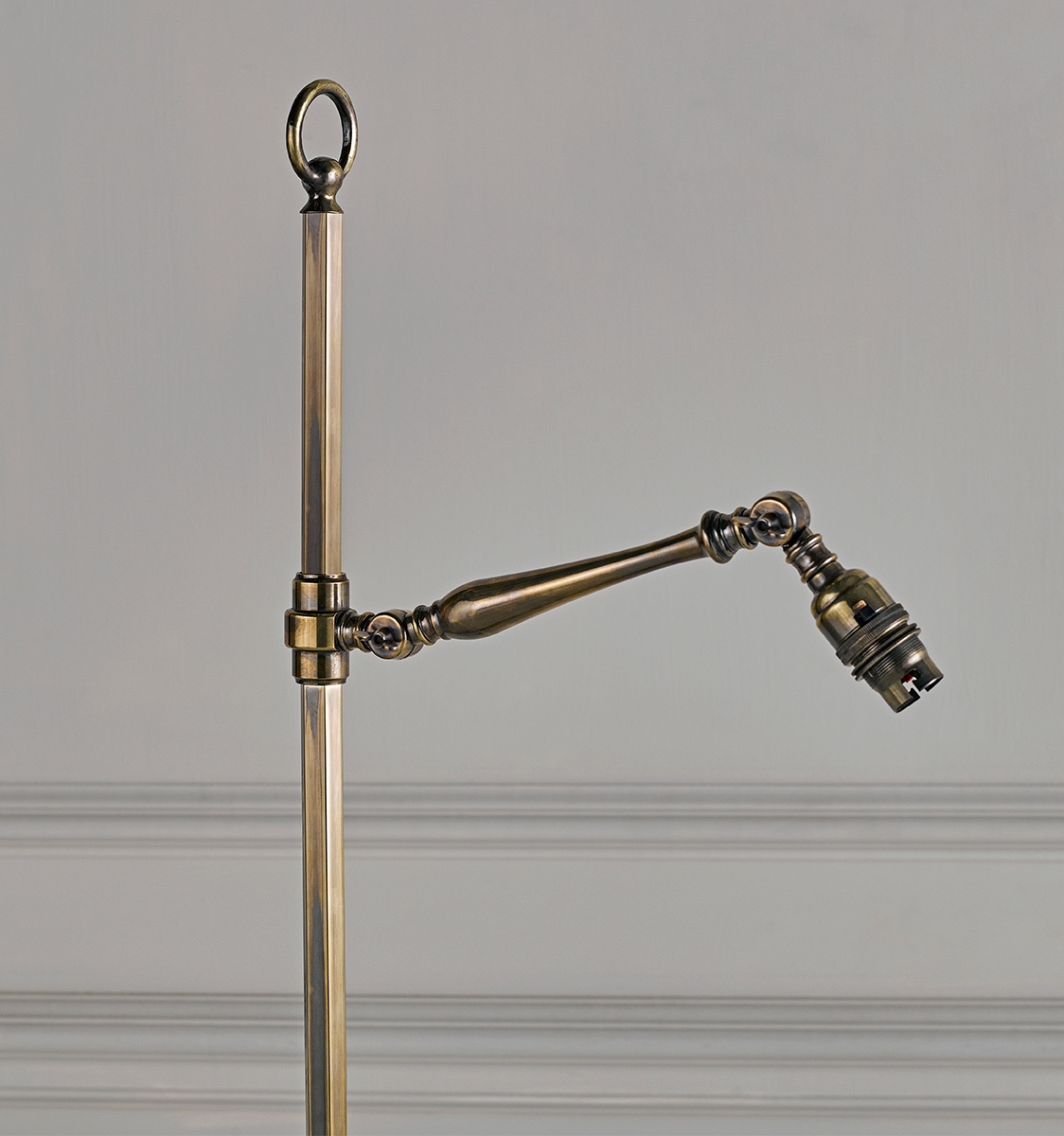 A sophisticated lamp with an adjustable arm and hexagonal shaft rising from a moulded base. Shown here with a 7" papyrus shade and a Robert Kime fabric shade in Firle. Lampshades are sold separately, please visit our lampshade section.