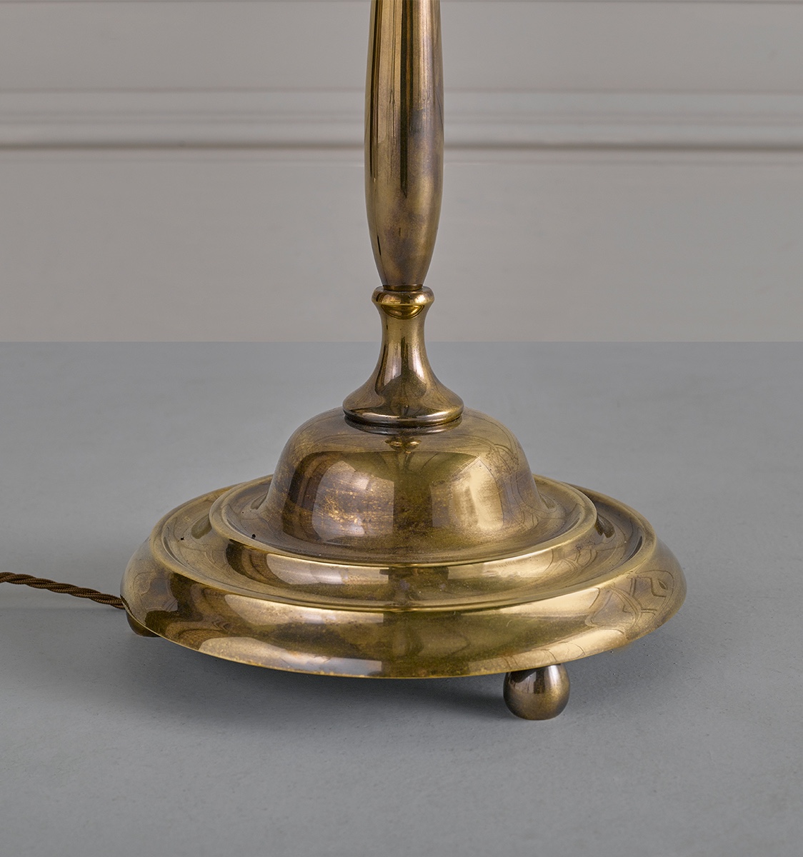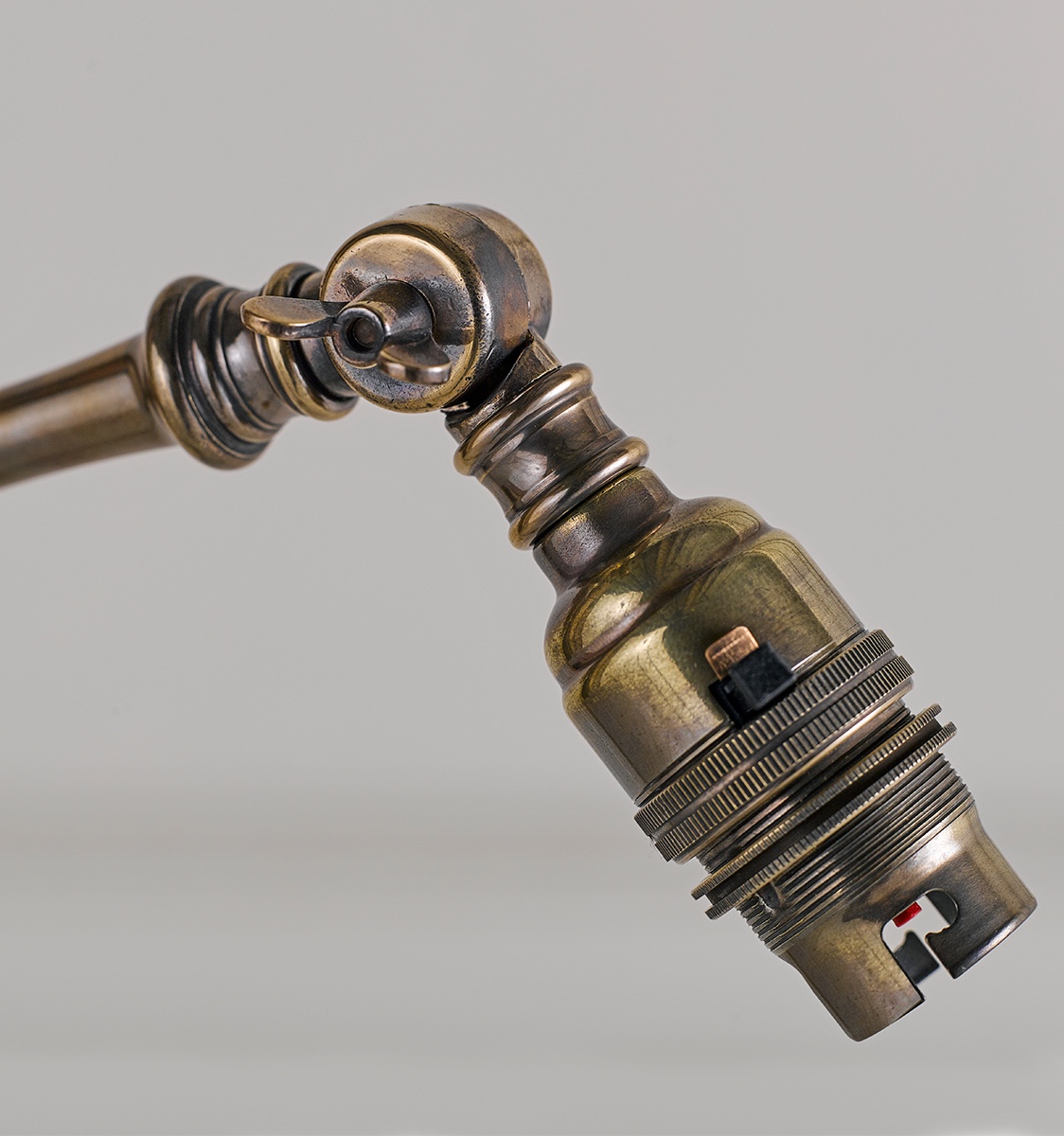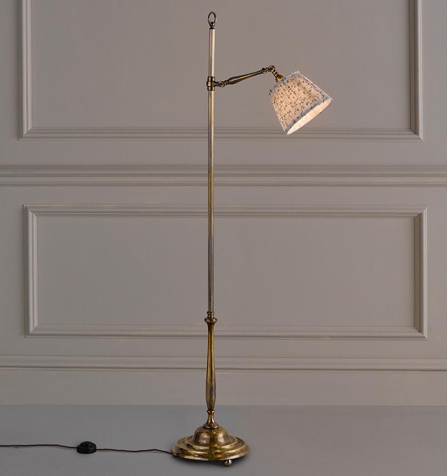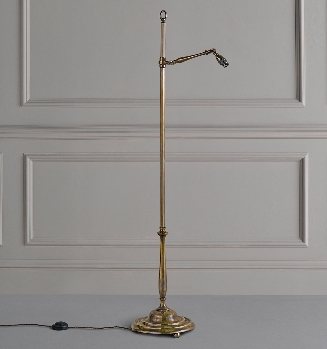 A sophisticated lamp with an adjustable arm and hexagonal shaft rising from a moulded base. Shown here with a 7" papyrus shade and a Robert Kime fabric shade in Firle. Lampshades are sold separately, please visit our lampshade section.