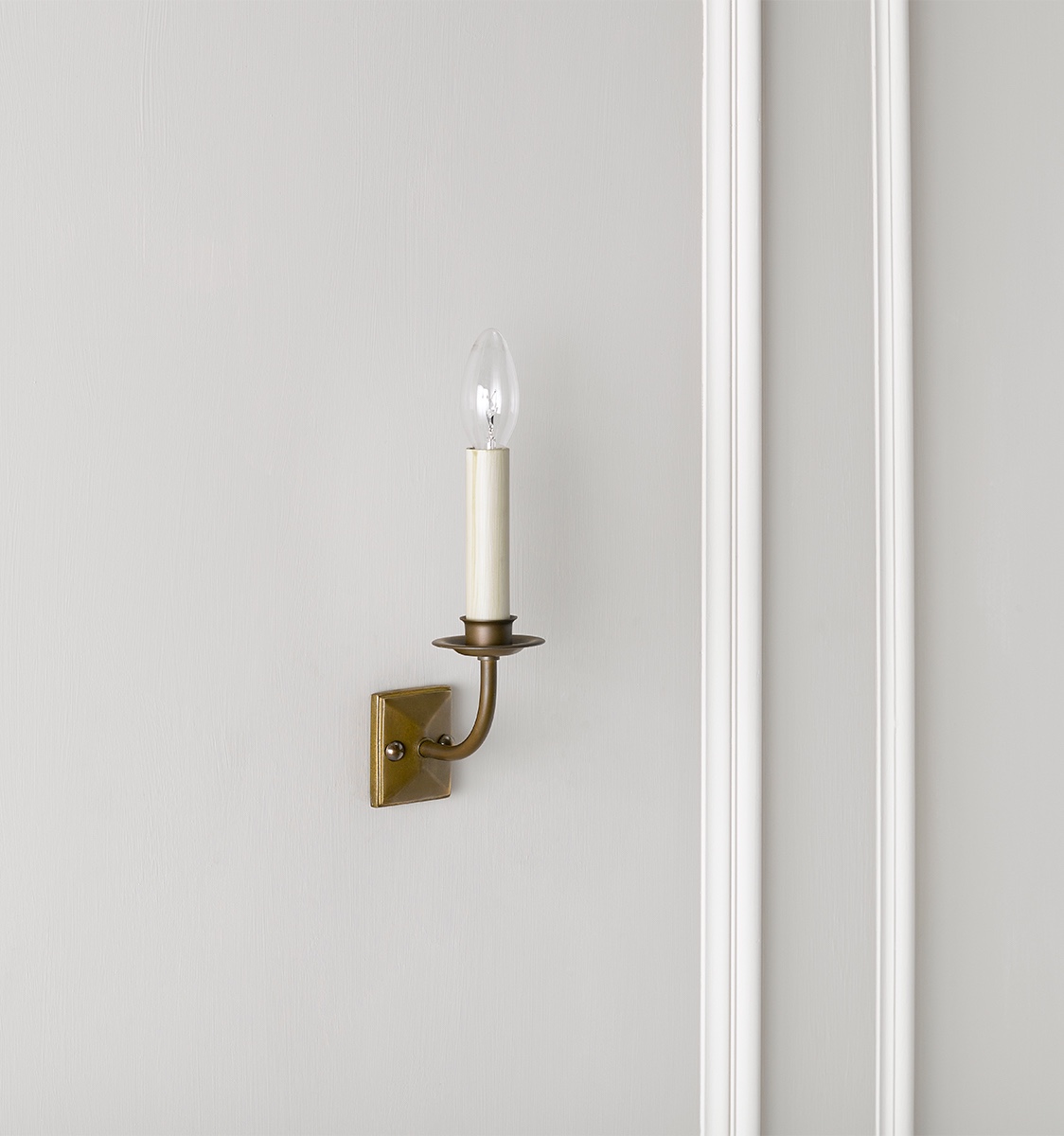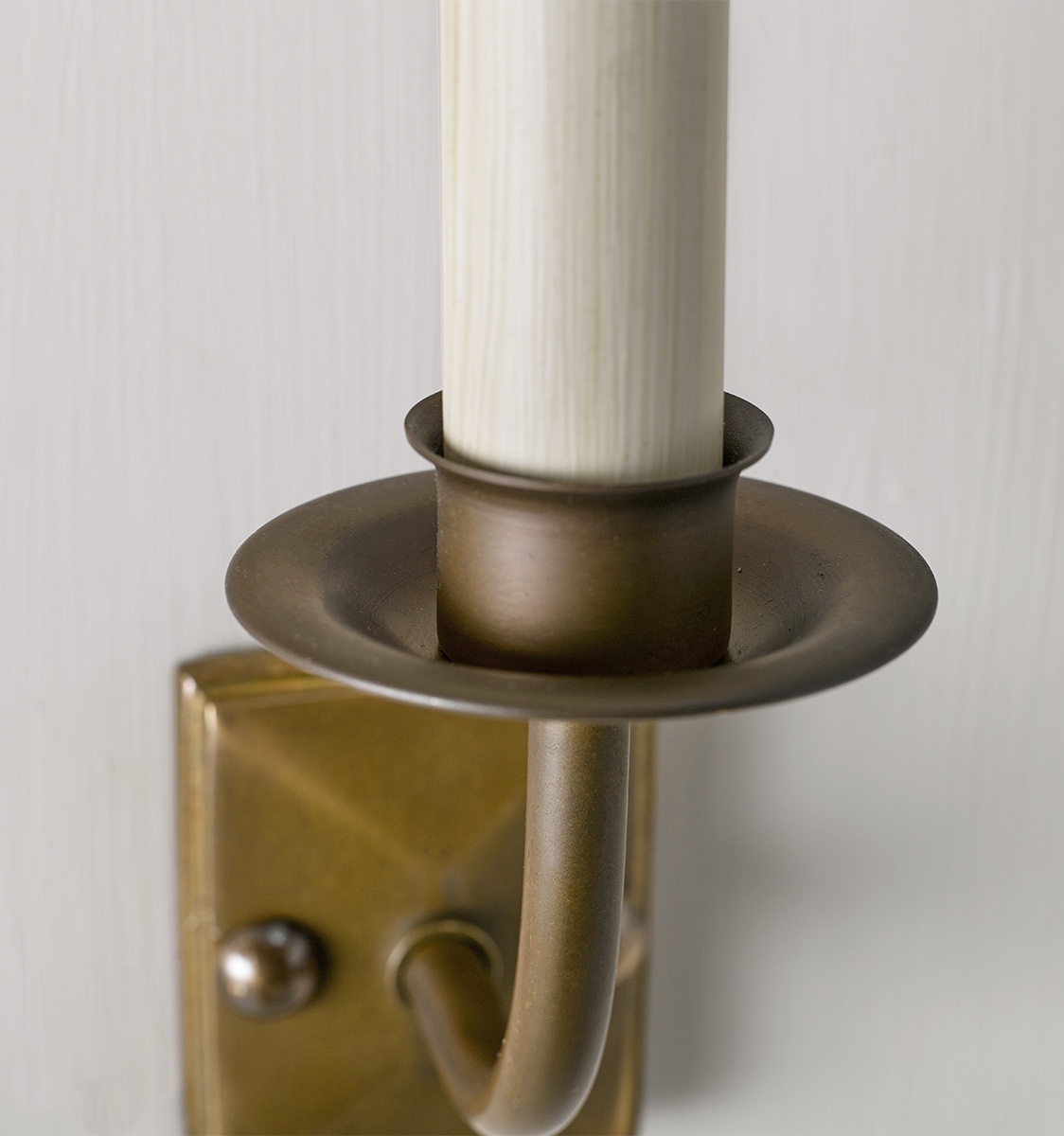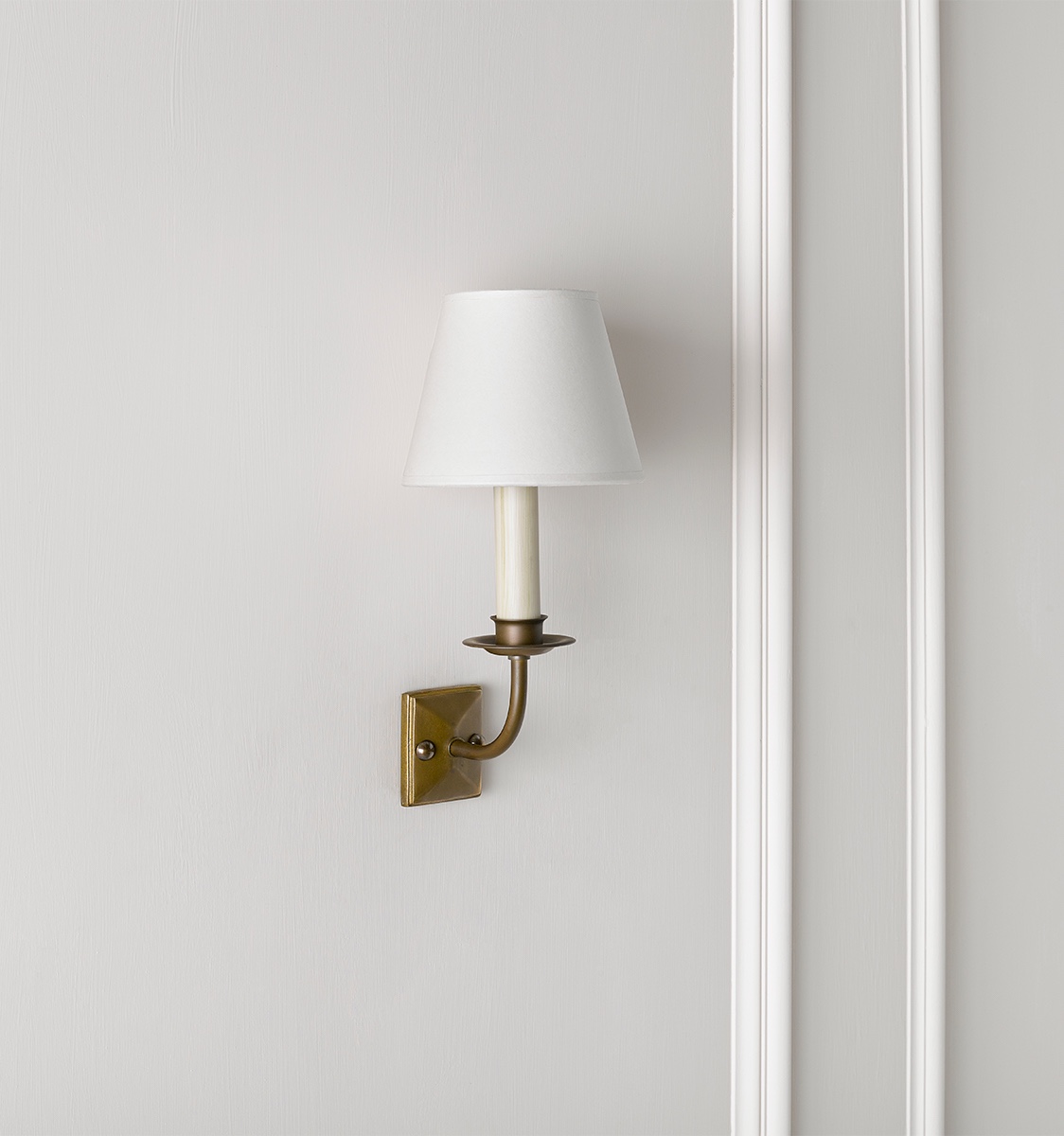 A simple yet classic wall light available in antique brass and antique silver. Shown here in an antique brass finish with a 5.5" candle clip card shade. Lampshades are sold separately, please visit our lampshade section.