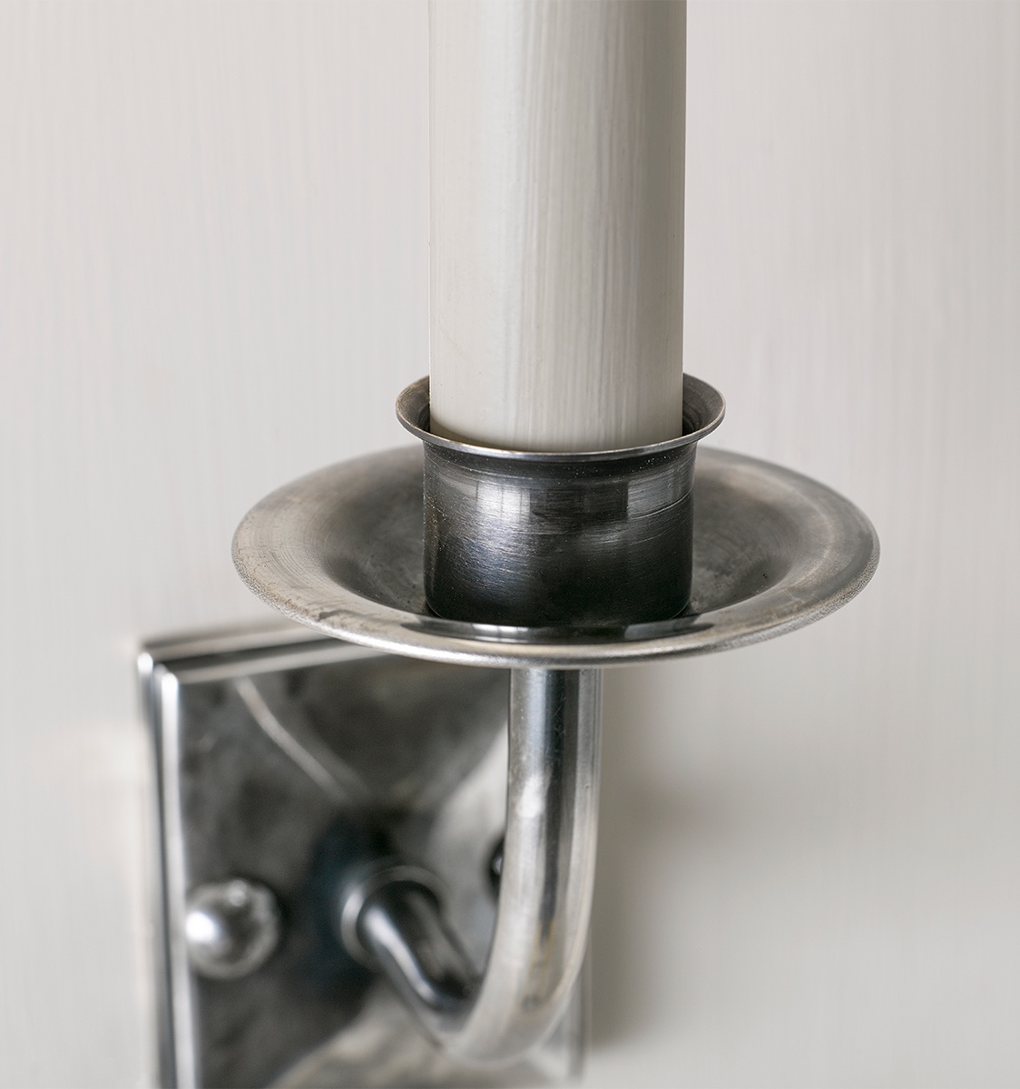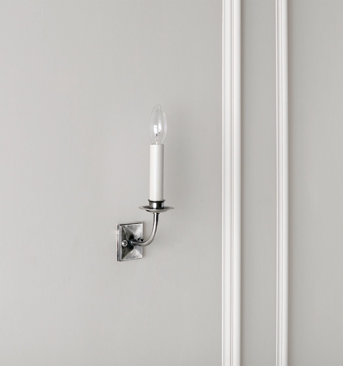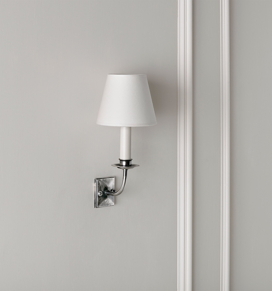 A simple yet classic wall light available in a range of finishes. Shown here in a silvered brass finish with a 5.5" candle clip card shade. Lampshades are sold separately, please visit our lampshade section.