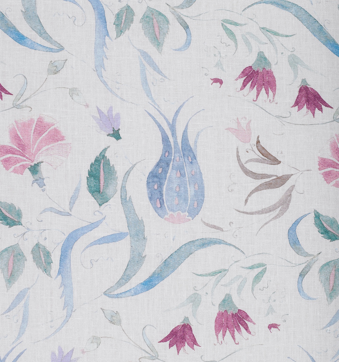 Originally a watercolour drawing, our in-house artist was inspired by the patterns on a Turkish Iznik tile. This fabric was created from the watercolour drawing, resulting in this colourful, repeating pattern.