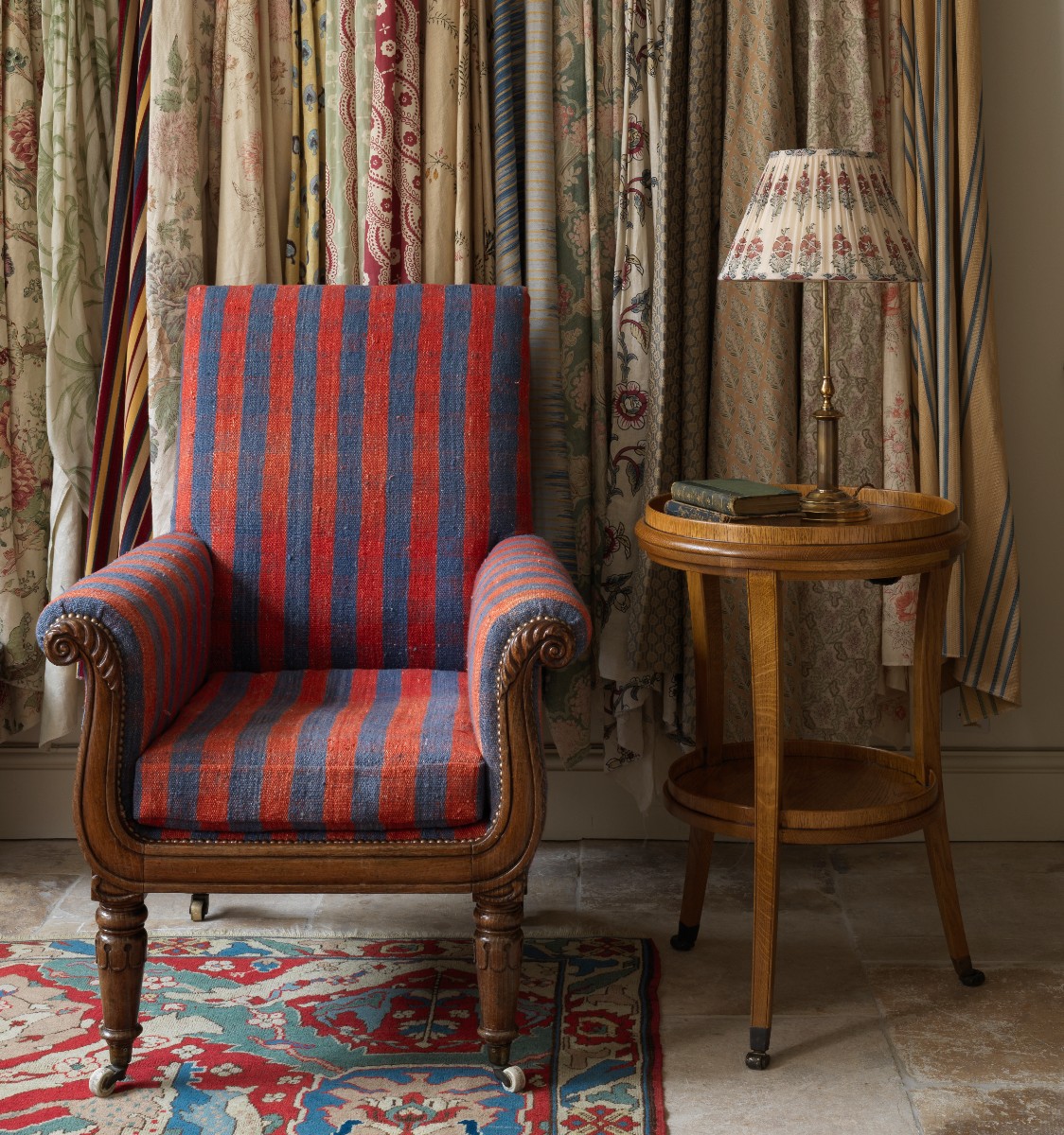 This fabric design was developed from an original fragment, found fluttering in a dusty Indian shop in Jaipur.