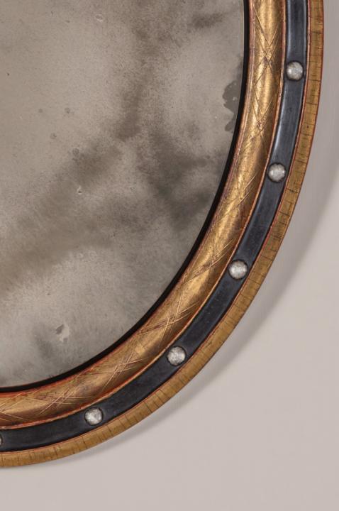 Irish oval mirrors grew in popularity in the late 18th Century when the Irish lead glass industry was at its peak and this ability to successfully access high quality glass was capitalised on following the opening of the Waterford factory in Ireland. The majority of mirrors made in that era were similar in style to the Drombeg mirror in their oval shape, and this is where we got our inspiration from. Stylistically, these Irish mirrors take inspiration from the Regency oval and circular mirrors being made in England at this point, with gilt gesso frames, fluted or plain ebonised slips and applied gilt spheres.
