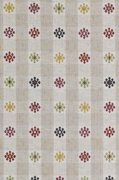 This is one of our Kandillis - and Kandilli is where they do block prints, wonderful patterns, in Turkey. Bergama has very lovely colours together and makes the most beautiful curtains; I like curtains that are 1.5 widths together, rarely more - so that you can see the pattern. If curtains in fabrics of this size pattern are too full, the pattern is lost and this has such a nice one. We do it on 2 backcloths, the Bastian linen, and a lighter linen and it is very different based on that detail alone.