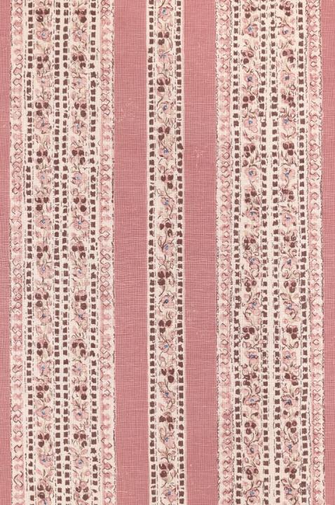 We actually had the panel first, taken from an 18th C Turkish document, and we designed Ashoka to be sold individually - the pink is good, not too pale. We then decided to make Ashoka Stripe from the border on the panel. The panel is excellent on a bed or wall and the stripe as upholstery or mixing with antiques. I wouldn’t falter to put this in a panelled study or a light drawing room, the pink has a depth to it.